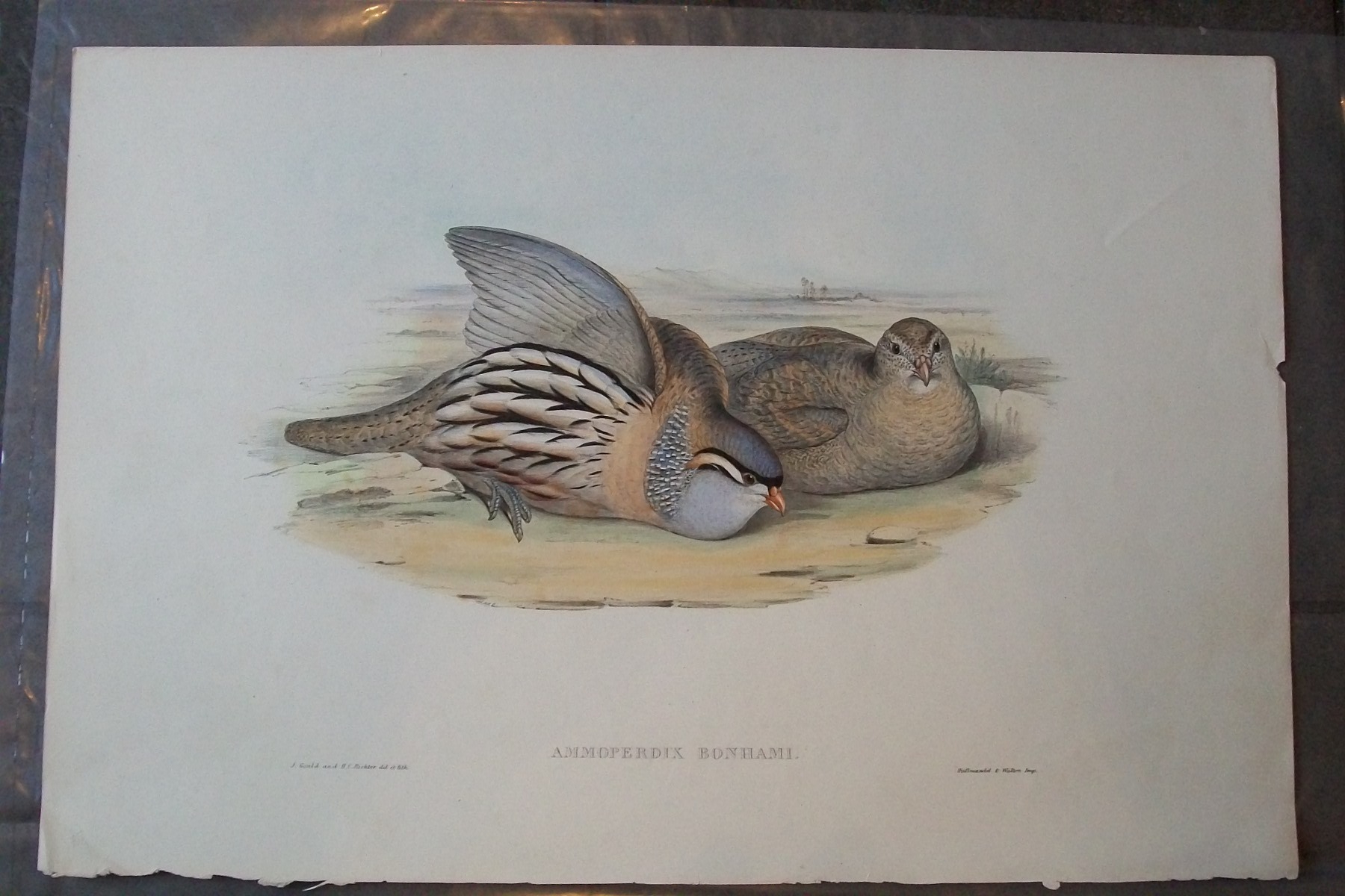 John Gould - Original lithograph of the Asiatic Sand Partridge 1849-83. This original lithograph of Bonham's Sand Partridge or the Asiatic Sand Partridge (Ammoperdix bonhami) is from John Gould's, Birds of Asia issued in 35 parts between 1849 and 1883, the last three being issued after Gould's death in 1881 by Bowdler-Sharpe.The print was drawn and lithographed by John Gould and HC Richter.