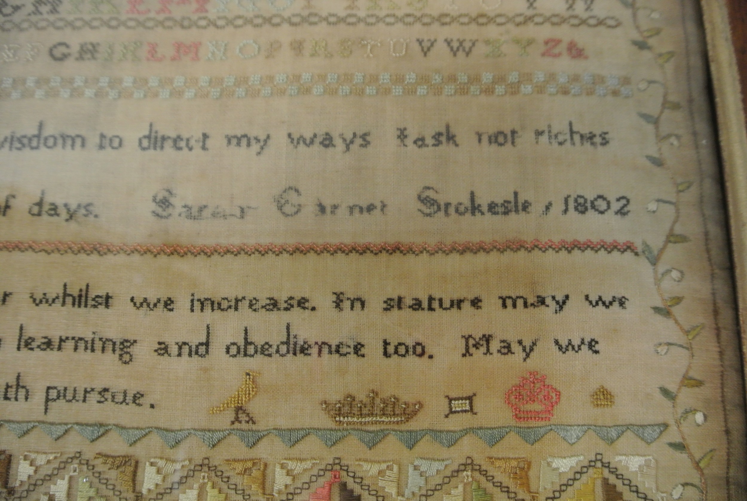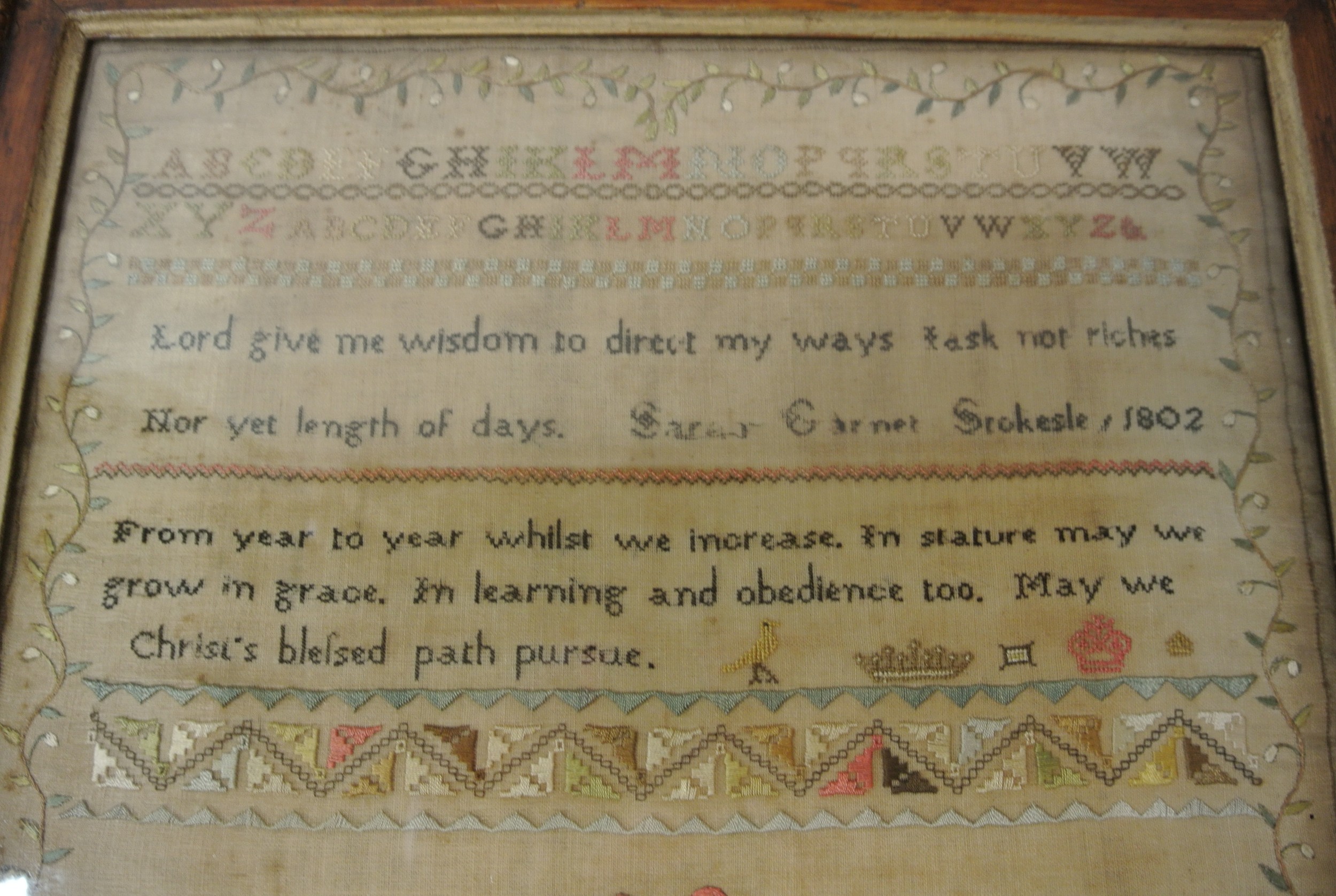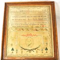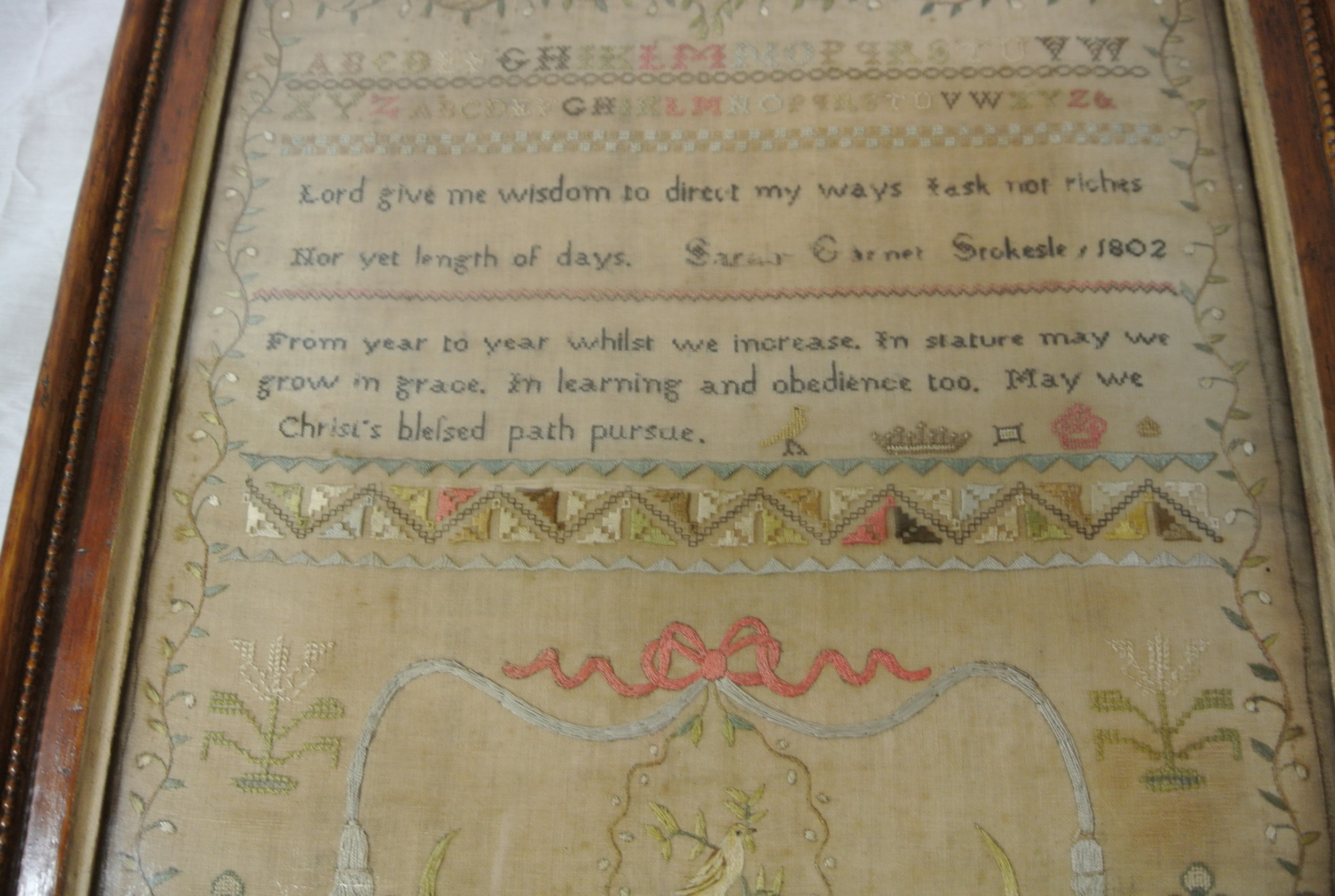 Framed sampler by Sarah Elgie Garnett, Srokesle 1802 renovated 1999-2000 Charles John Potter, 40x35cm