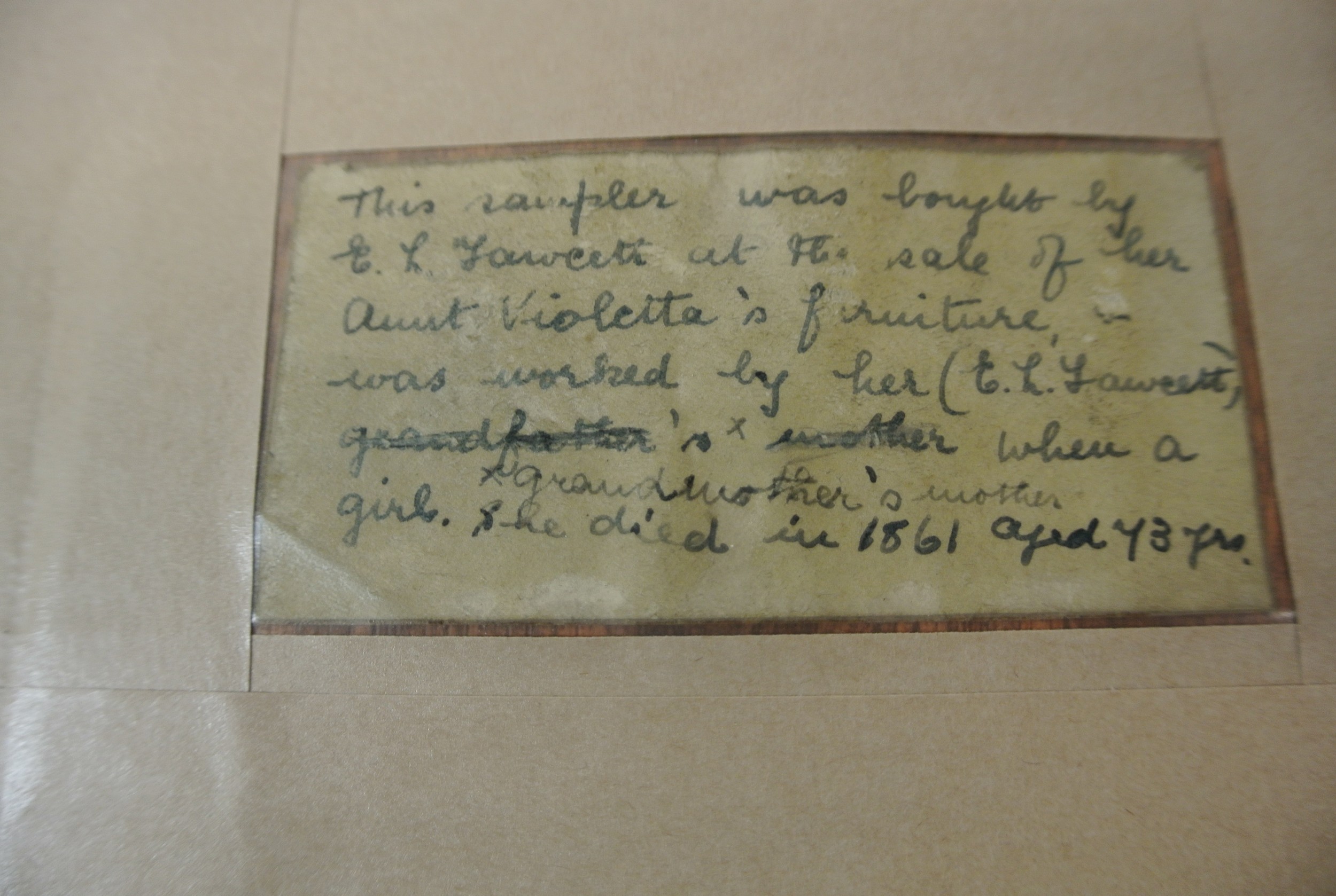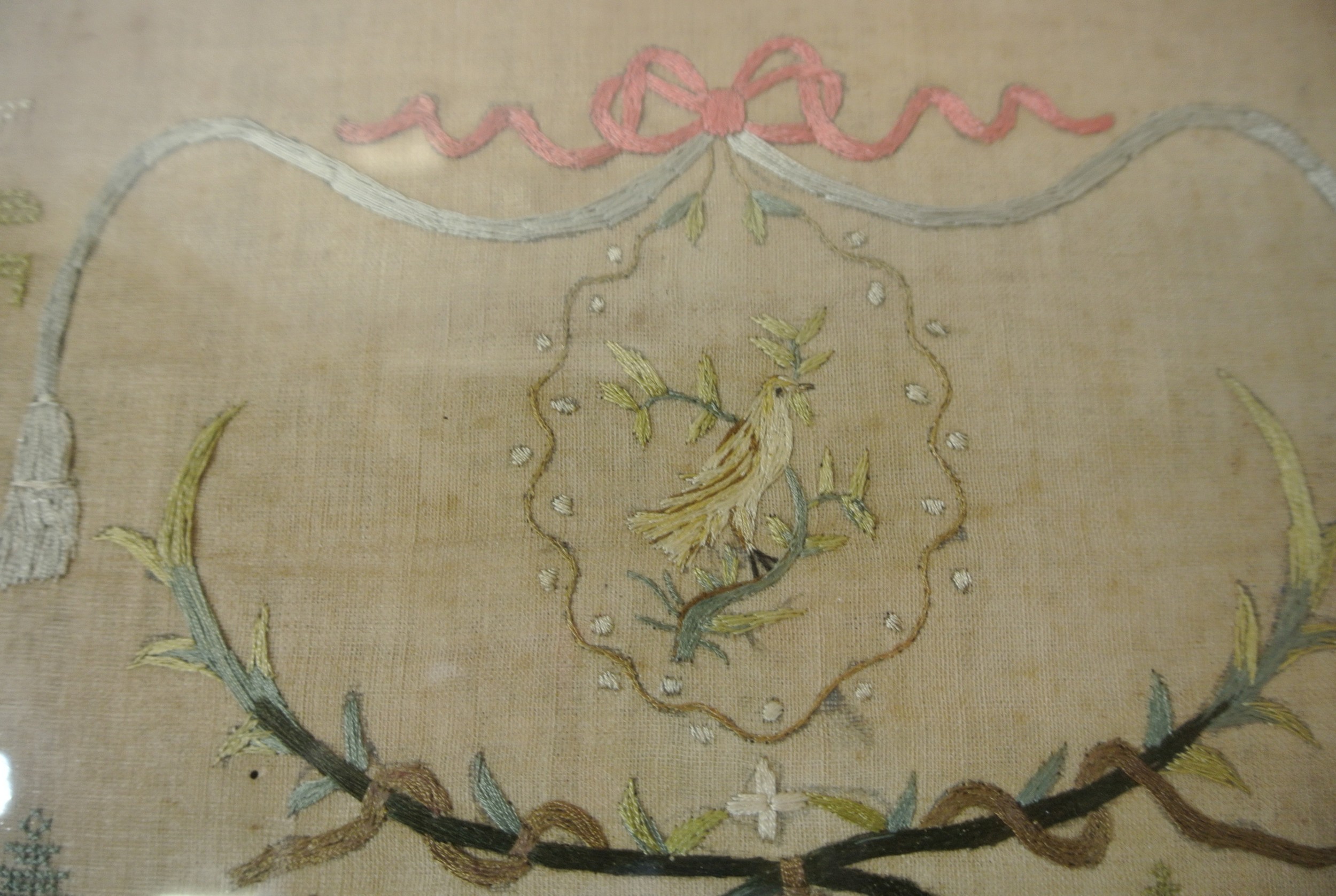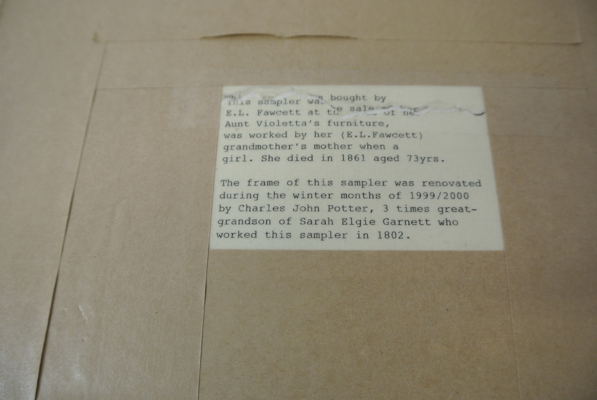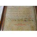 Framed sampler by Sarah Elgie Garnett, Srokesle 1802 renovated 1999-2000 Charles John Potter, 40x35cm