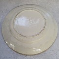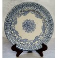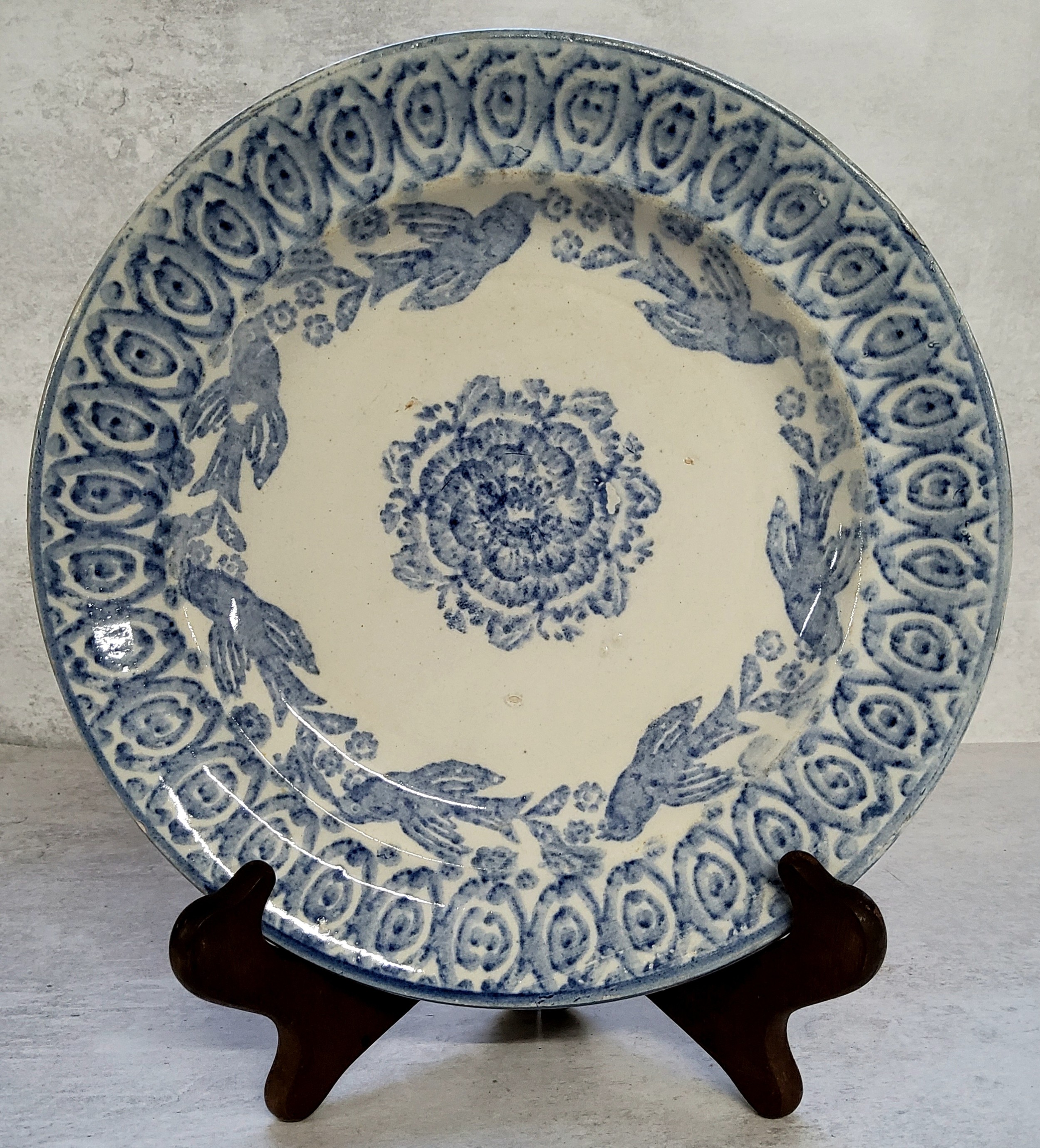 An 18th century Staffordshire creamware plate handpainted with a blue border to rim, birds in flight and a stylised flower to centre