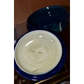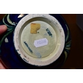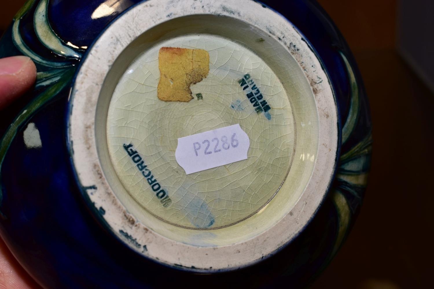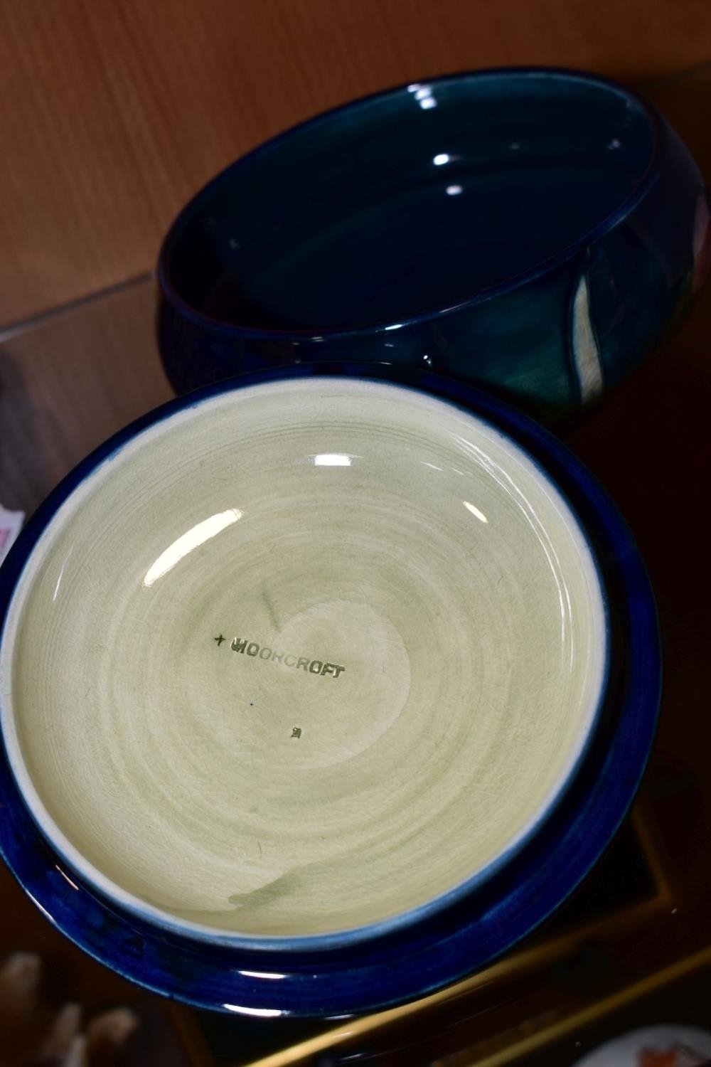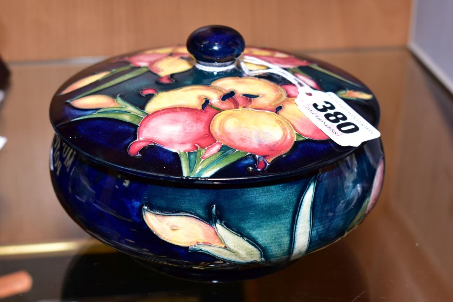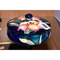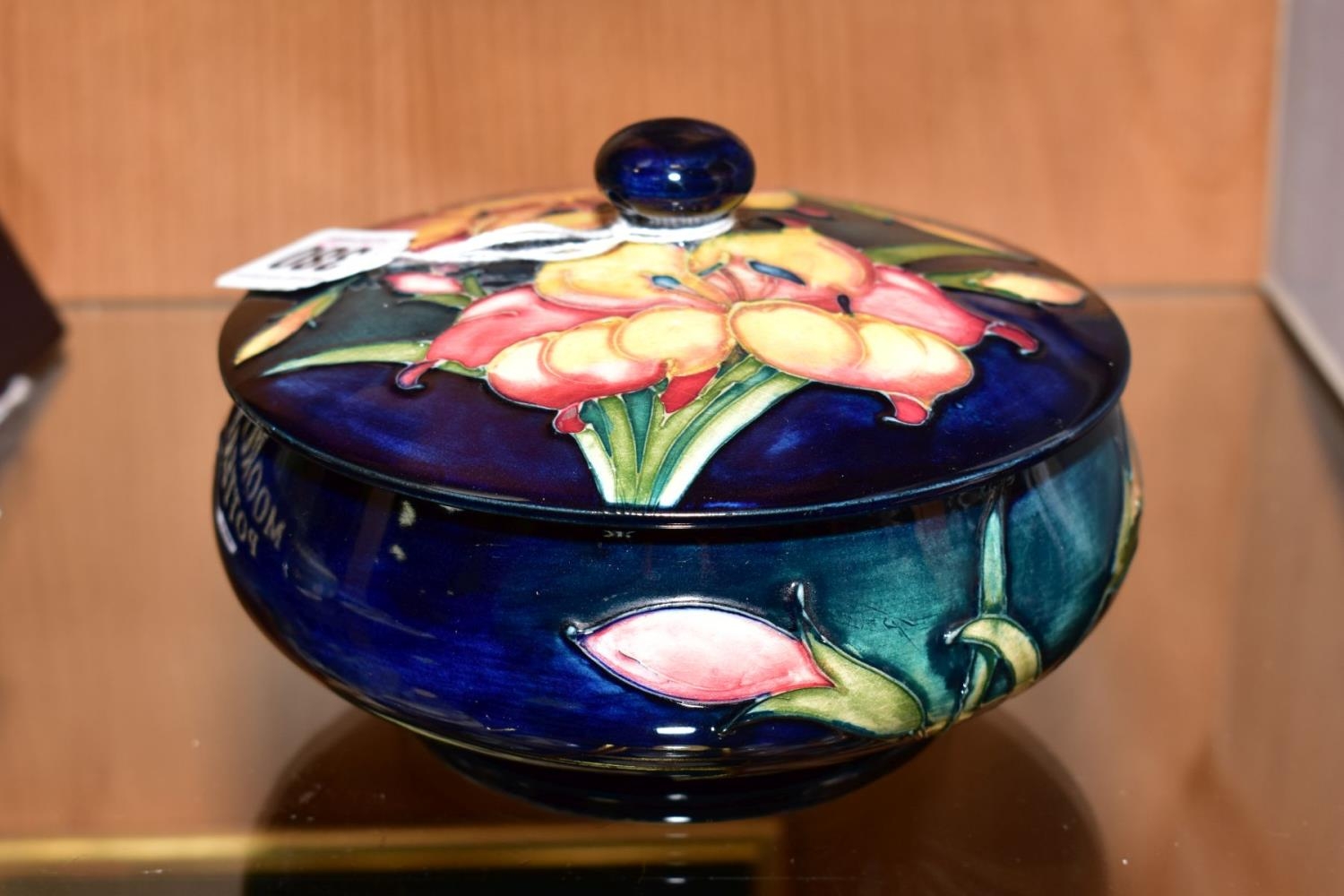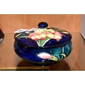 A MOORCROFT POTTERY POWDER BOWL AND COVER, 'Freesia' pattern on blue ground, impressed backstamp to base and cover, diameter 14cm