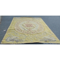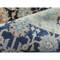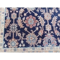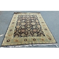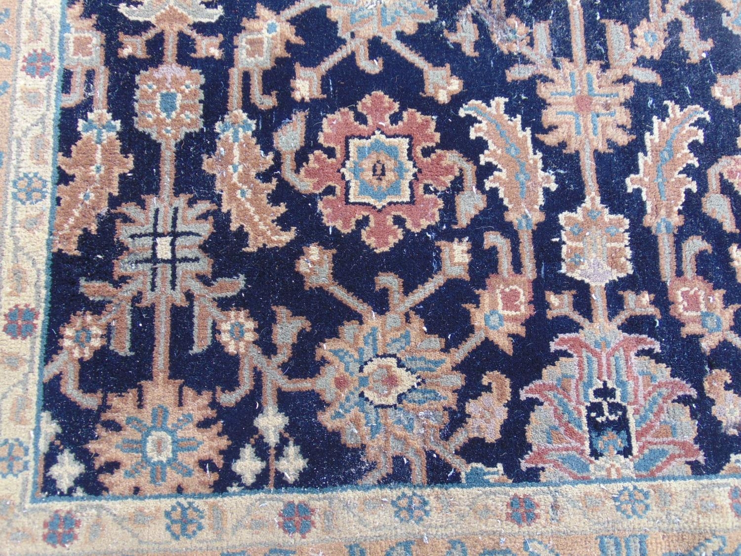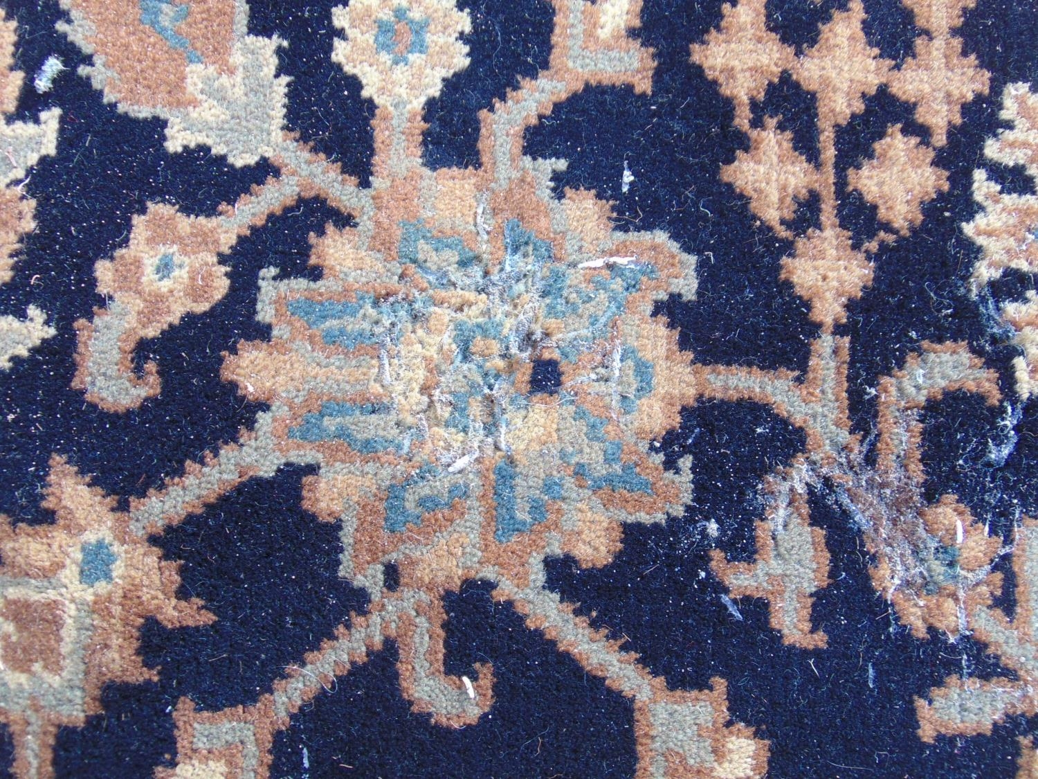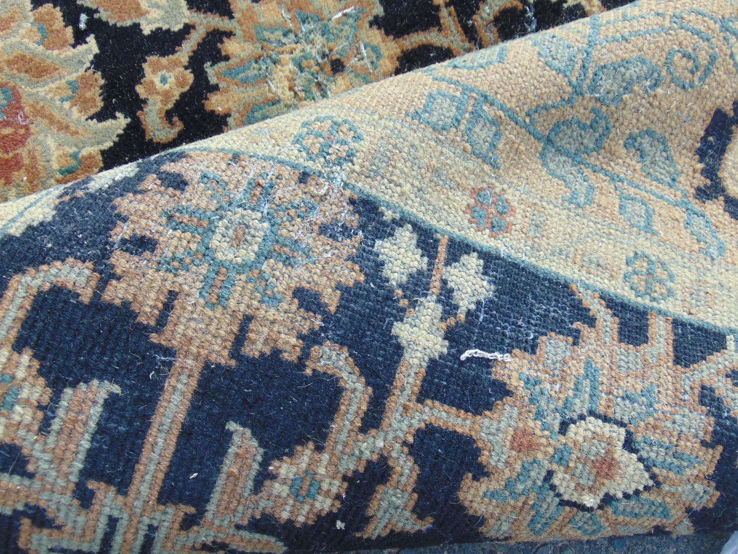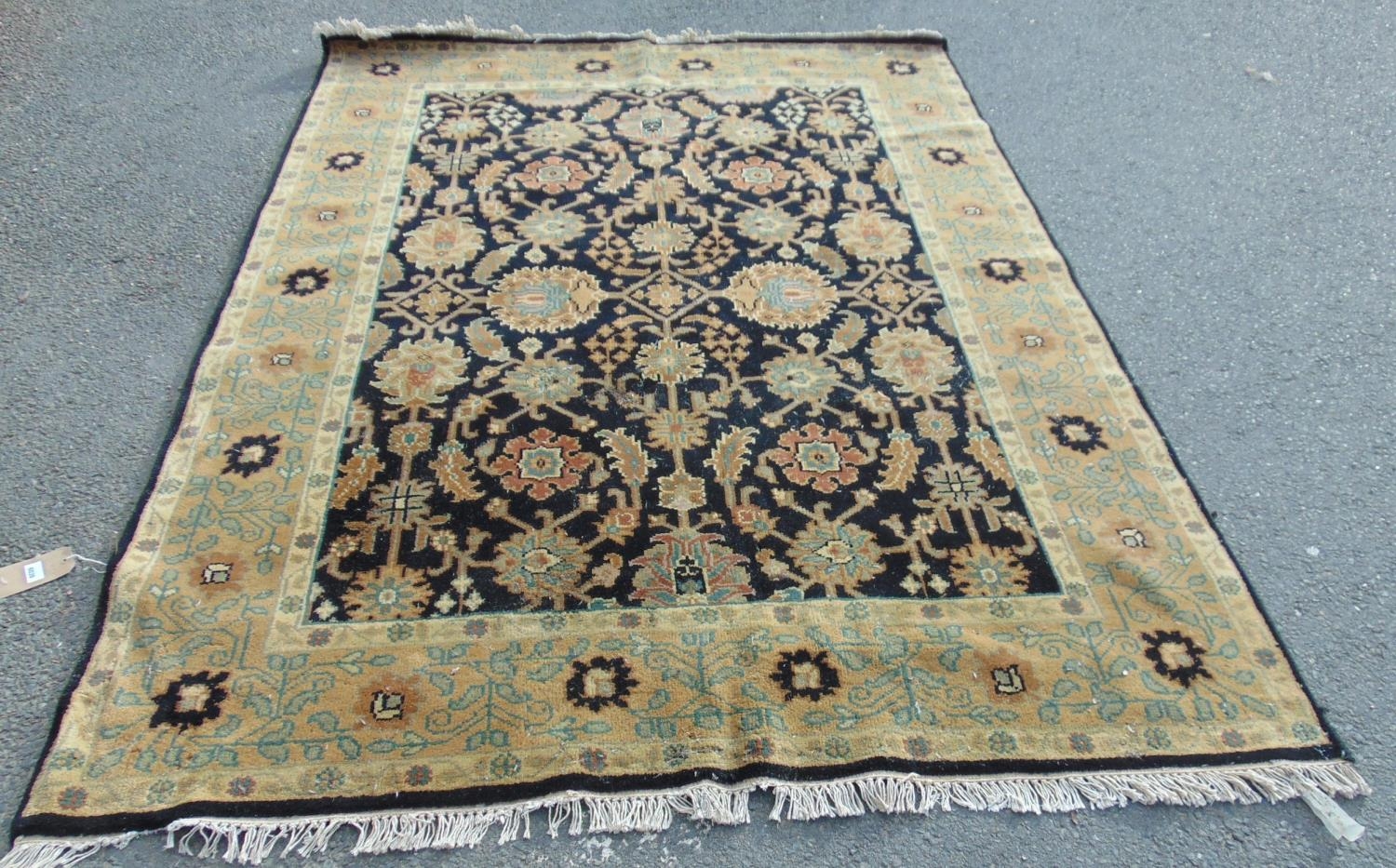 A Persian design carpet with a large floral pattern on a black ground (as found, moth damage), 235 cm x 168 cm approx