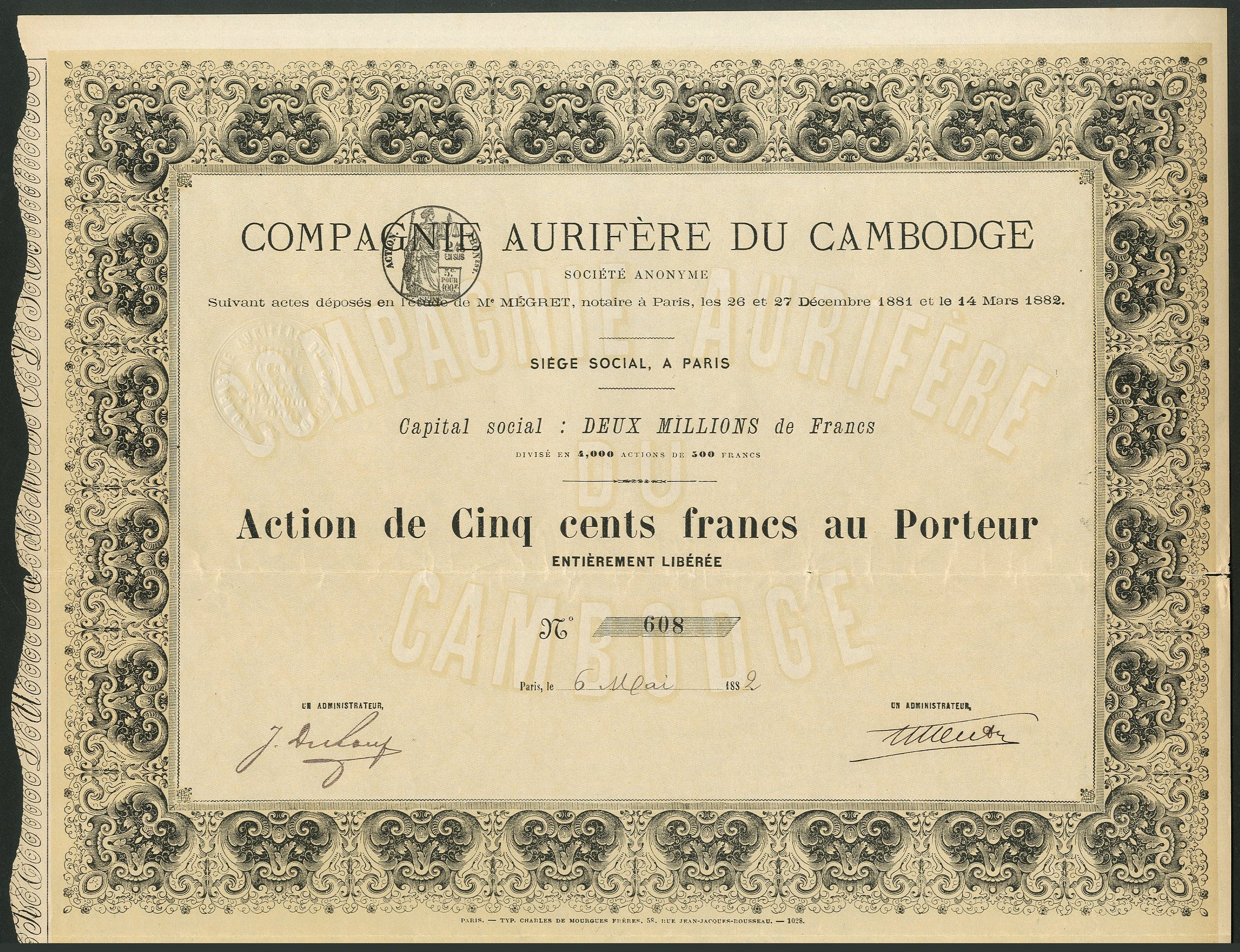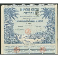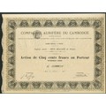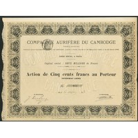 French Indochina: Compagnie Aurifère du Cambodge, 500 franc share, Paris 188[2], #608, black with yellow underprint, with coupons. Slight splitting at end of fold otherwise AEF and scarce.