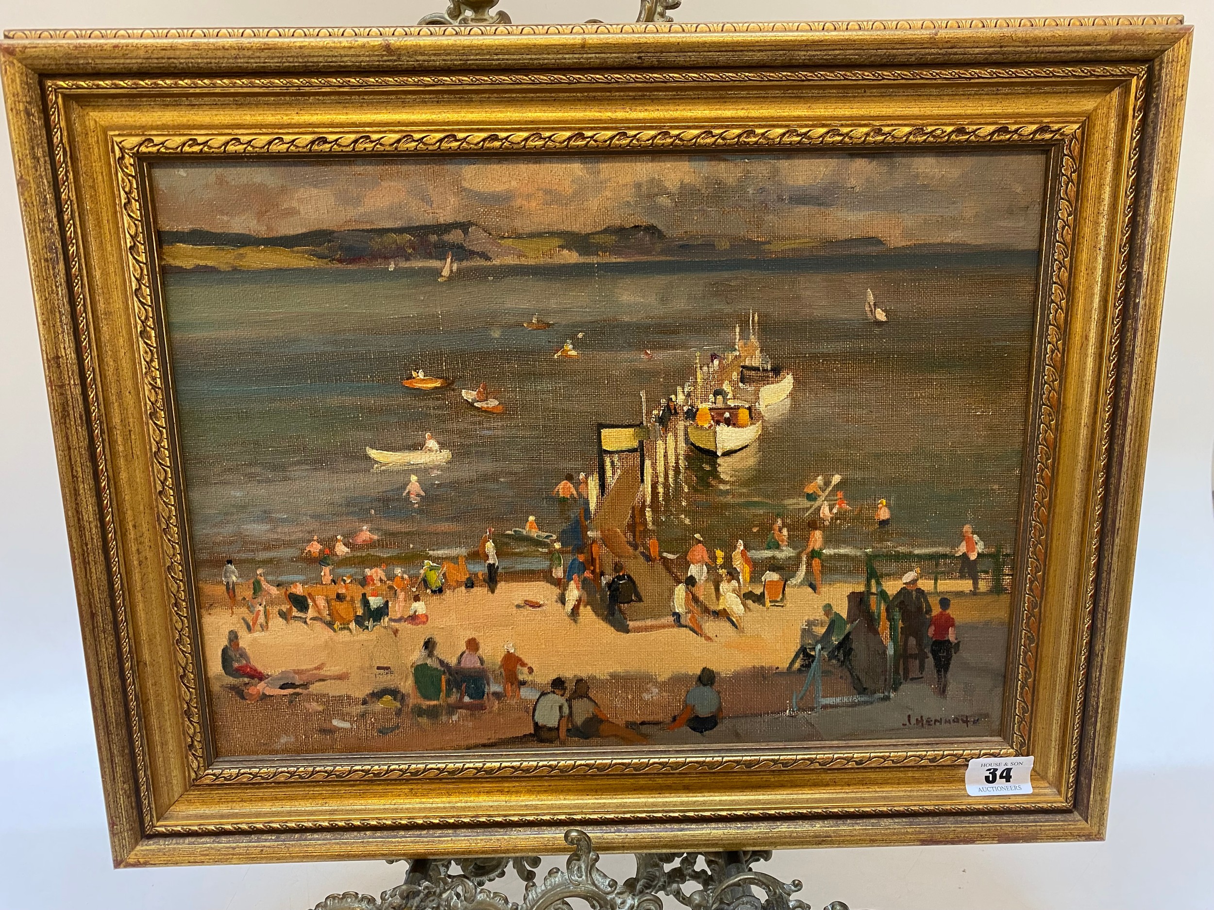 Joseph Hennah 1934. A signed oils on canvas laid on board - Weymouth Beach, framed - 10 1/2in. x 14 3/4in.