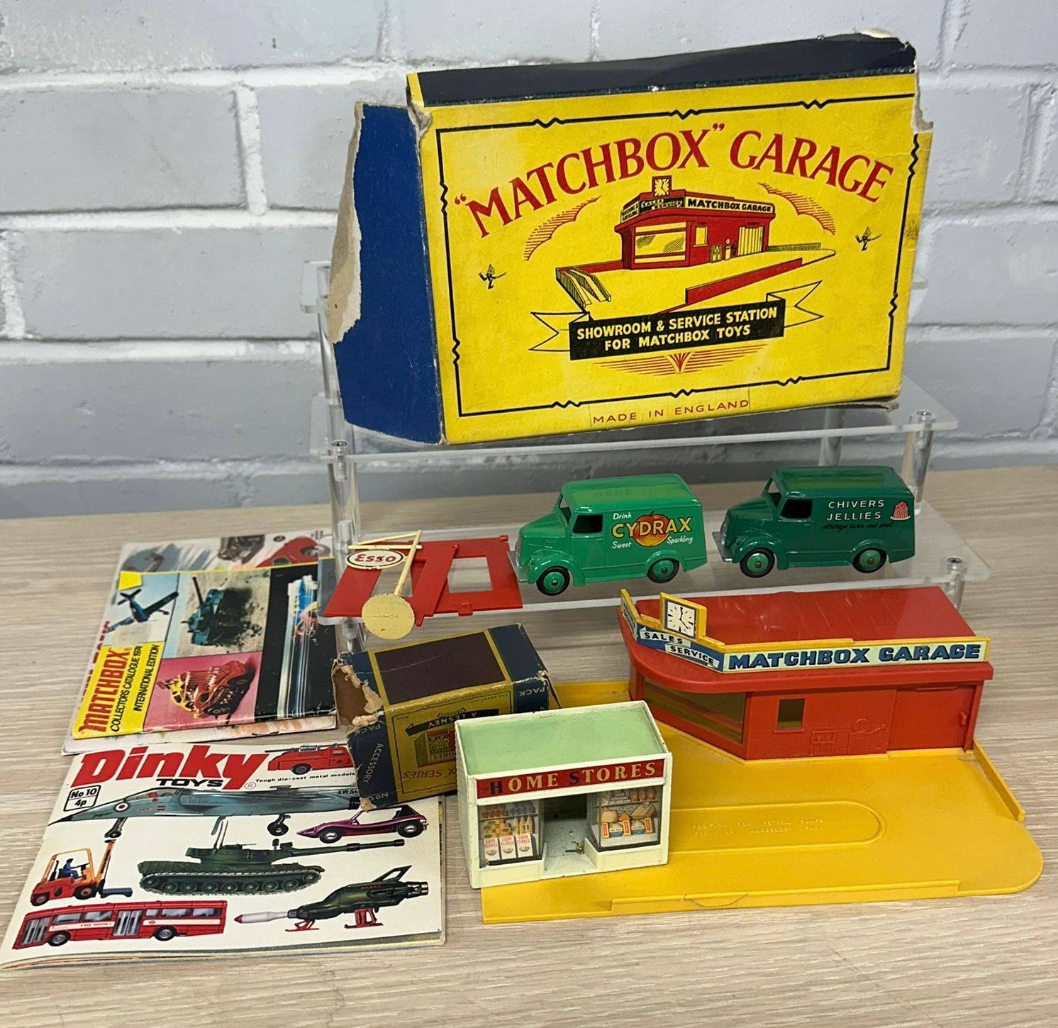 Matchbox garage together with a matchbox home store, loose dinky magazines etc