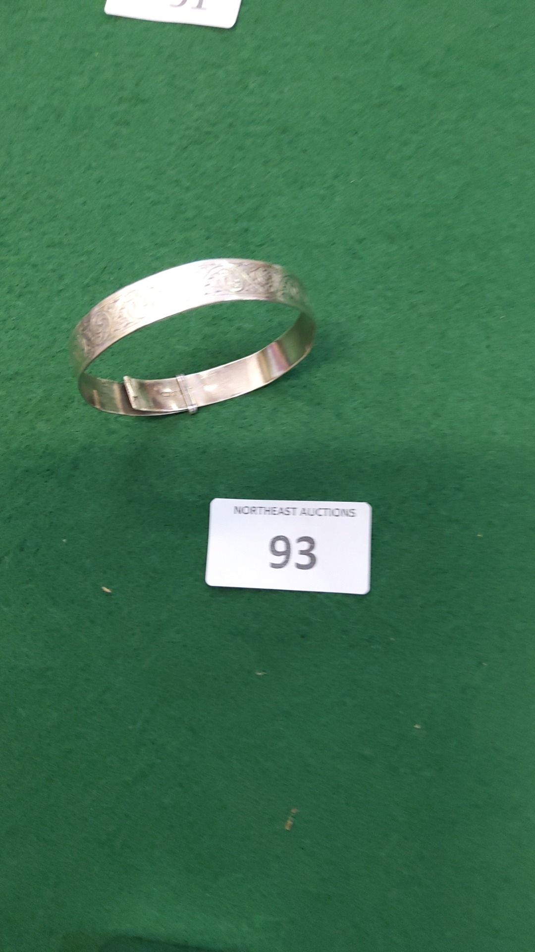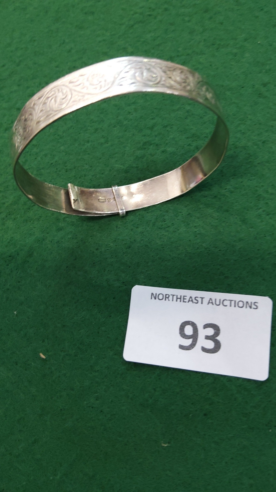 Hinged sterling silver bangle bracelet, the exterior chased with continuous foliate scrolls, stamped 925 to interior.