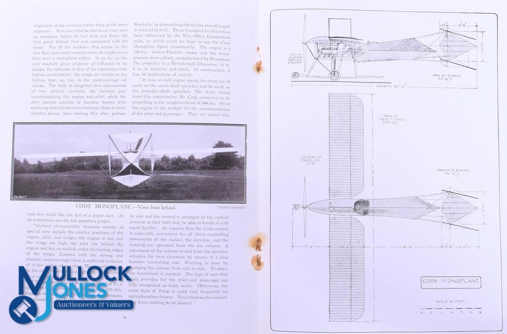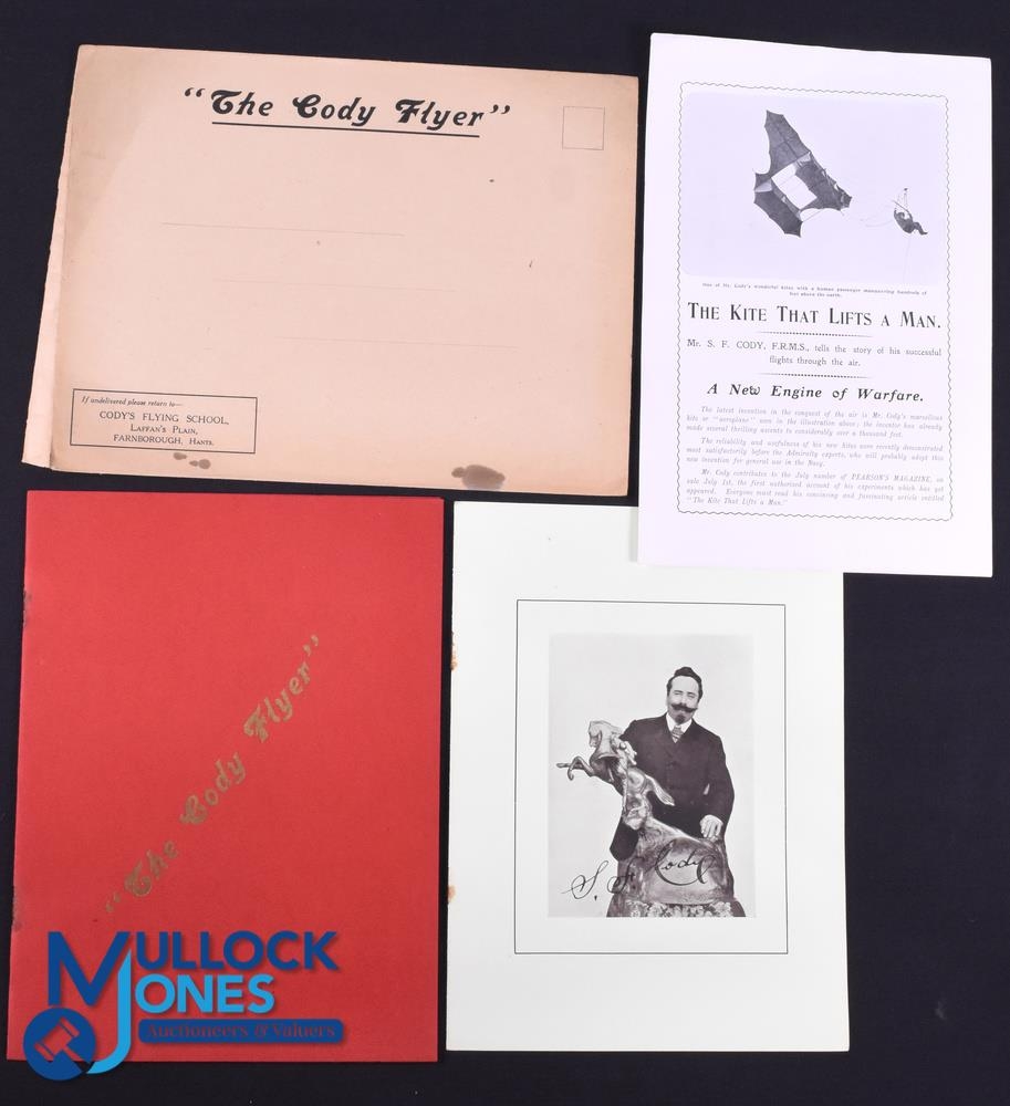 Aviation (3) - The Cody Flyer c1911-12 Catalogue - 12 page sales catalogue illustrating the aircraft and detailing three different models of this machine with prices ranging from 750 pounds to 1,800 pounds, also illustrating and detailing Mr S F Cody's new Monoplane and advertising his War (observation) Kite showing Mrs Cody flying it. With 8 aircraft photographs and one full page scale drawing, in gold printed red card cover size 7 1/2" x 10", plus its original printed brown envelope from Cody's Flying School at Farnborough, also another 8 page illustrated catalogue. Plus an illustrated handbill of a man carrying Kite. Very interesting publication with also full page photograph of Cody who was the first man to fly in an Aeroplane in England. He flew at Hendon a lot and other air shows. In as new condition (3)