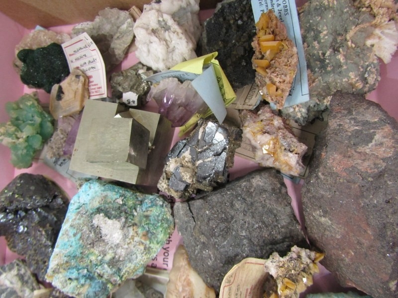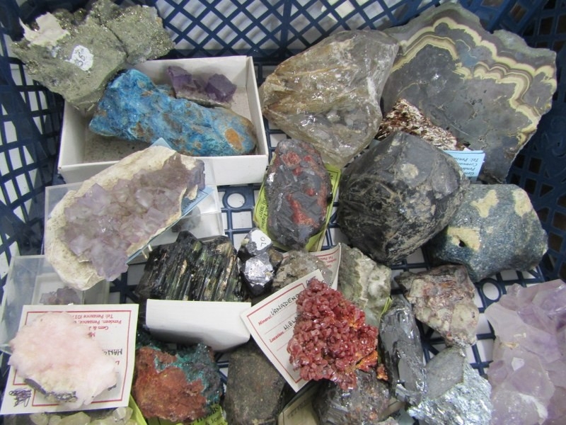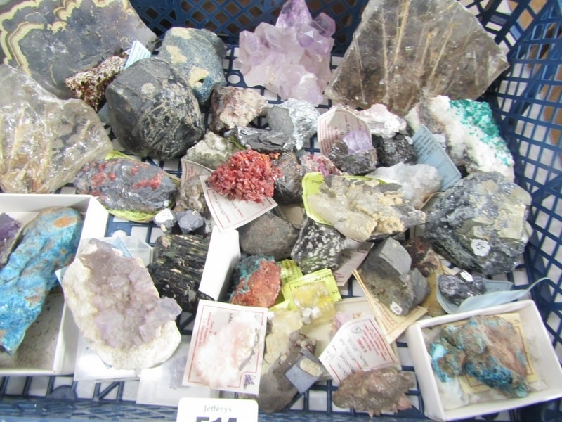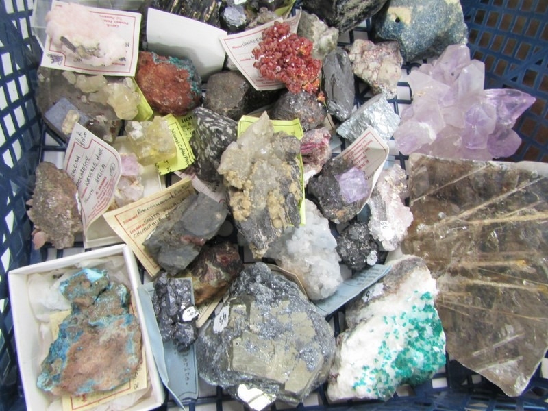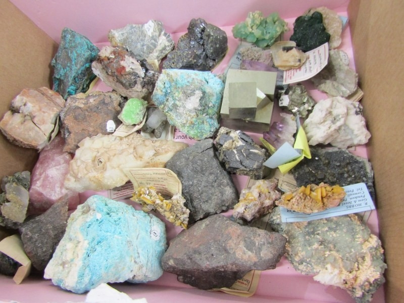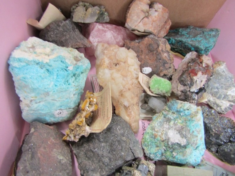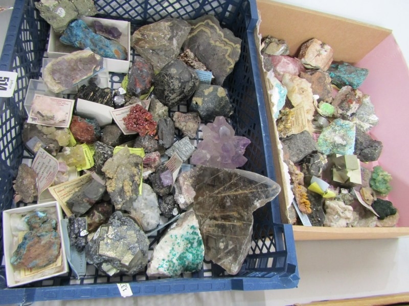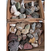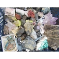 UNCUT MINERALS, 2 boxes of various uncut minerals to include amethysts, calcian and other examples