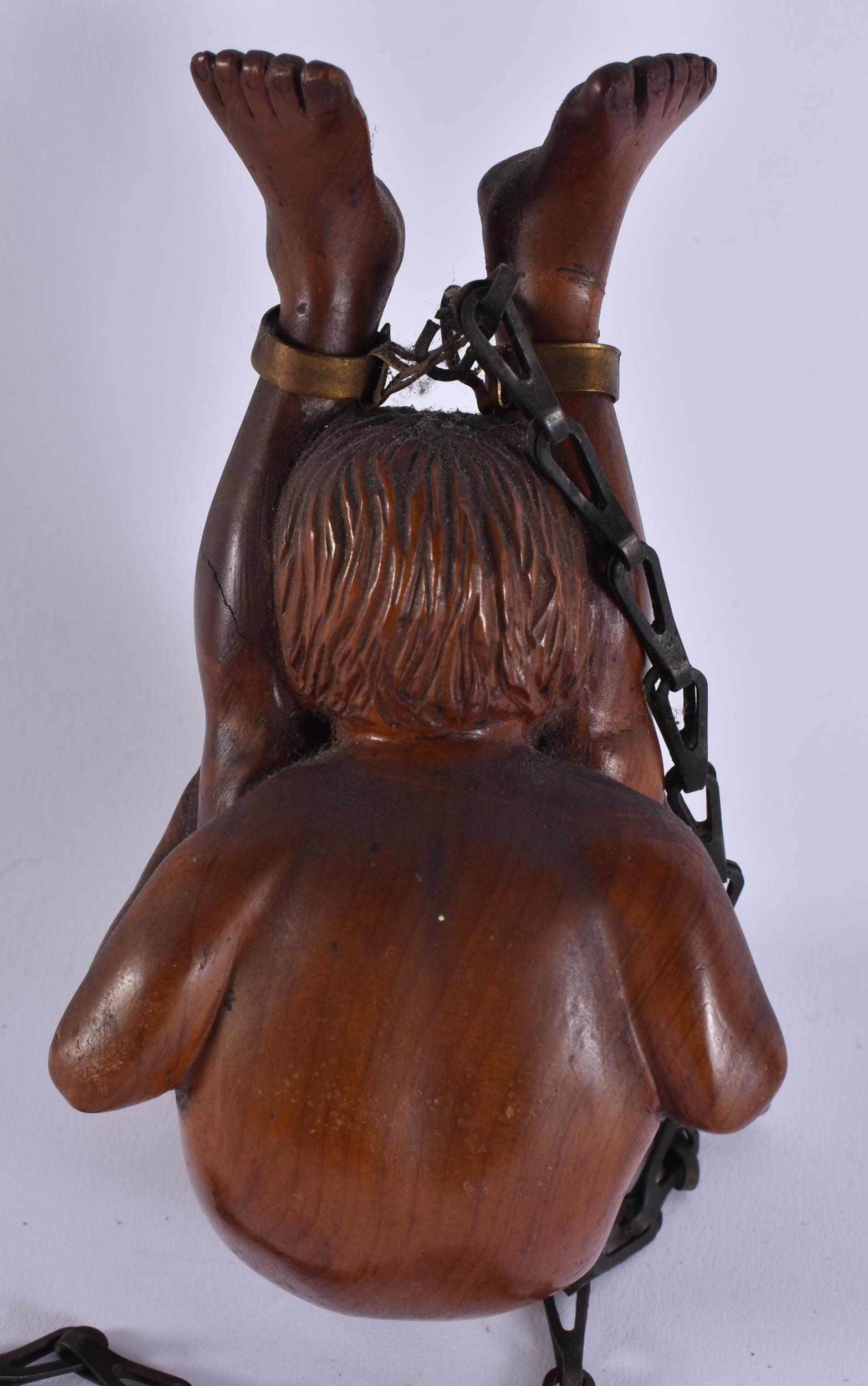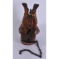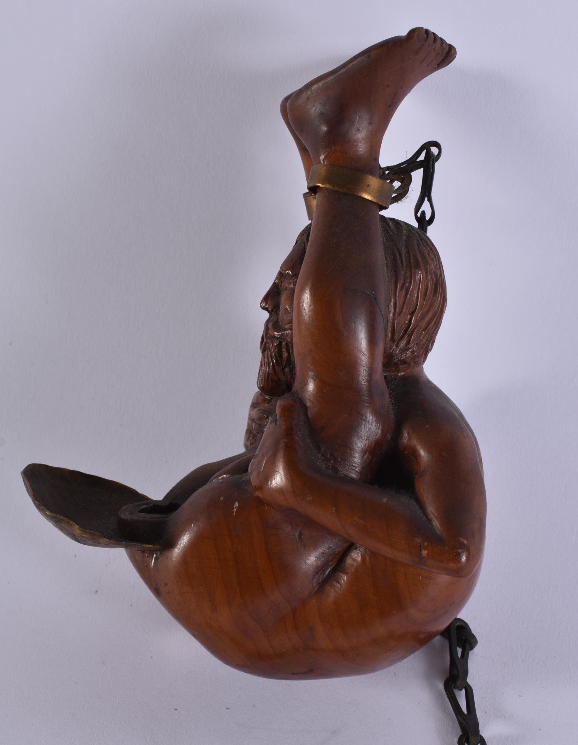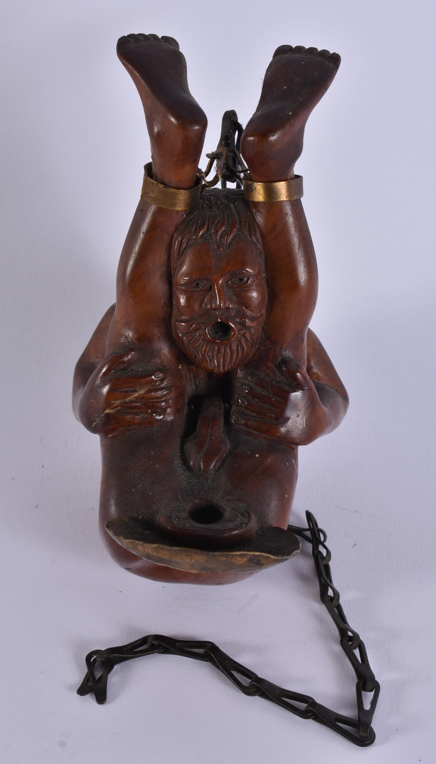 A RARE EARLY 20TH CENTURY EROTIC CARVED WOOD TREEN HANGING OIL BURNER. 15 cm x 8 cm.