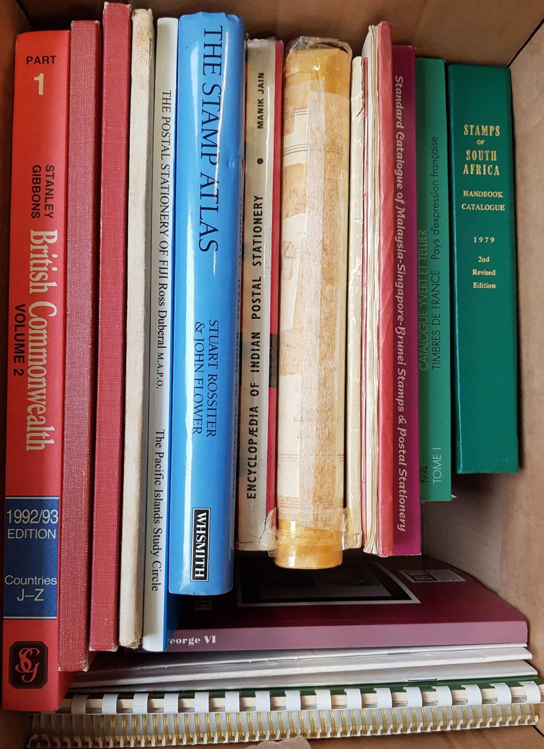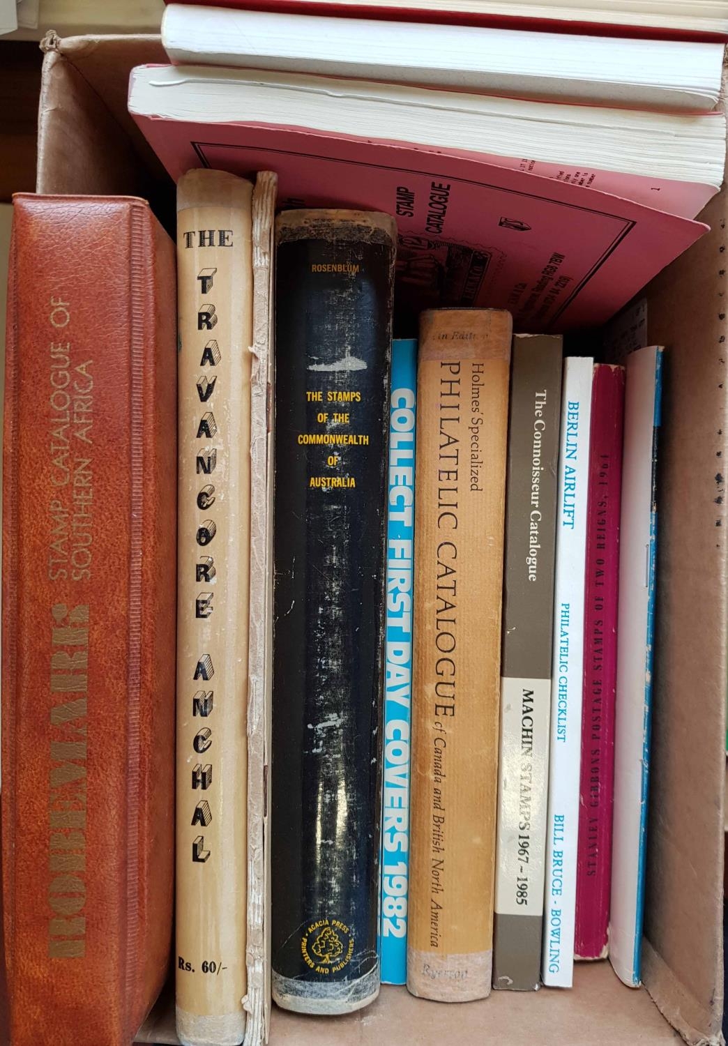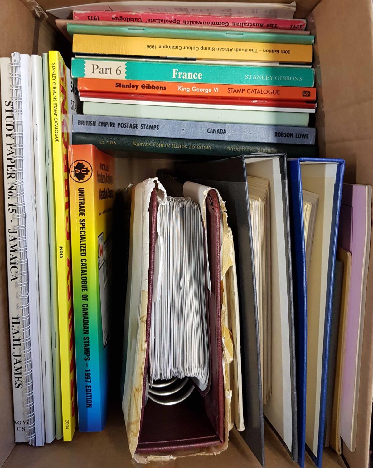 BRITISH COMMONWEALTH: Range in 7 cartons inc. Bermuda King George VI High Values (1980), Stamps of the Union of South Africa (1986), Unissued Stamps of King George VI (2001) Union 3s Booklets (1948) India Used in Burma (1950) The Travancore Anchal (1973) A Study of the Hong Kong Definitive Adhesives of King George VI (1992) A Study of the King George VI Stamps of St Kitts-Nevis 1938-50 (1997), range of Campbell-Patterson Newsletters (New Zealand) and others, plus range of accessories, mounts etc.