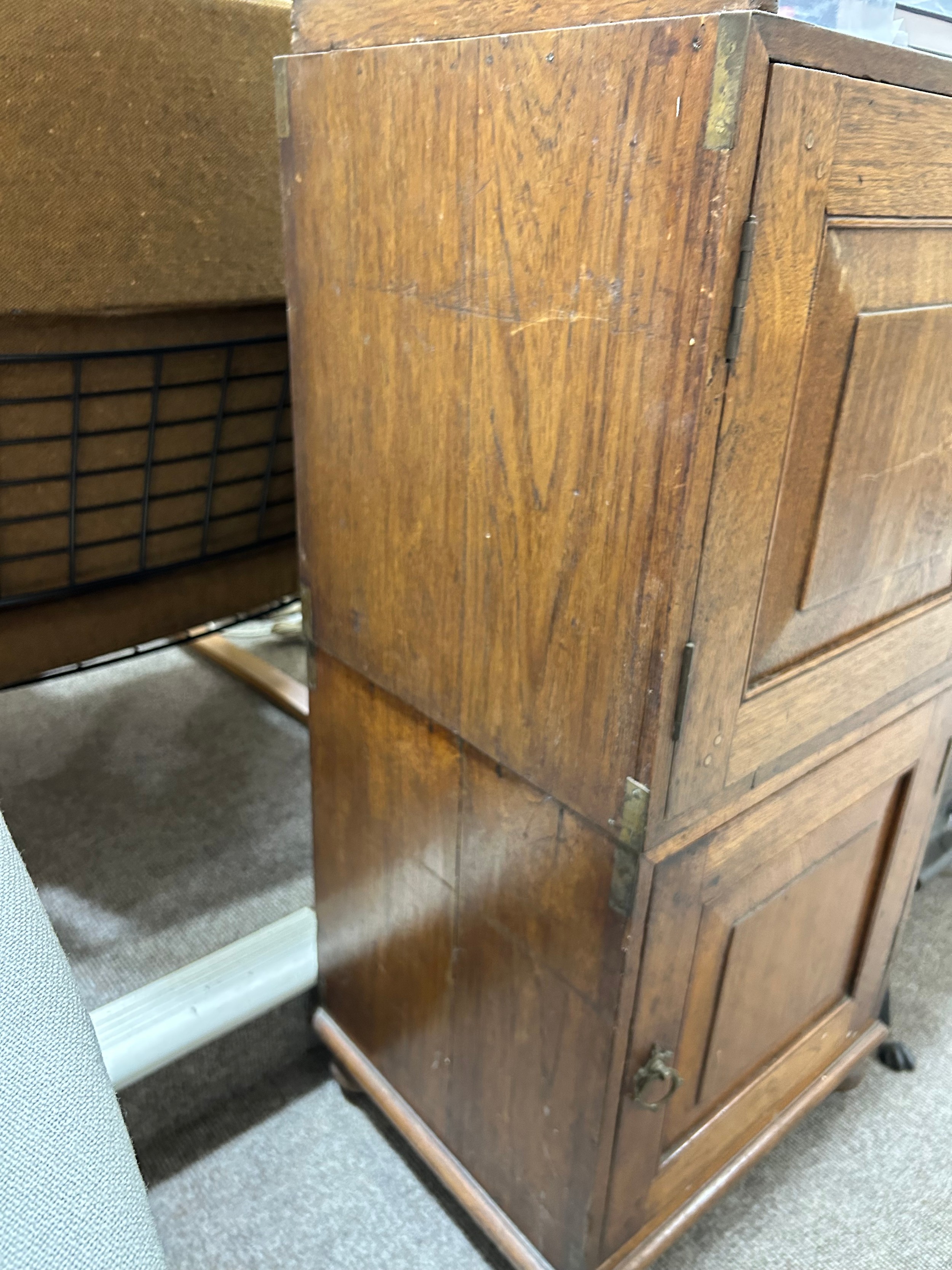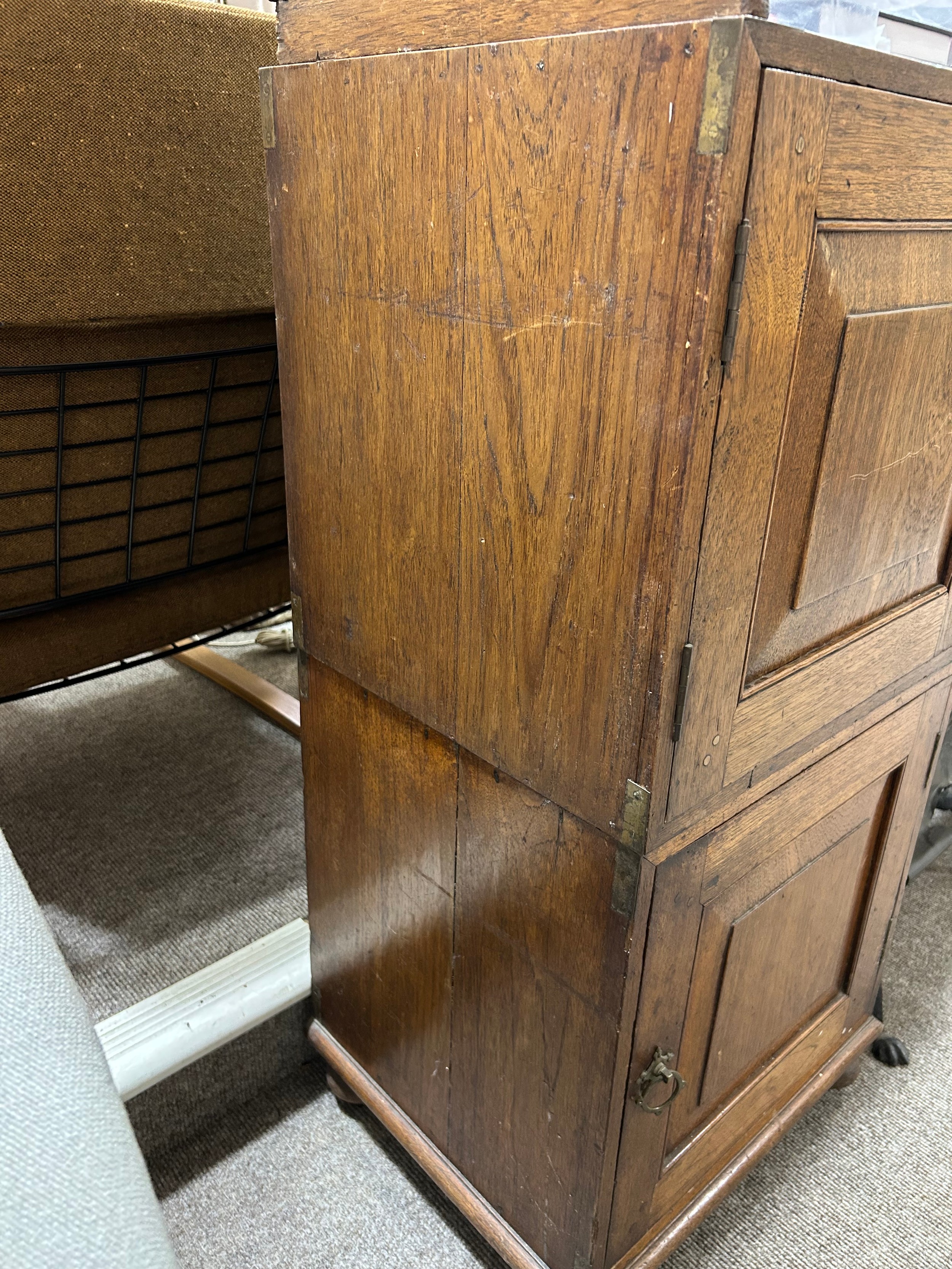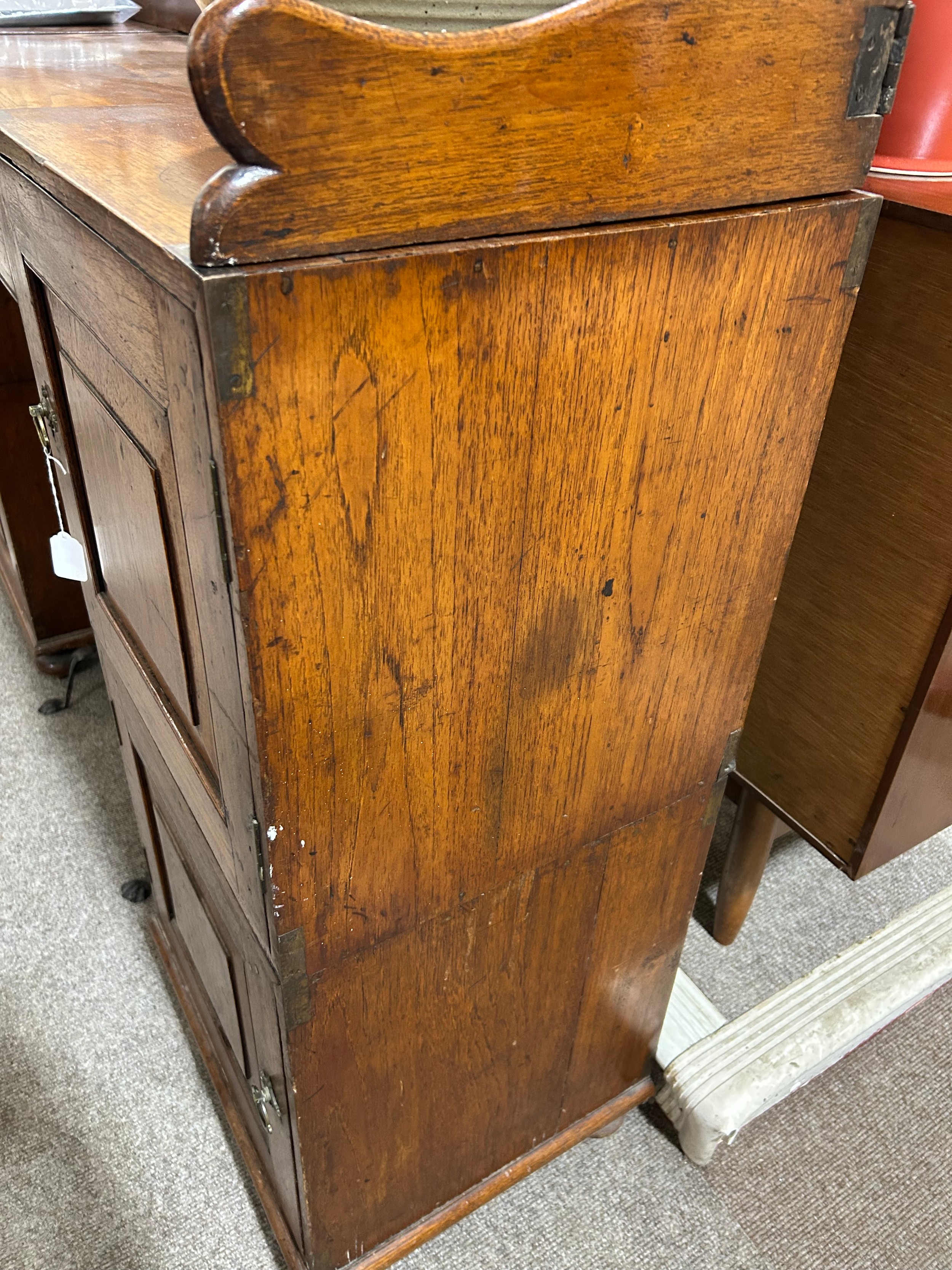 A 19th century teak campaign sideboard, separating into multiple sections, with brass-bound corners and folding 4-section gallery