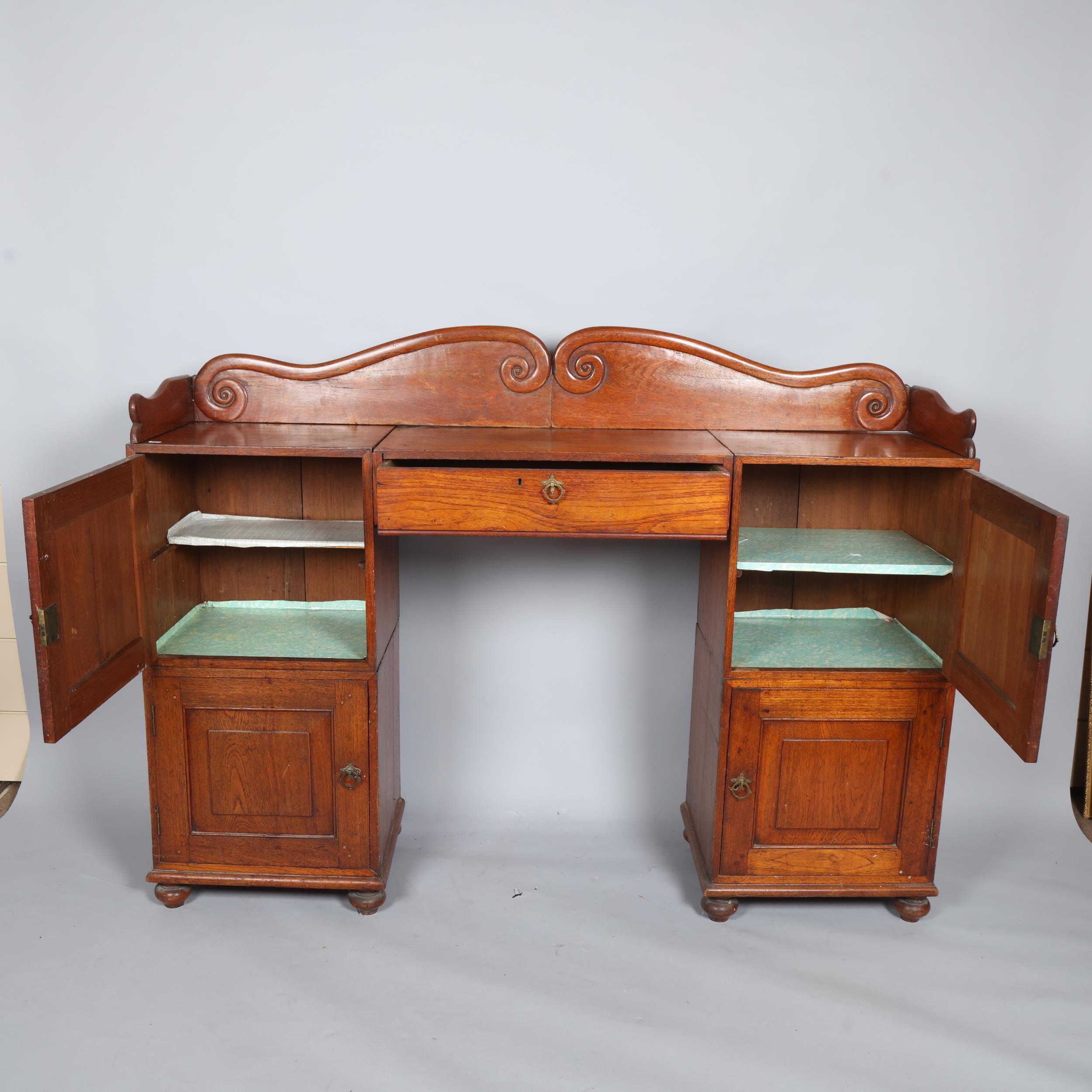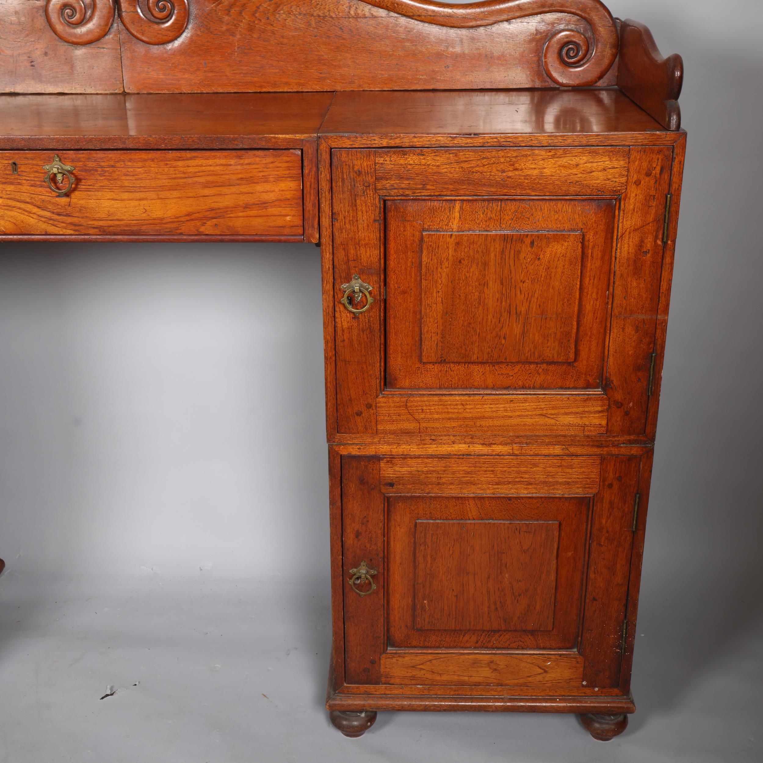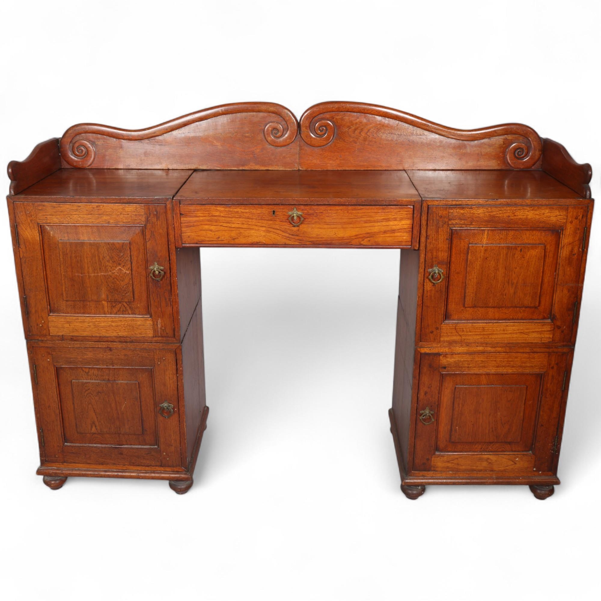 A 19th century teak campaign sideboard, separating into multiple sections, with brass-bound corners and folding 4-section gallery