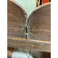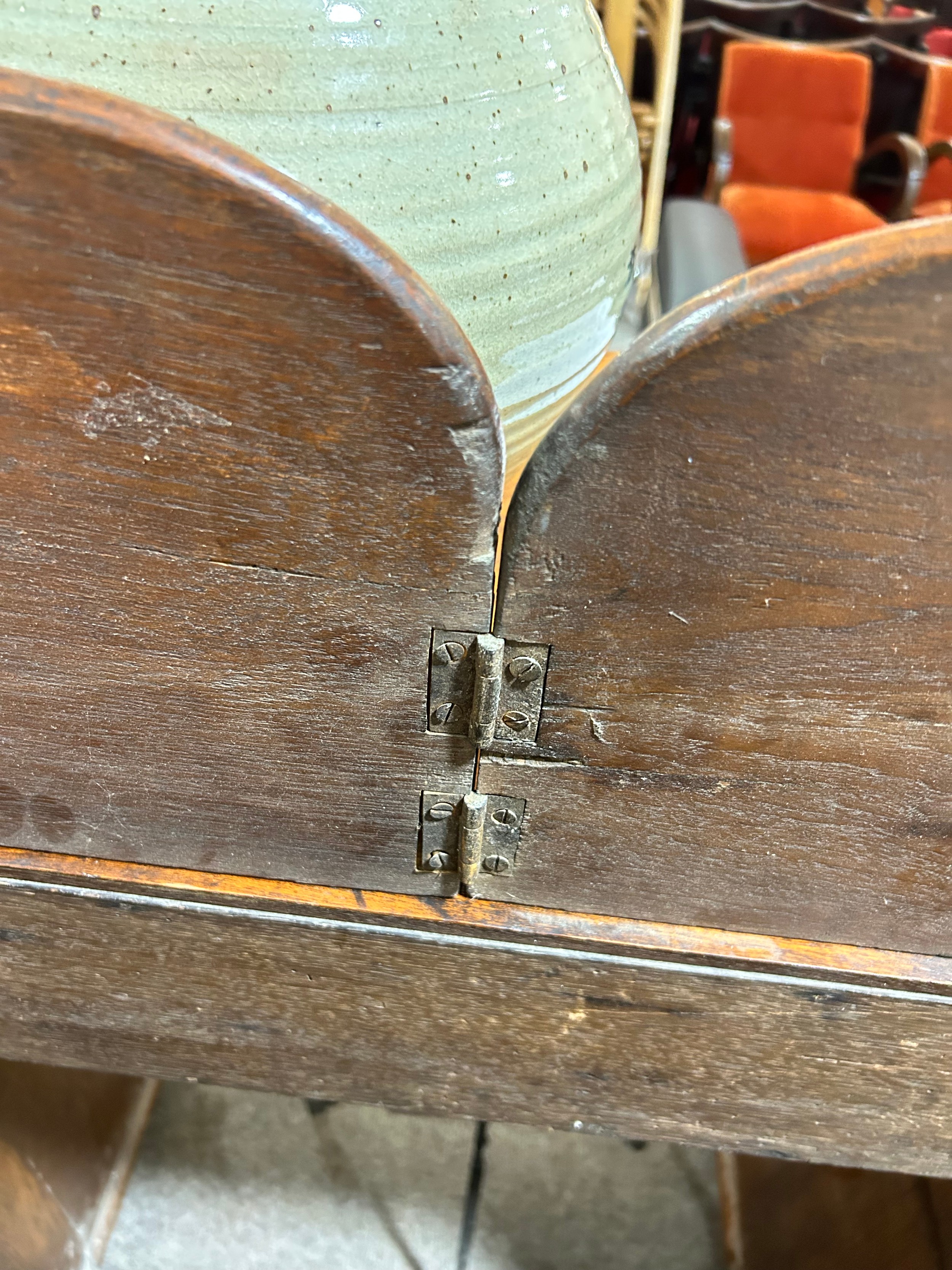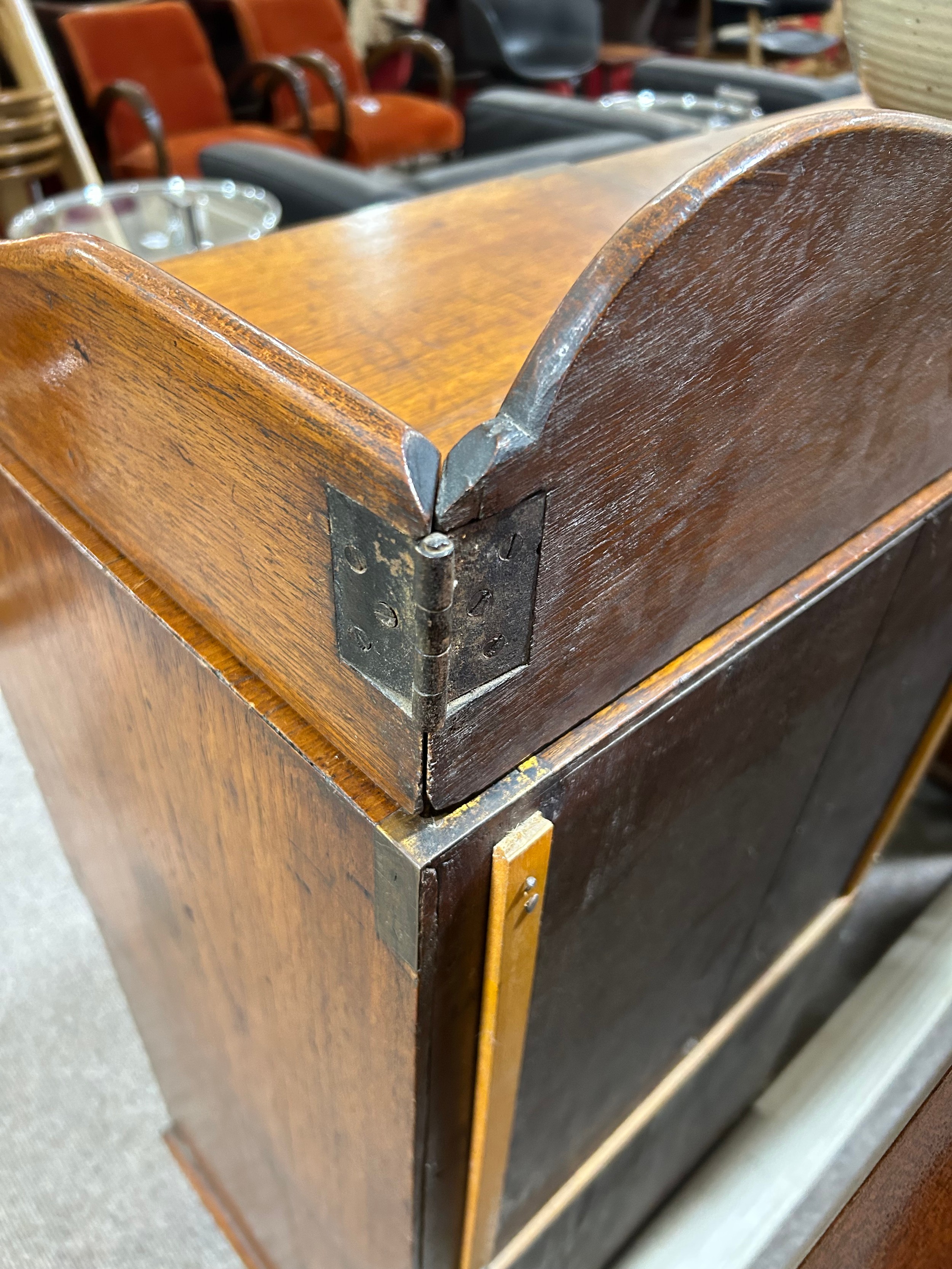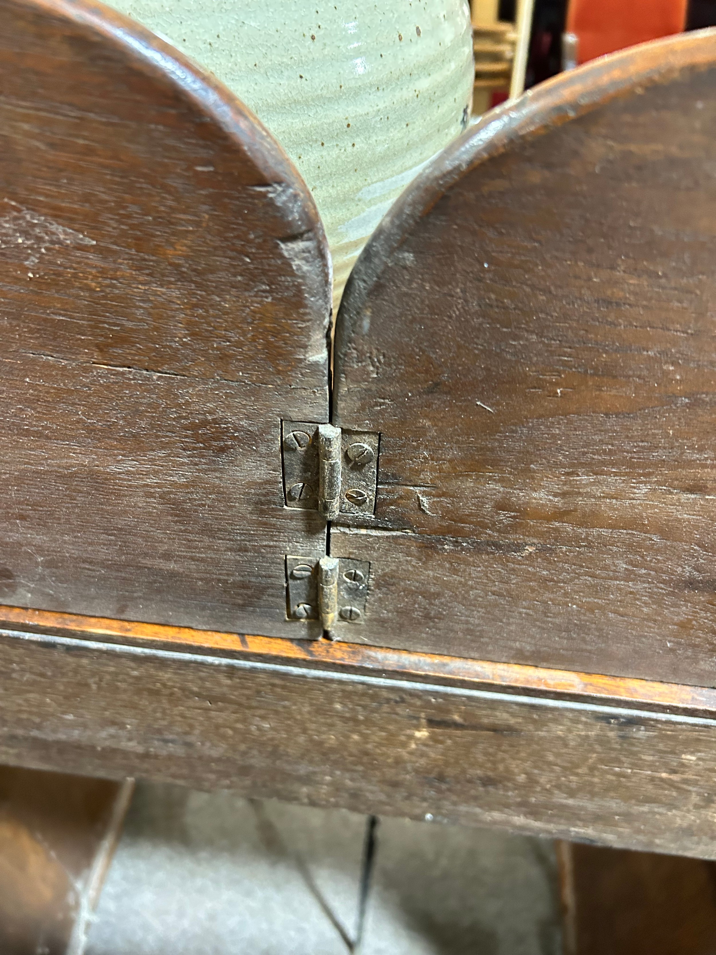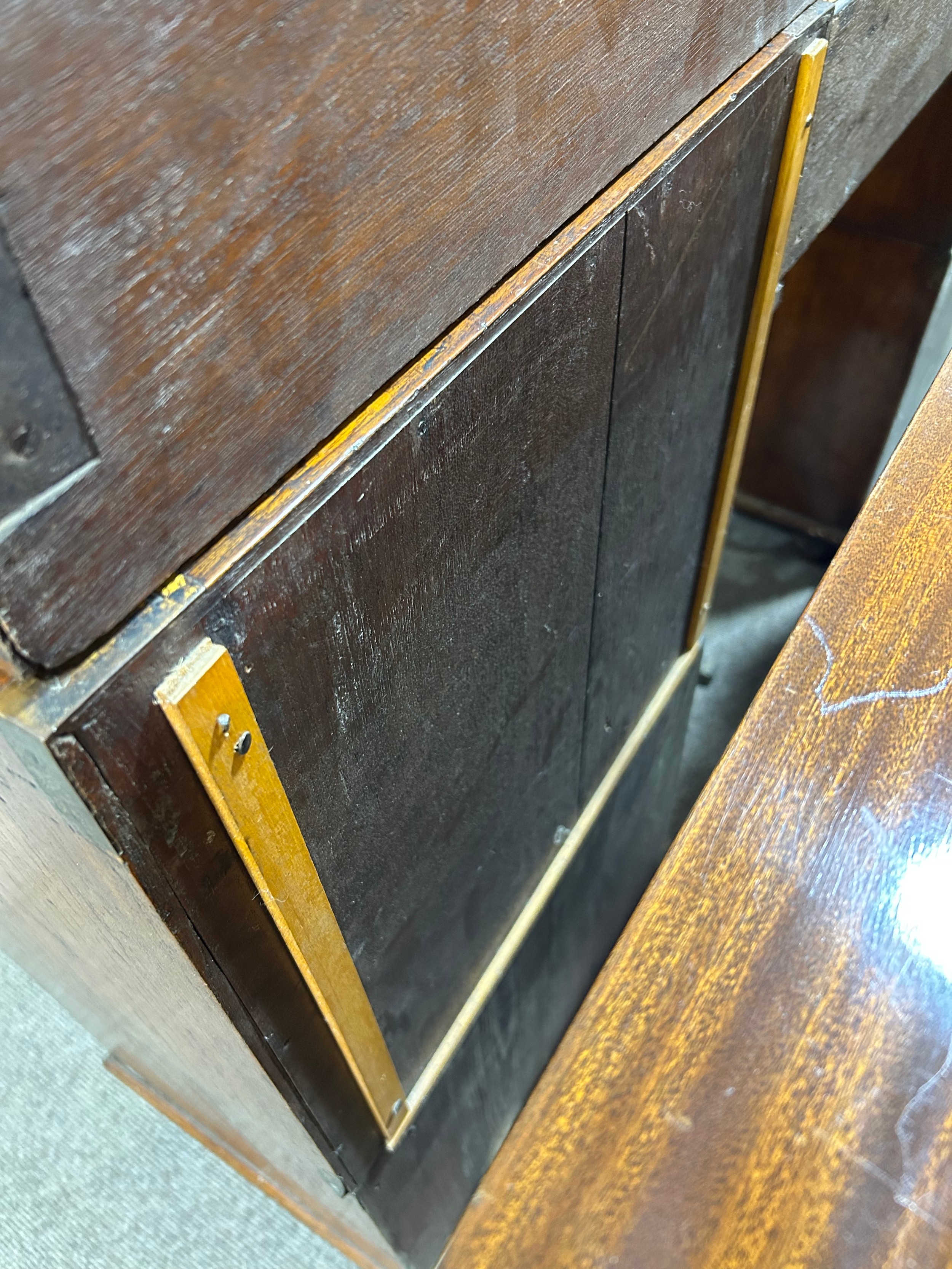 Gallery is hinged at corners and in the centre. lrft corner hinge detached from back. Some separation of panels on top and sides. Strips of ply on back of top left cabinet. Holes for bolts on top cabinet to fix centre section but no bolts or holes to fix inside centre section. Surface wear and patina commensurate with age and use.