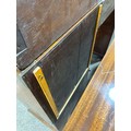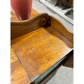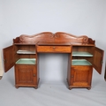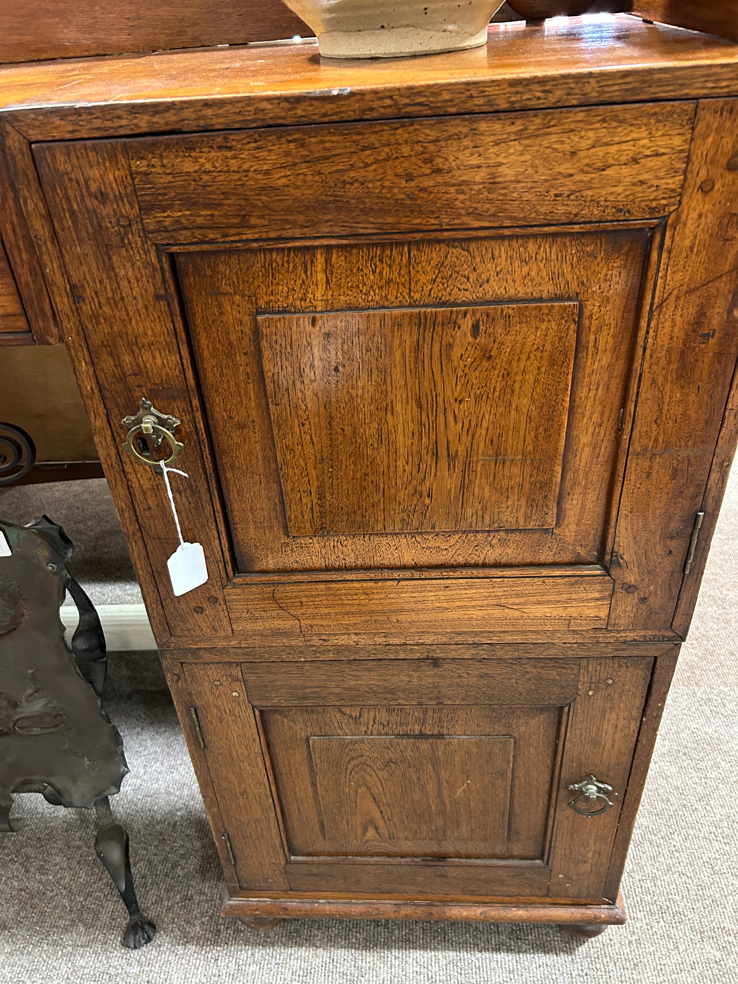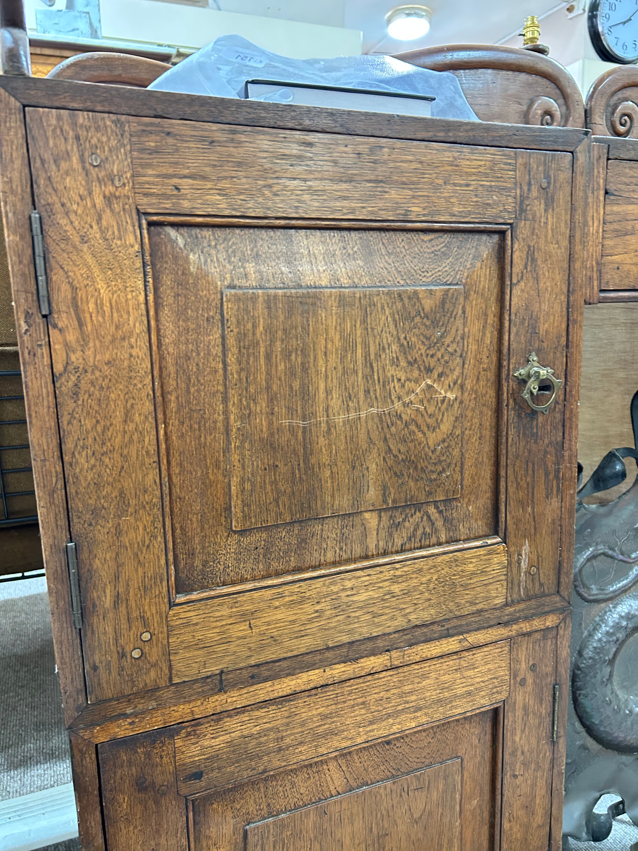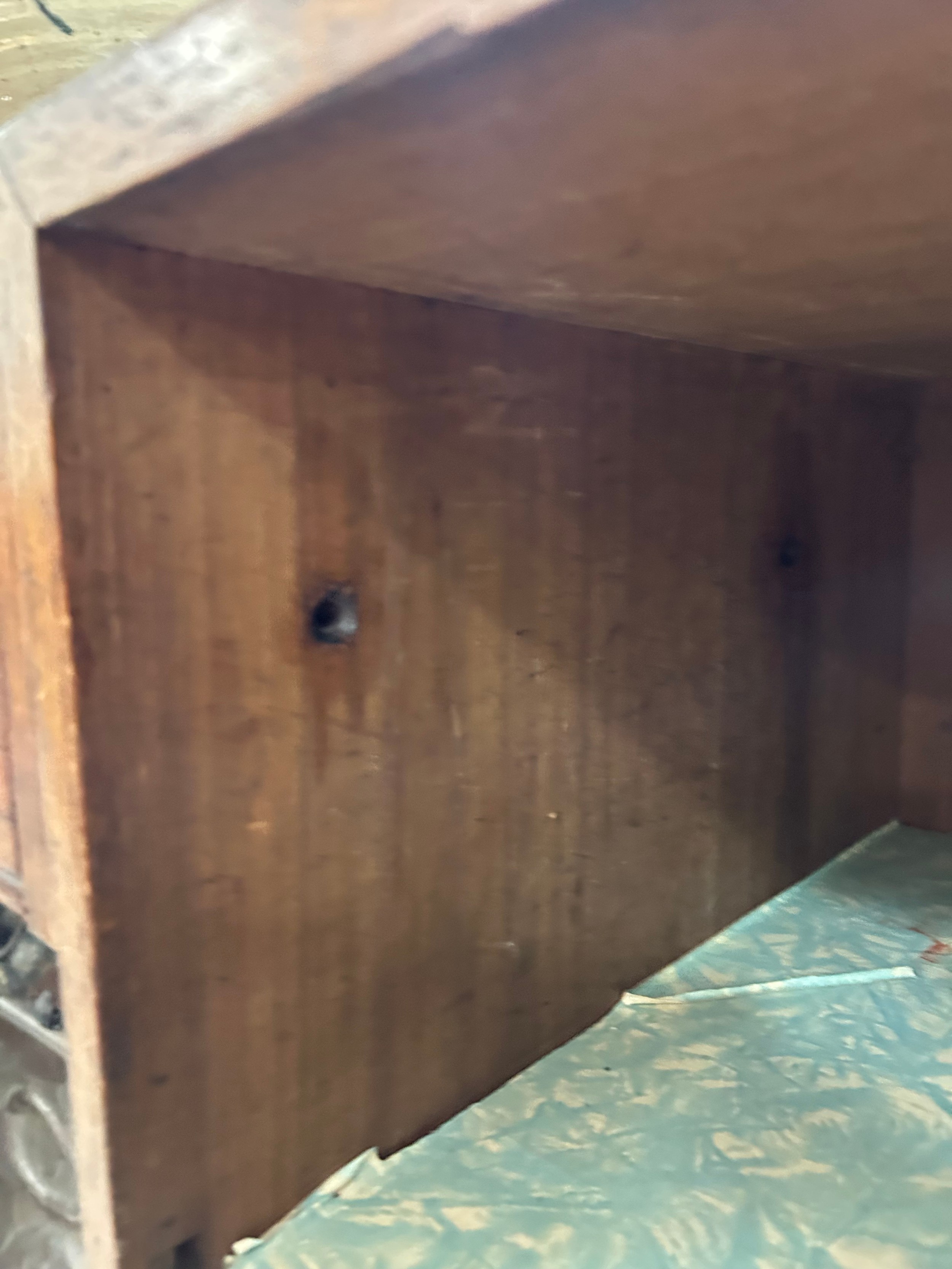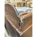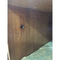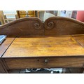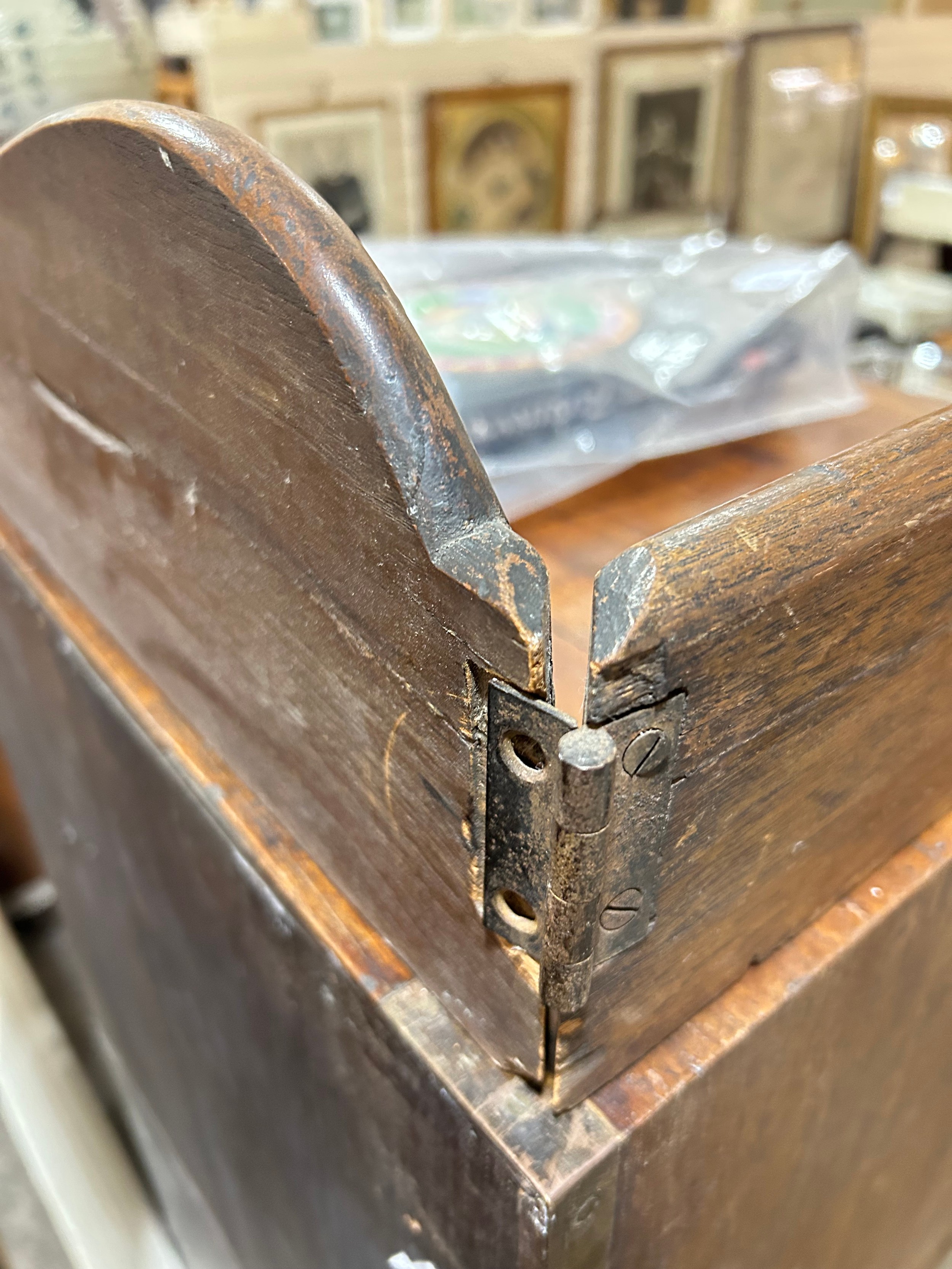 Gallery is hinged at corners and in the centre. lrft corner hinge detached from back. Some separation of panels on top and sides. Strips of ply on back of top left cabinet. Holes for bolts on top cabinet to fix centre section but no bolts or holes to fix inside centre section. Surface wear and patina commensurate with age and use.