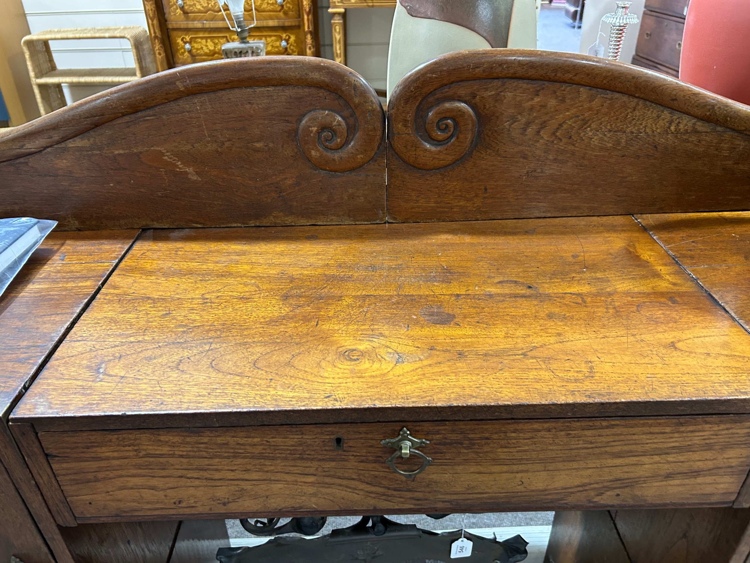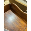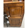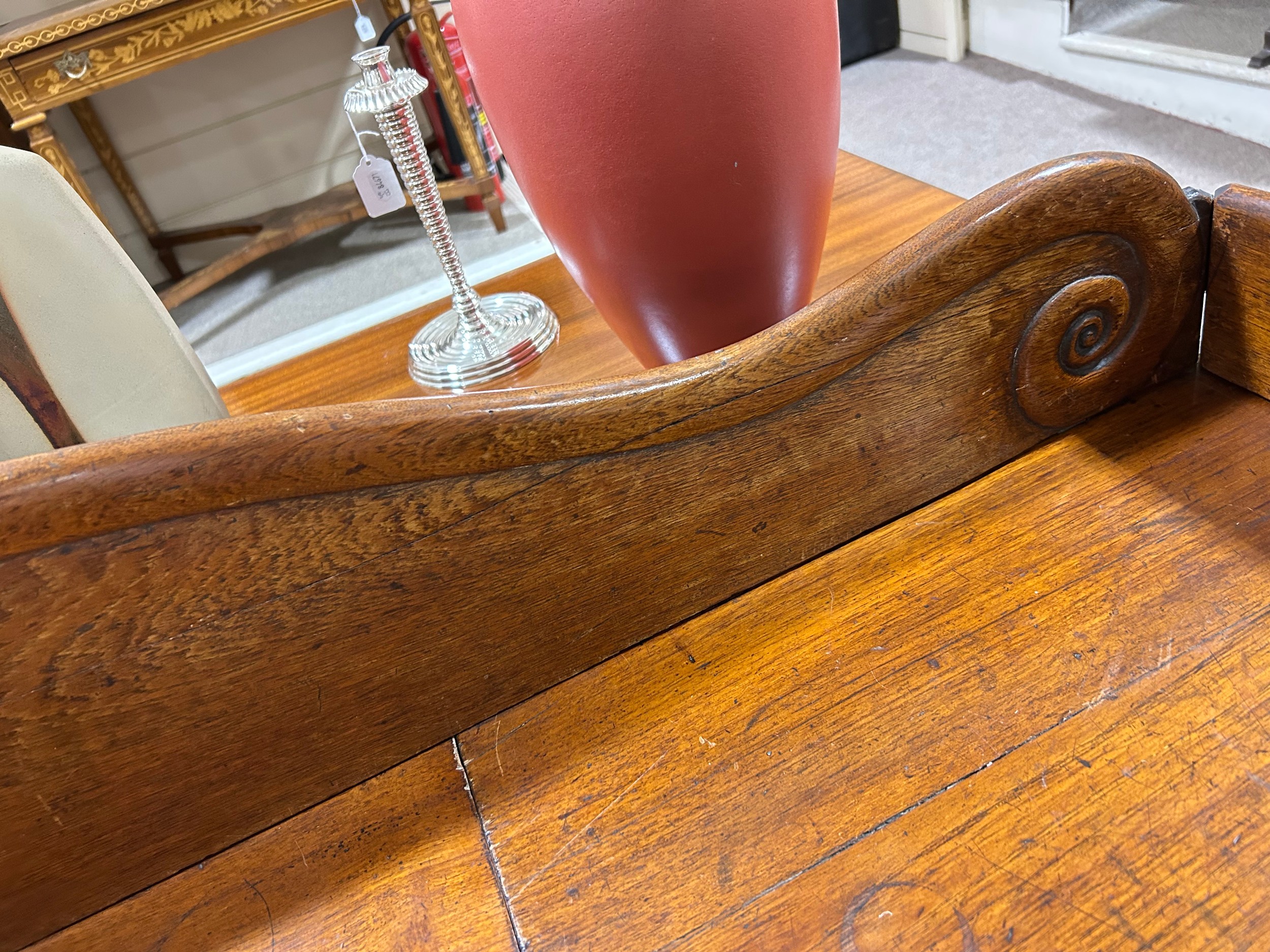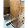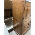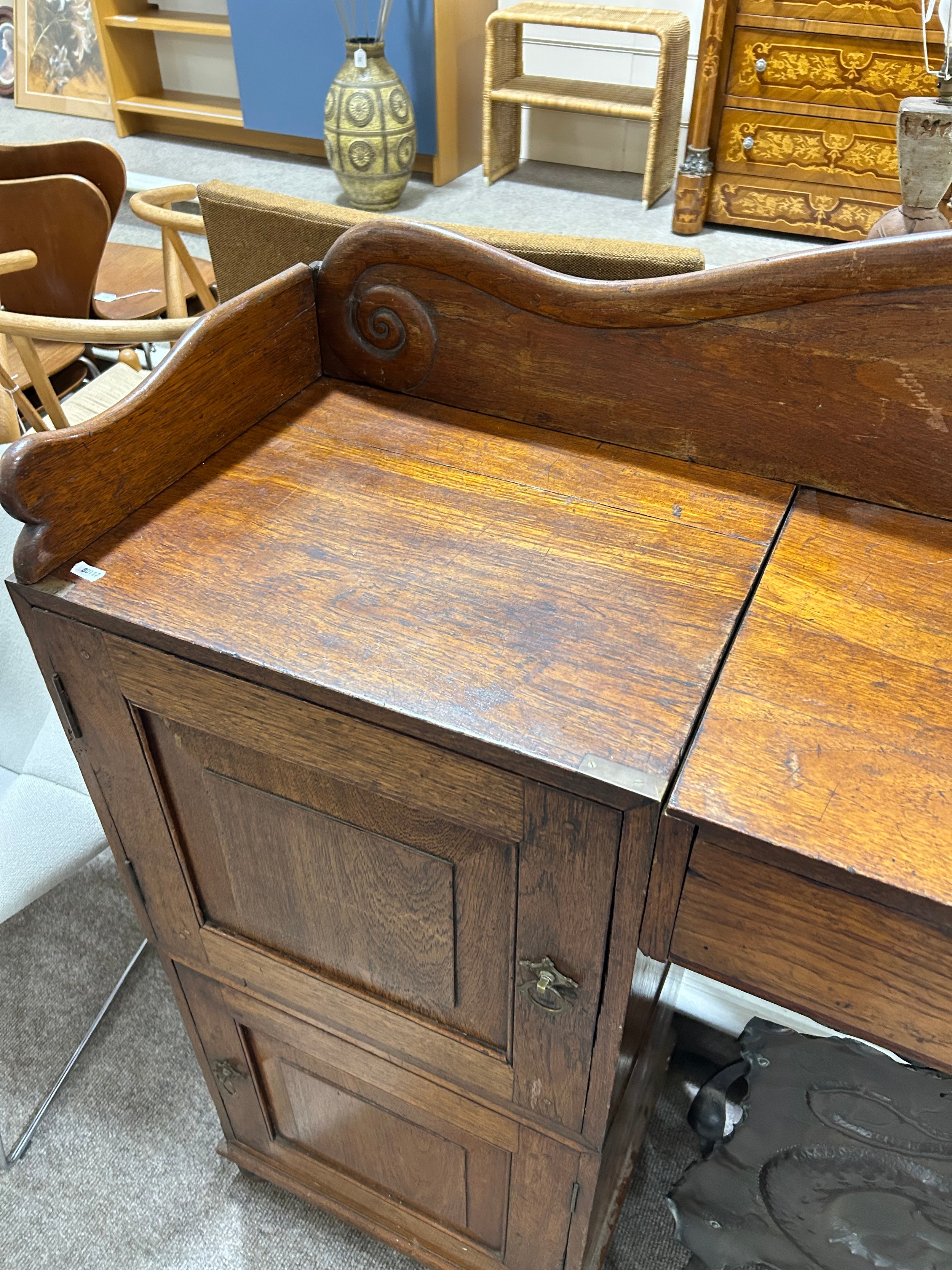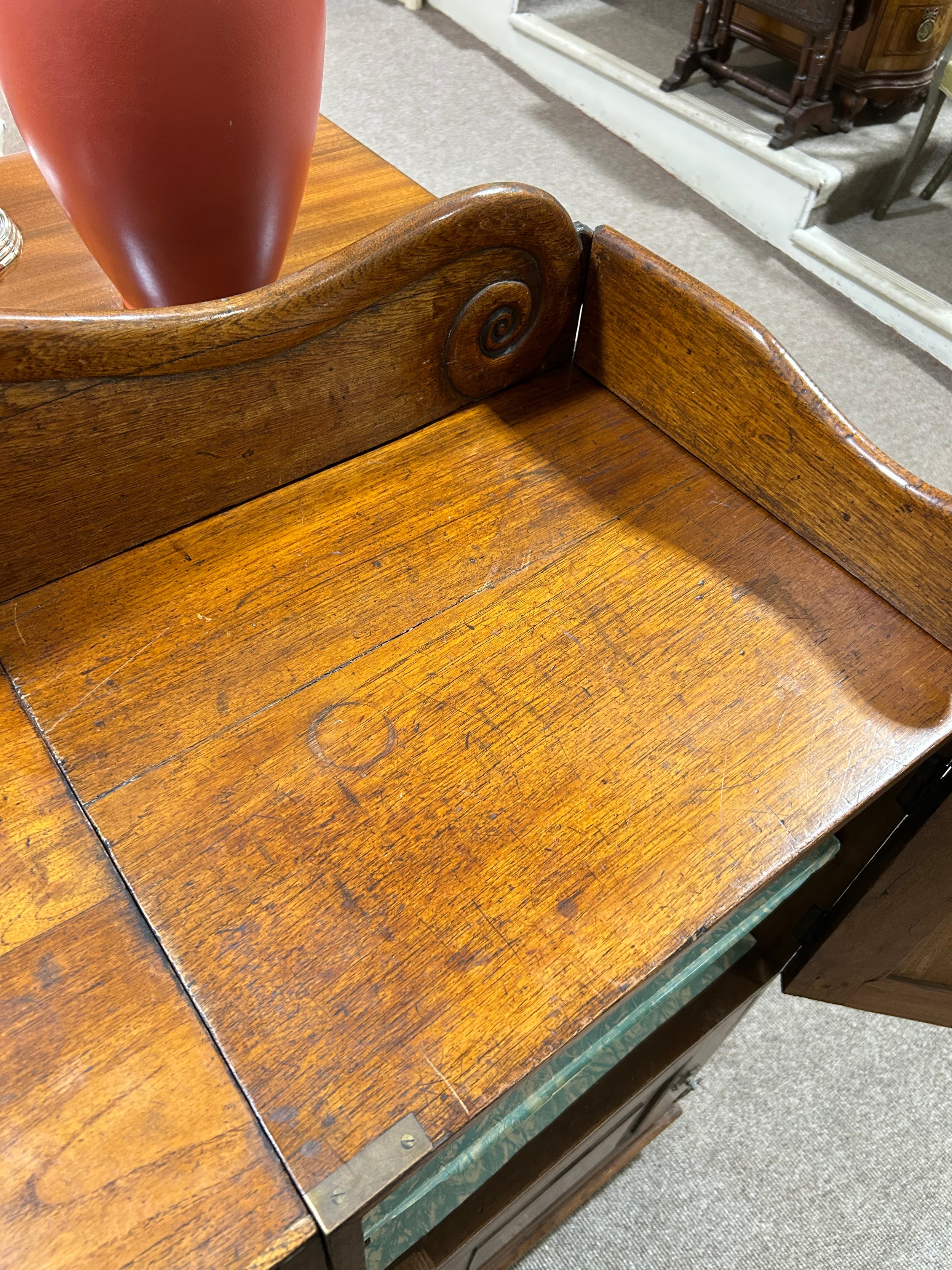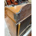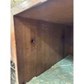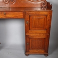 Gallery is hinged at corners and in the centre. lrft corner hinge detached from back. Some separation of panels on top and sides. Strips of ply on back of top left cabinet. Holes for bolts on top cabinet to fix centre section but no bolts or holes to fix inside centre section. Surface wear and patina commensurate with age and use.