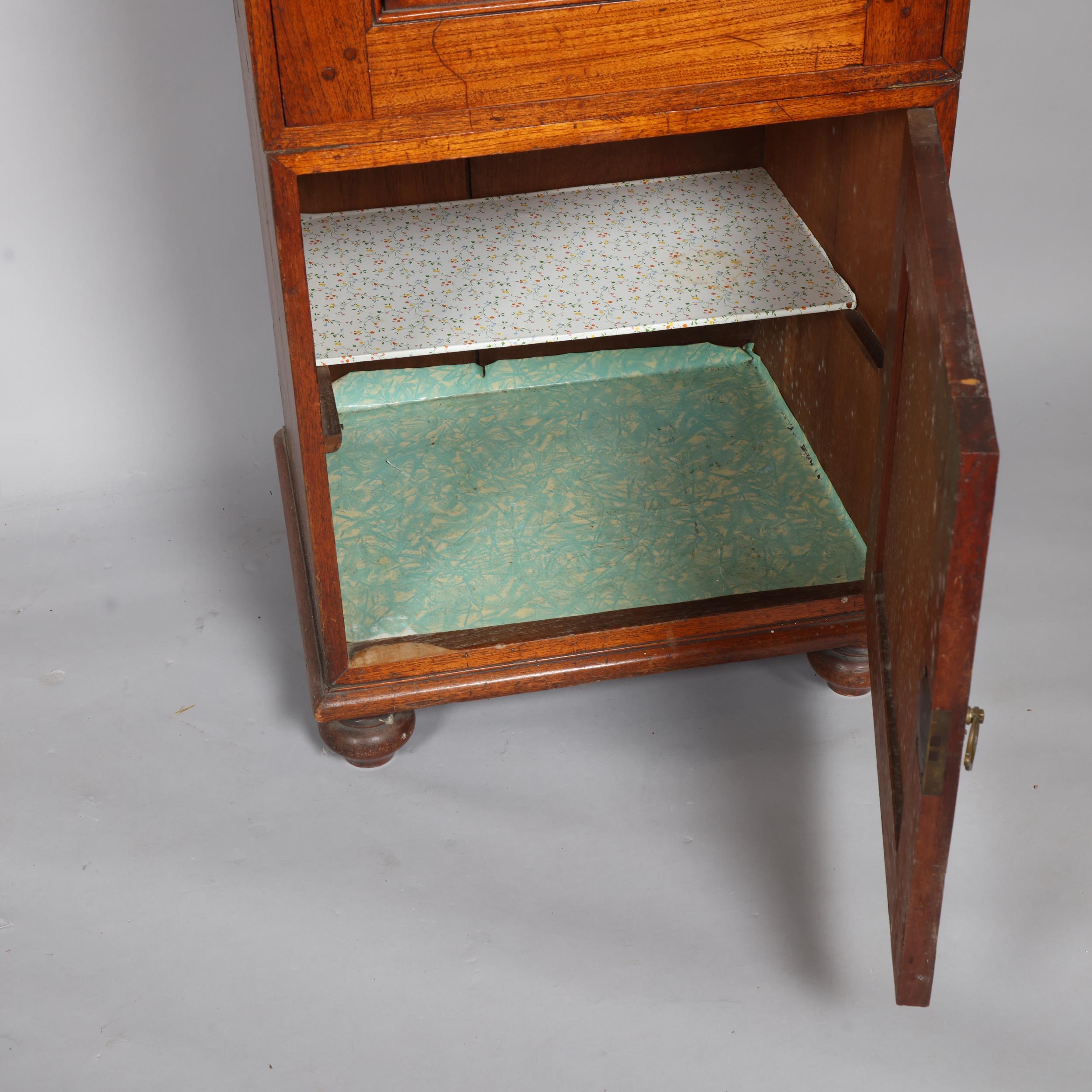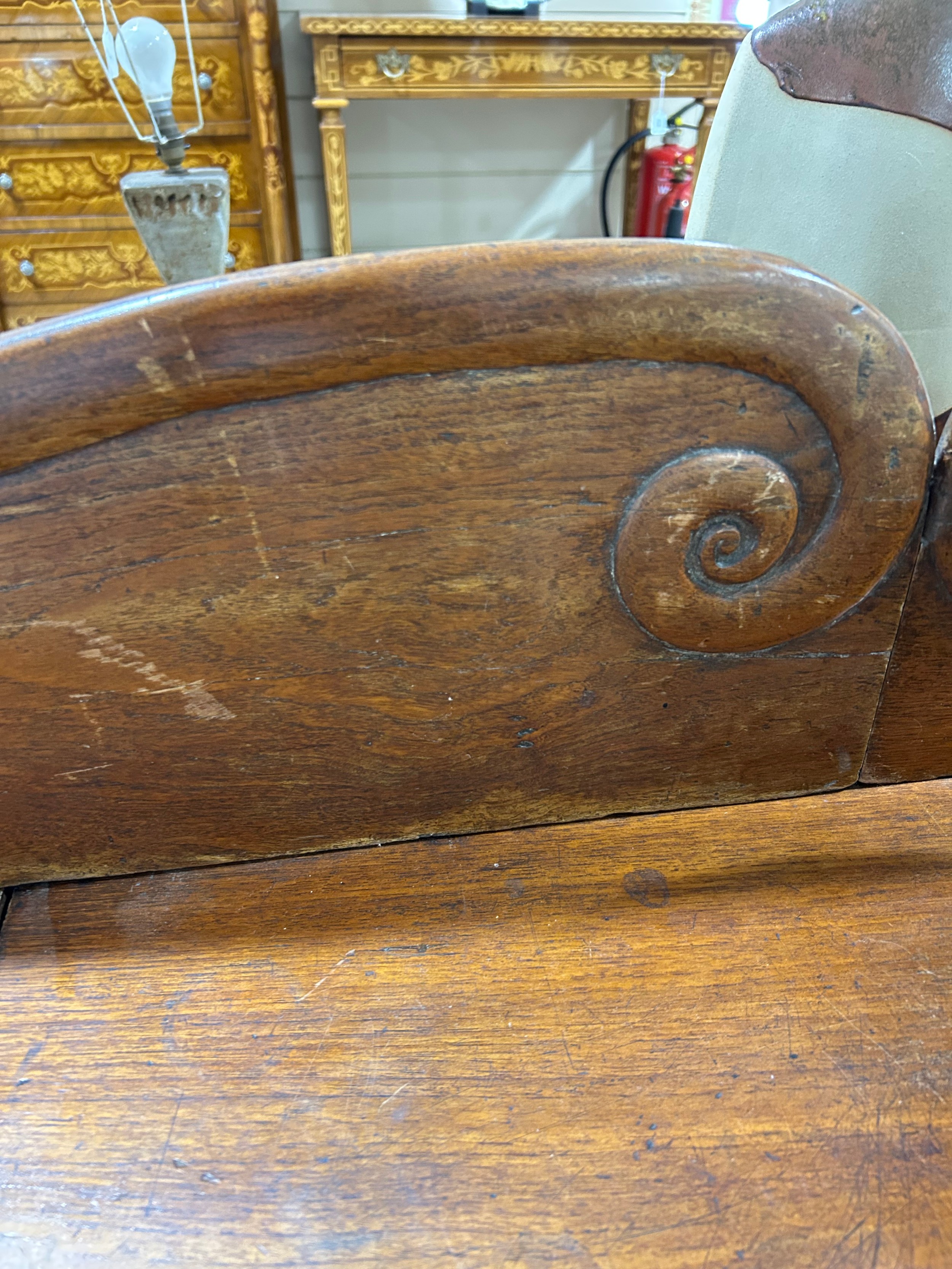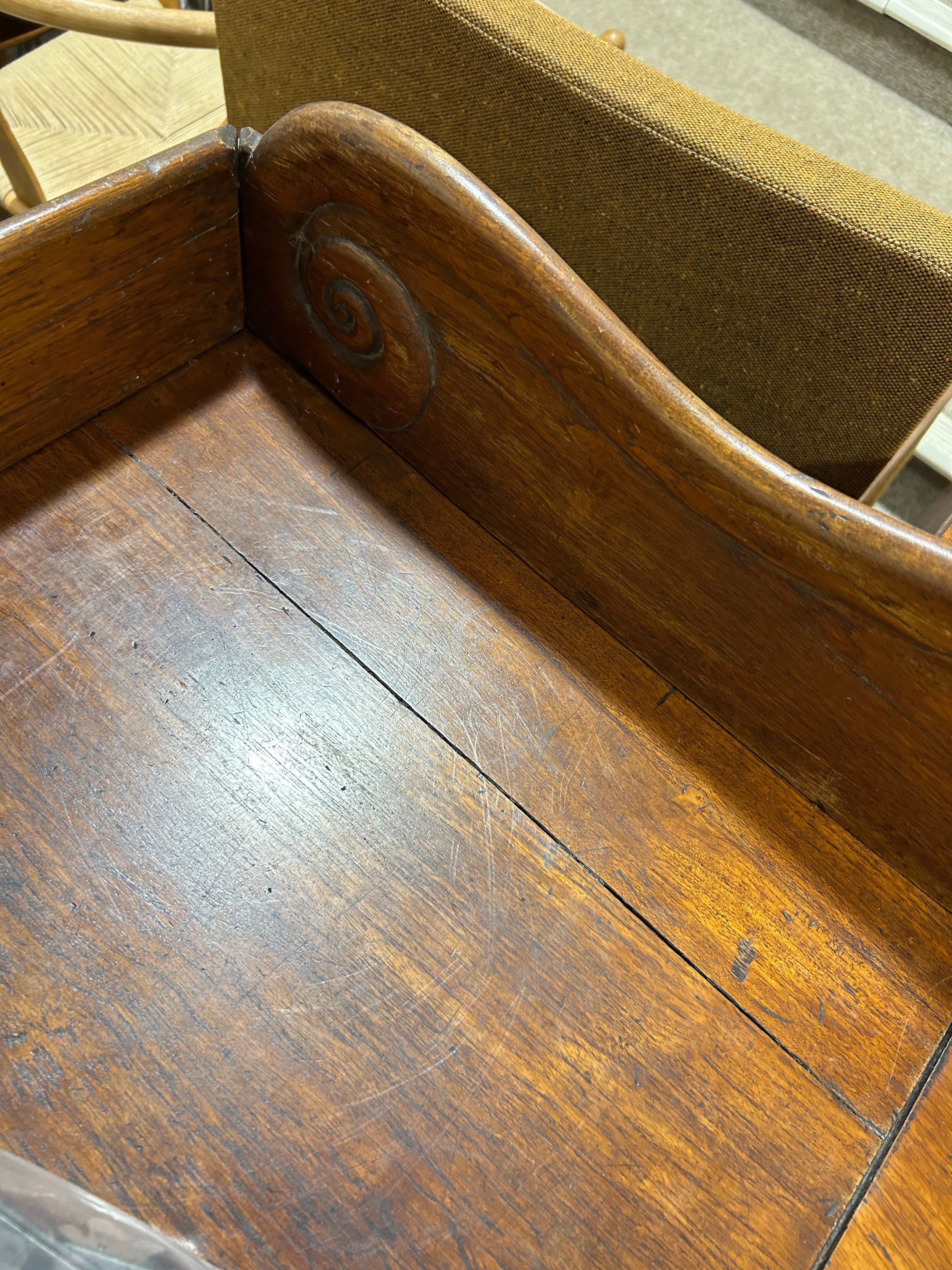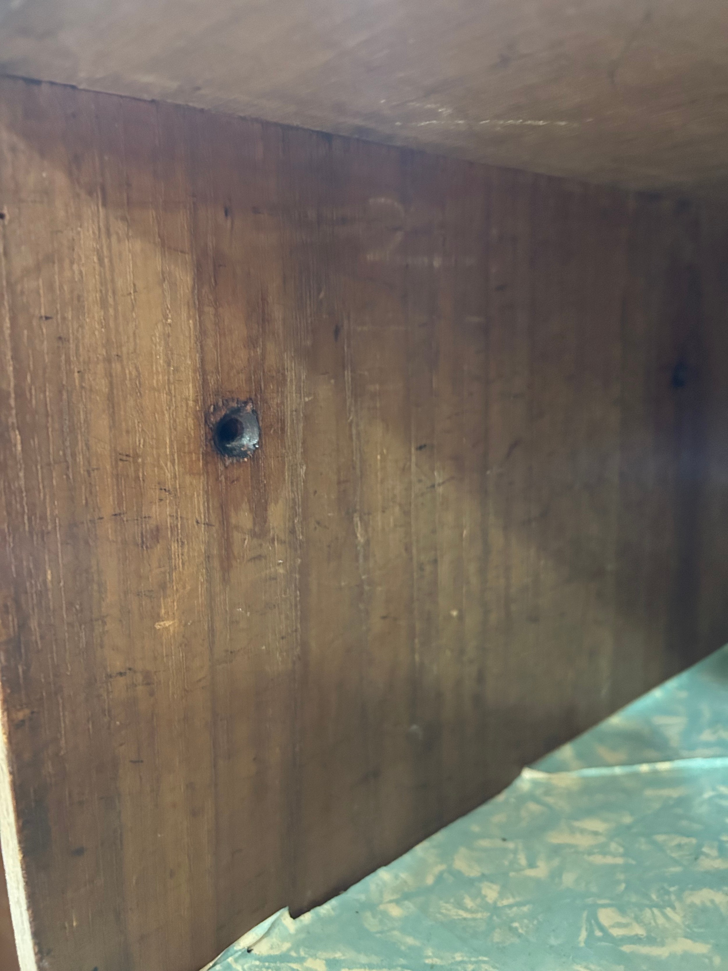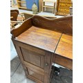 Gallery is hinged at corners and in the centre. lrft corner hinge detached from back. Some separation of panels on top and sides. Strips of ply on back of top left cabinet. Holes for bolts on top cabinet to fix centre section but no bolts or holes to fix inside centre section. Surface wear and patina commensurate with age and use.