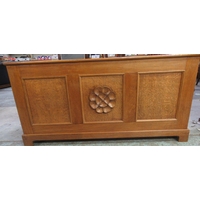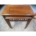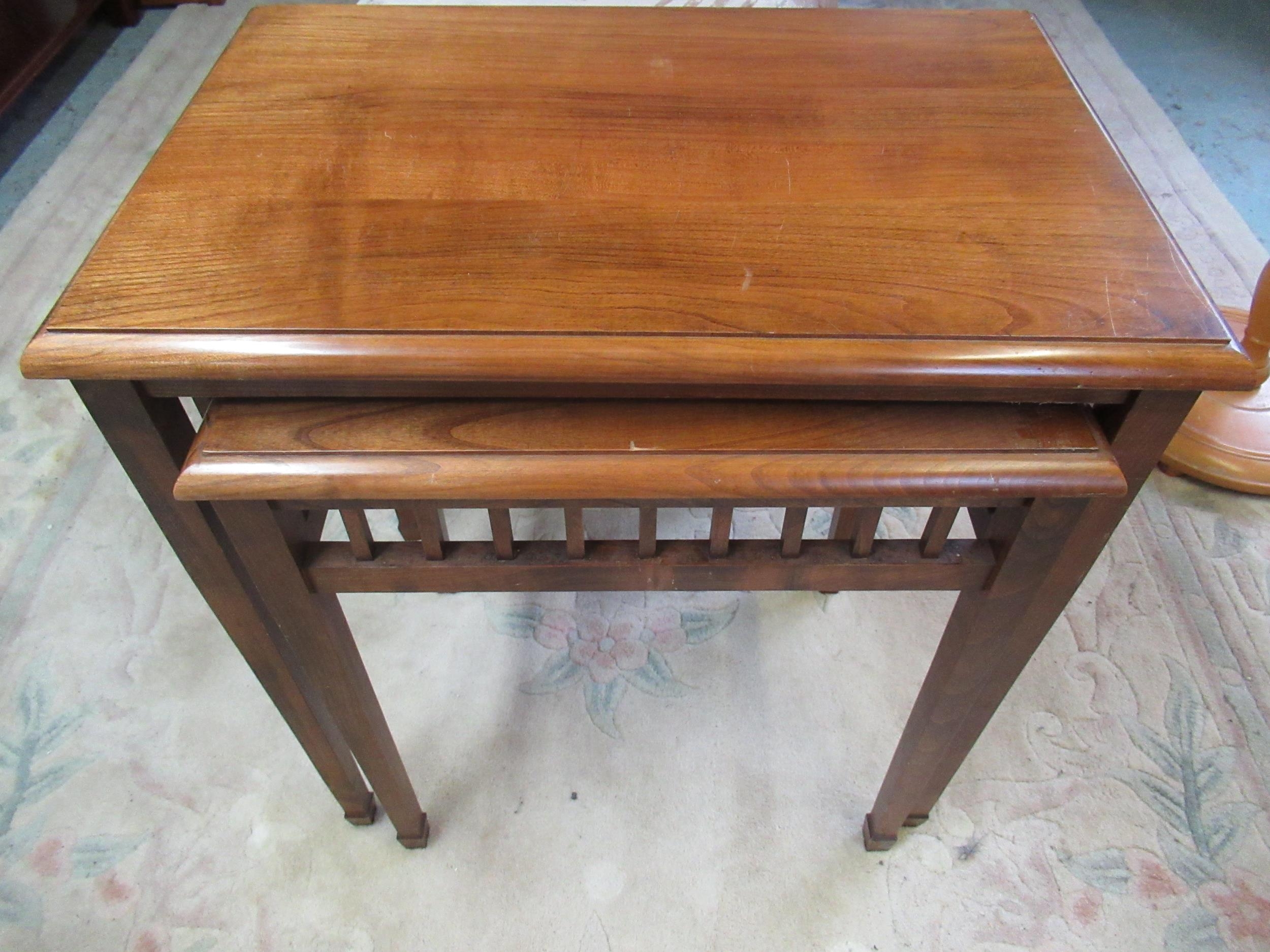 Graduated pair of oak rectangular lamp tables with galleried frieze on square tapered supports with spade feet, makers label for J Nolan, Seamer, Scarborough, W57cm D38cm H60cm max (2)