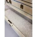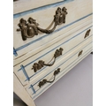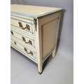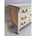 Painted pine chest with three long drawers decorated with brass mounts, raised on tapered legs { 83cm H X 111cm W X 48cm D }.