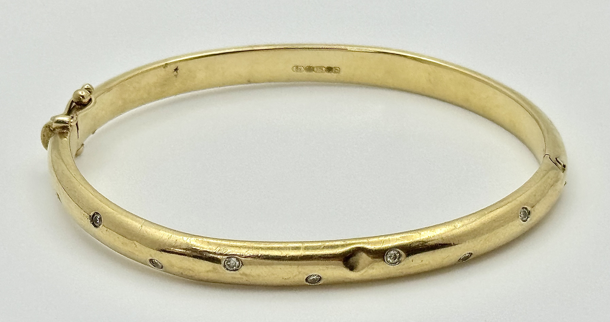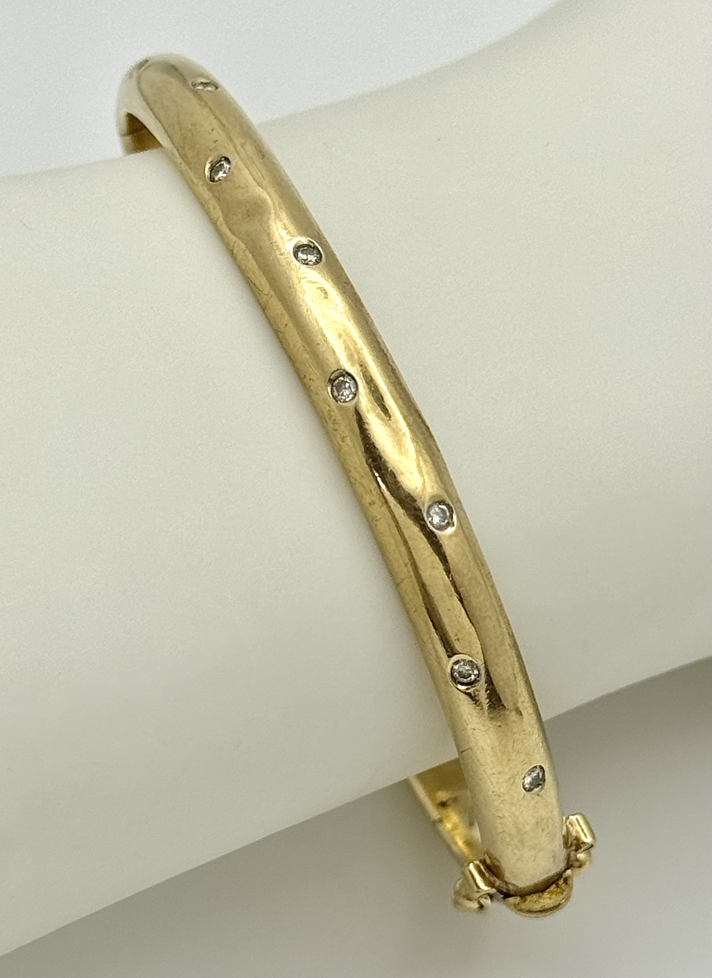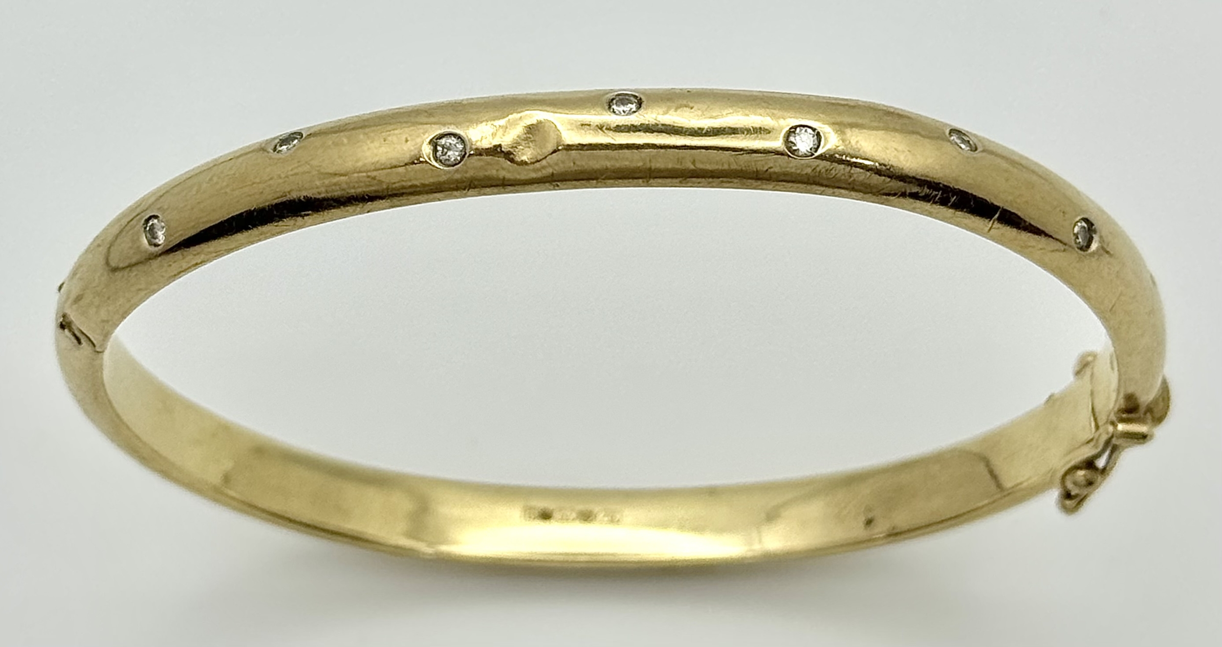 A Vintage 9K Yellow Gold Diamond Set Bangle. A small kink mid bangle so as found. Clip open design. 10.95g. NL-1315-3005.