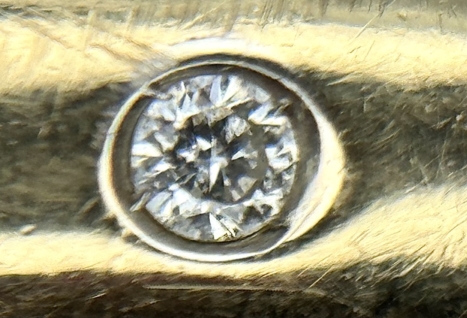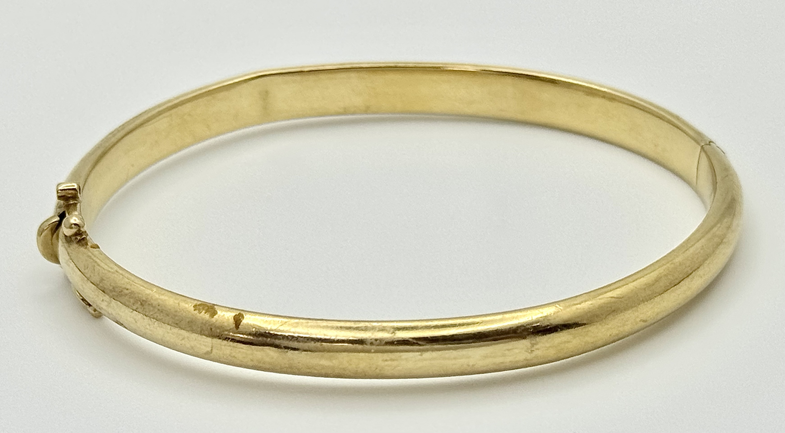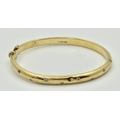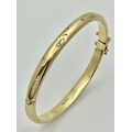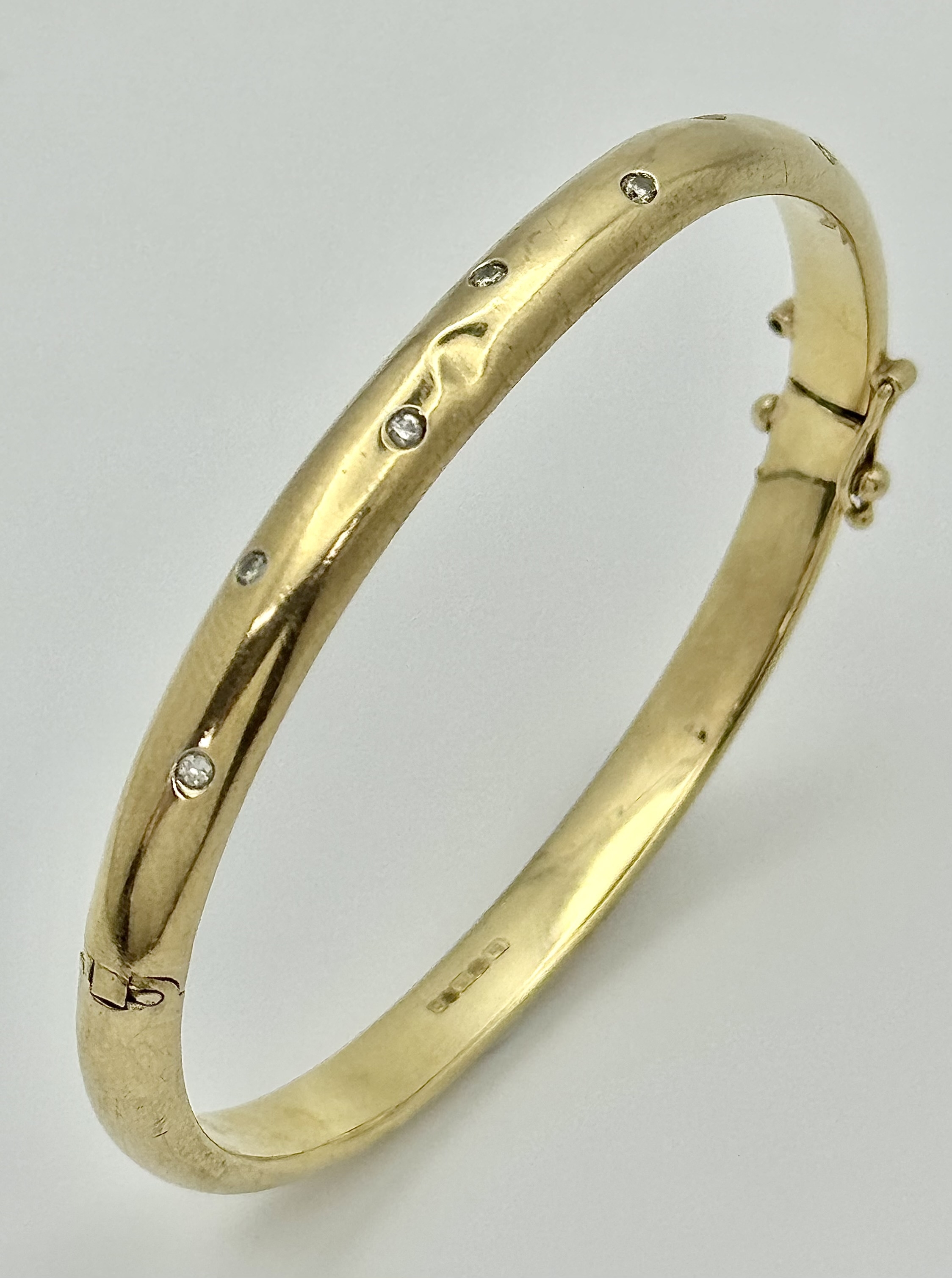 A Vintage 9K Yellow Gold Diamond Set Bangle. A small kink mid bangle so as found. Clip open design. 10.95g. NL-1315-3005.