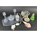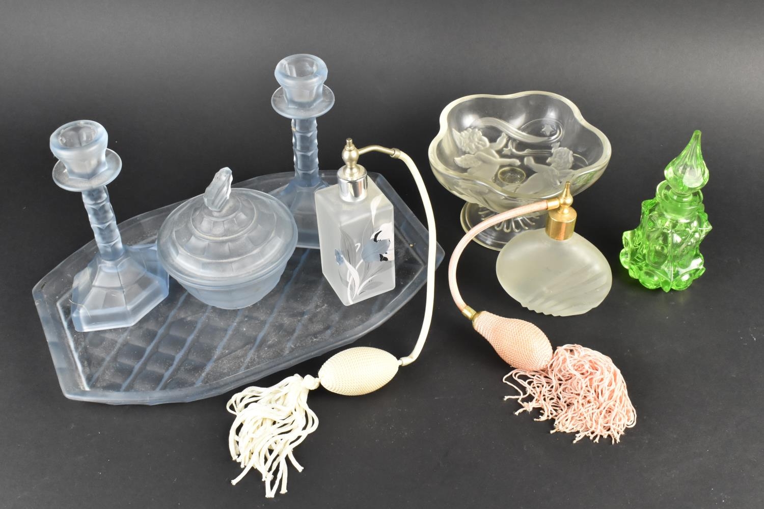 A Collection of Glass Dressing Table Items to Comprise Frosted Glass Three Piece Set, Vaseline Glass Bottle and Stopper, Perfume Atomisers etc
