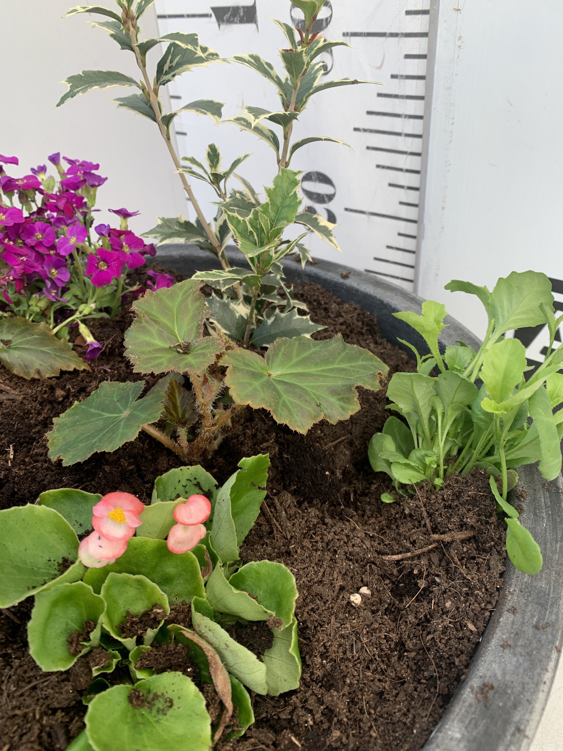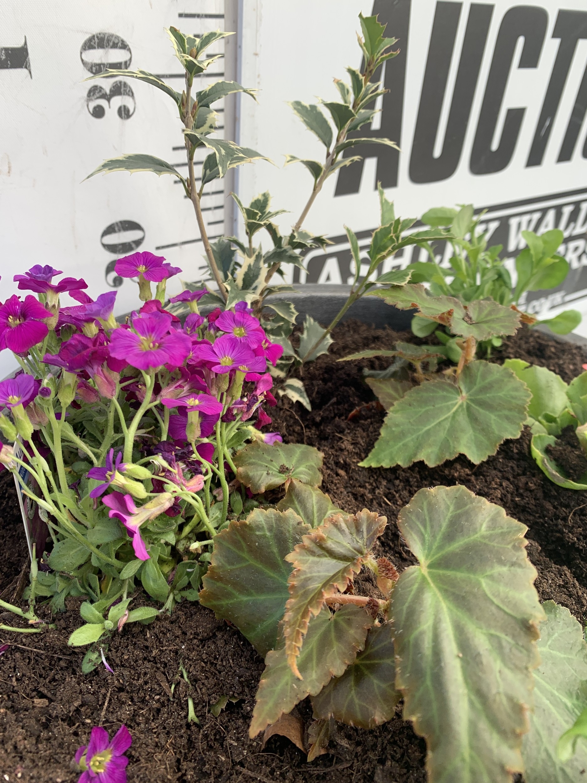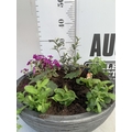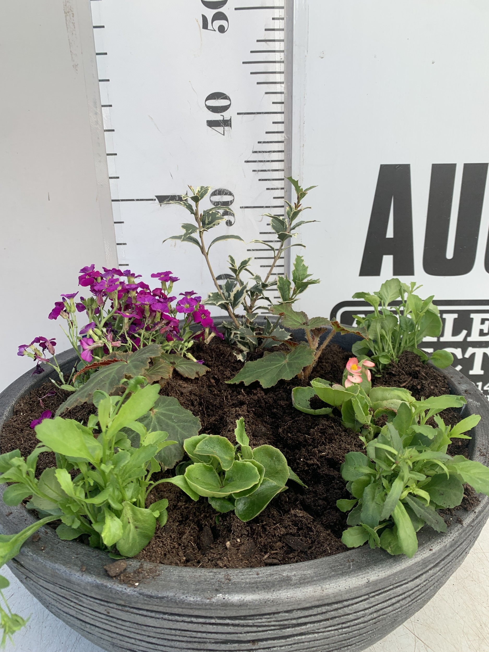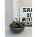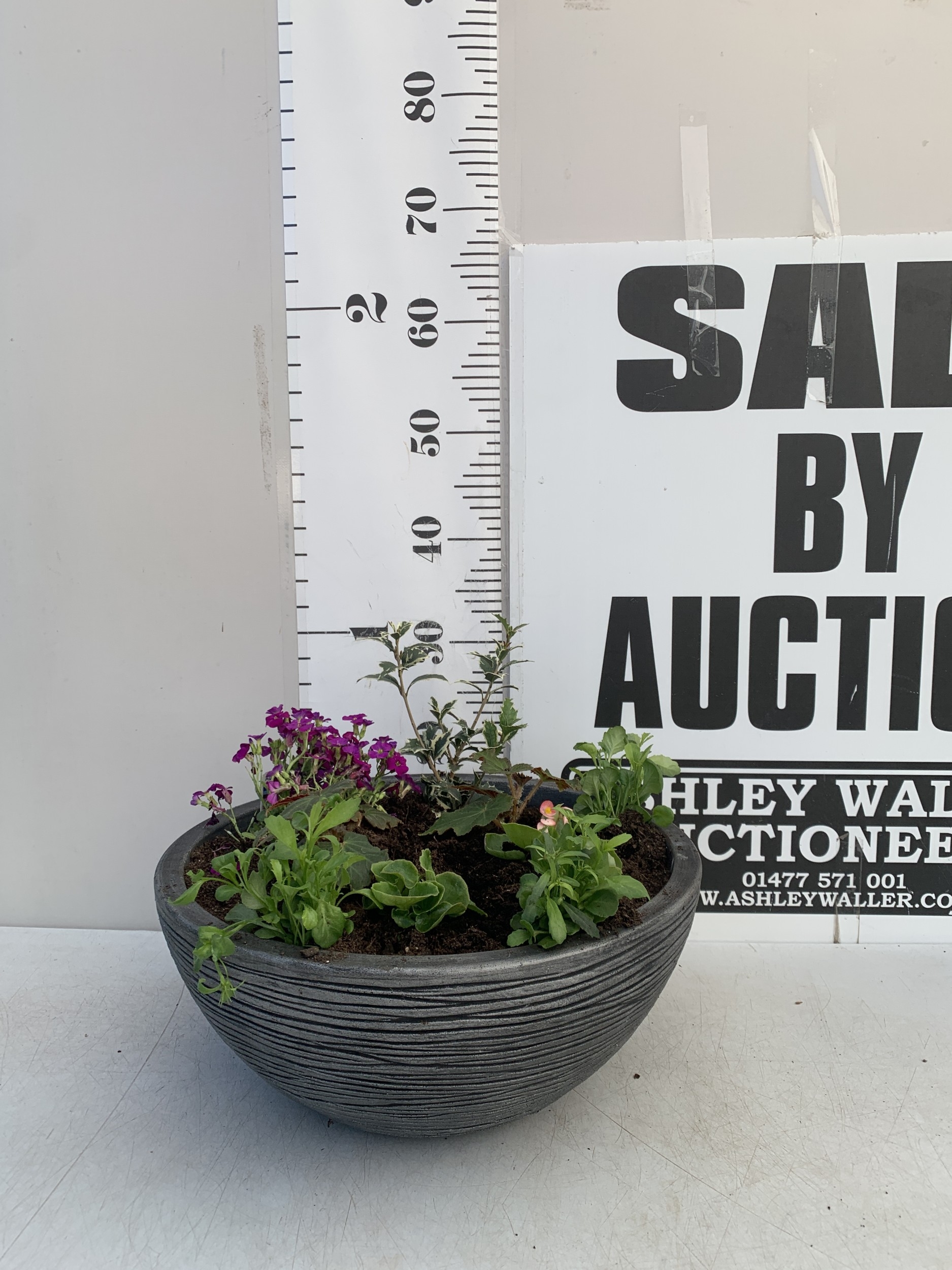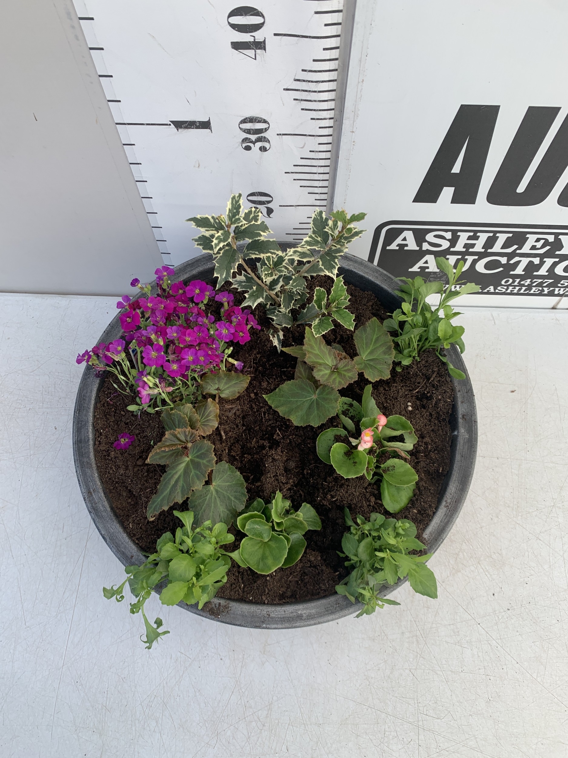 ONE LARGE PLANTER FILLED WITH VARIOUS BEDDING PLANTS TO INCLUDE AUBRIETA, SEMPS, LOBELIA ETC. PLANTER MEASURES 38CM IN DIAMETER
