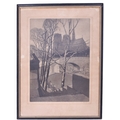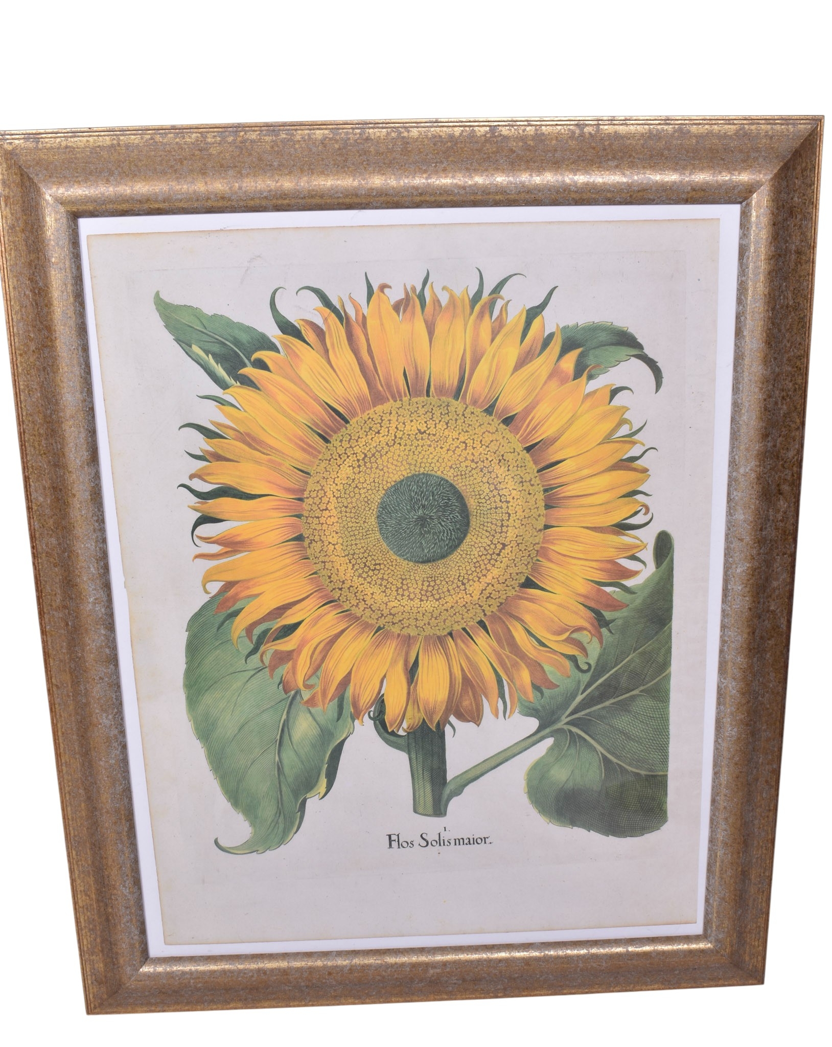 Three assorted prints. Including a 'sunflower' and a signed etching of Notre Dame cathedral, all framed and glazed. Max. 69cm x 80cm