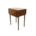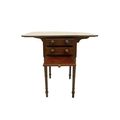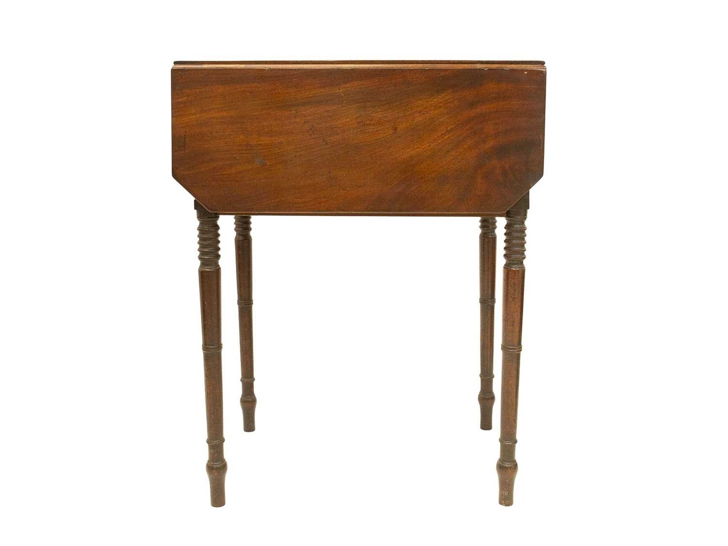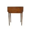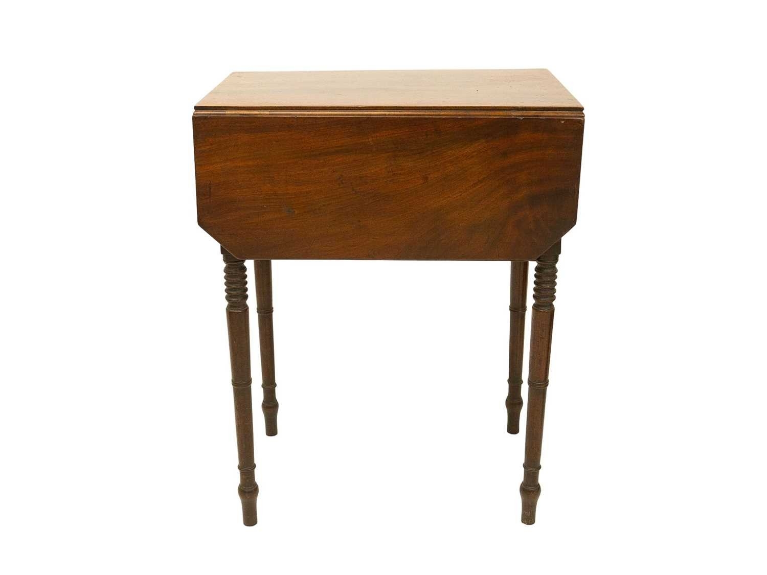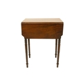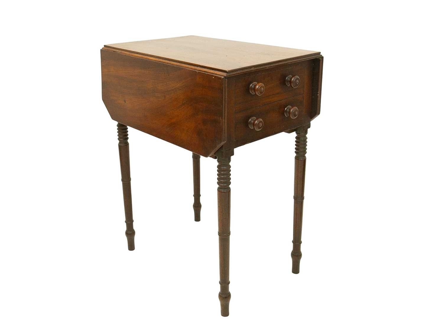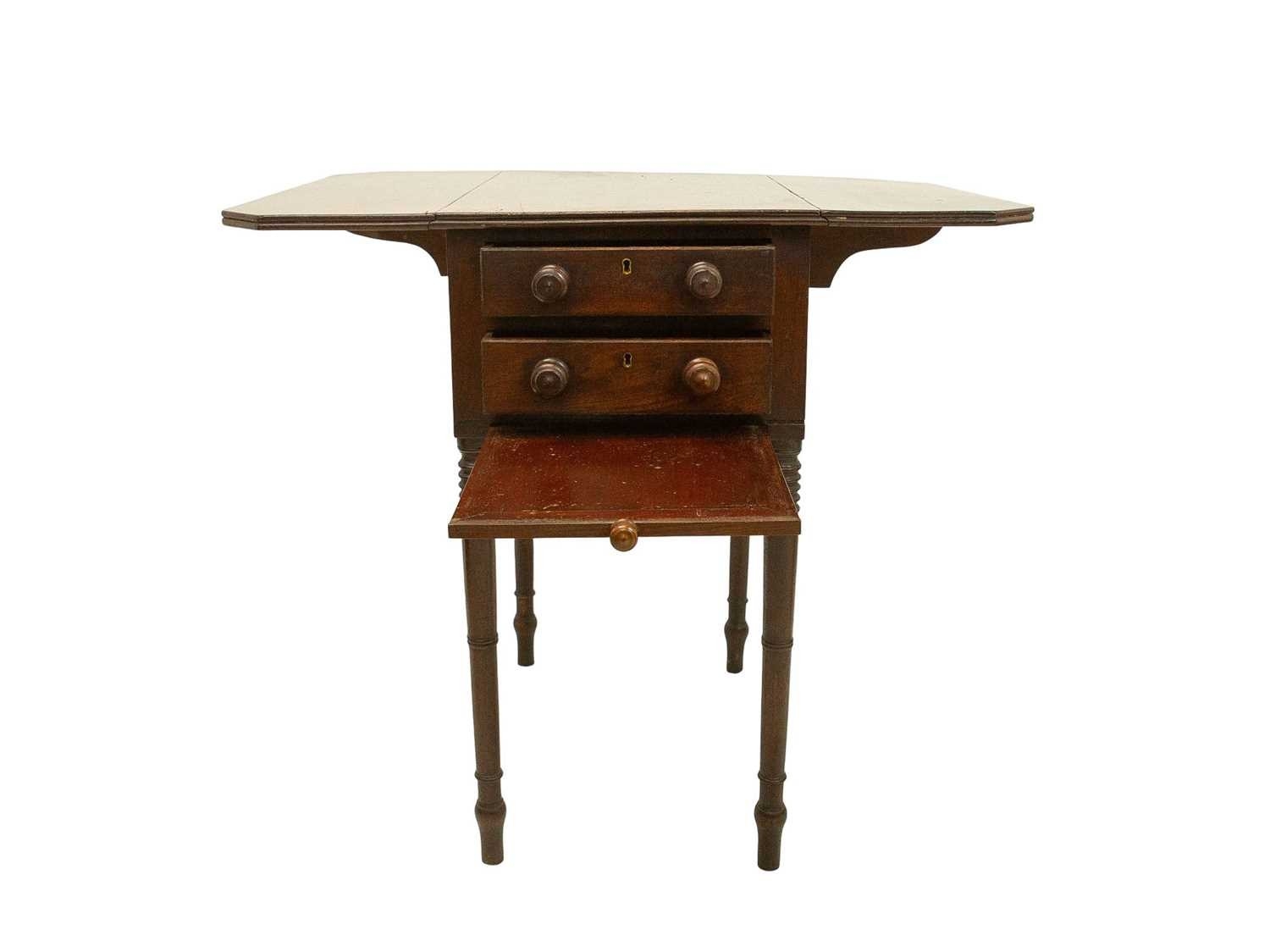 An early Victorian mahogany work table. The well figured top with two leaves above two drawers and a pull-out slide, raised on ring turned legs, height 67cm, width 52.5cm, depth 74cm.