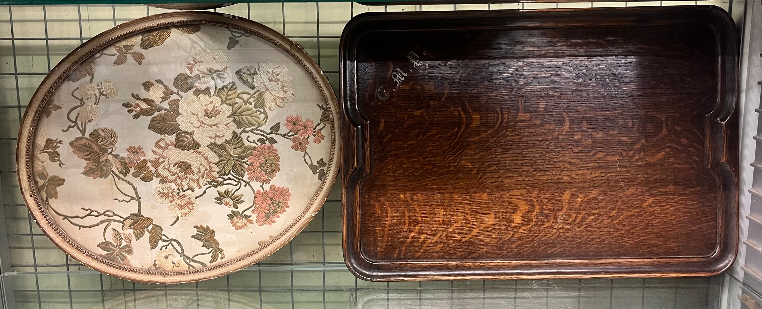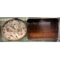 OAK SERVING TRAY AND OVAL EMBROIDERED FLORAL PANEL