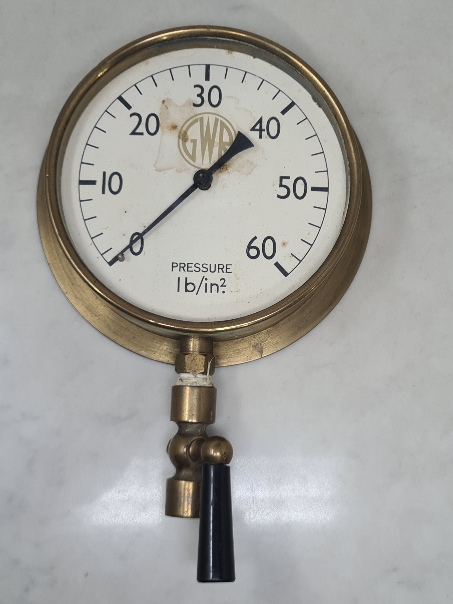 A brass GWR Pressure Gauge with circular monogram to centre of the enamel dial 7in D