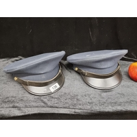 Vintage Size 56" German "Abert Kempf KG Stirndruckfrei" Police Hat and a Dutch police hat in navy with gold emblem and embroidery.