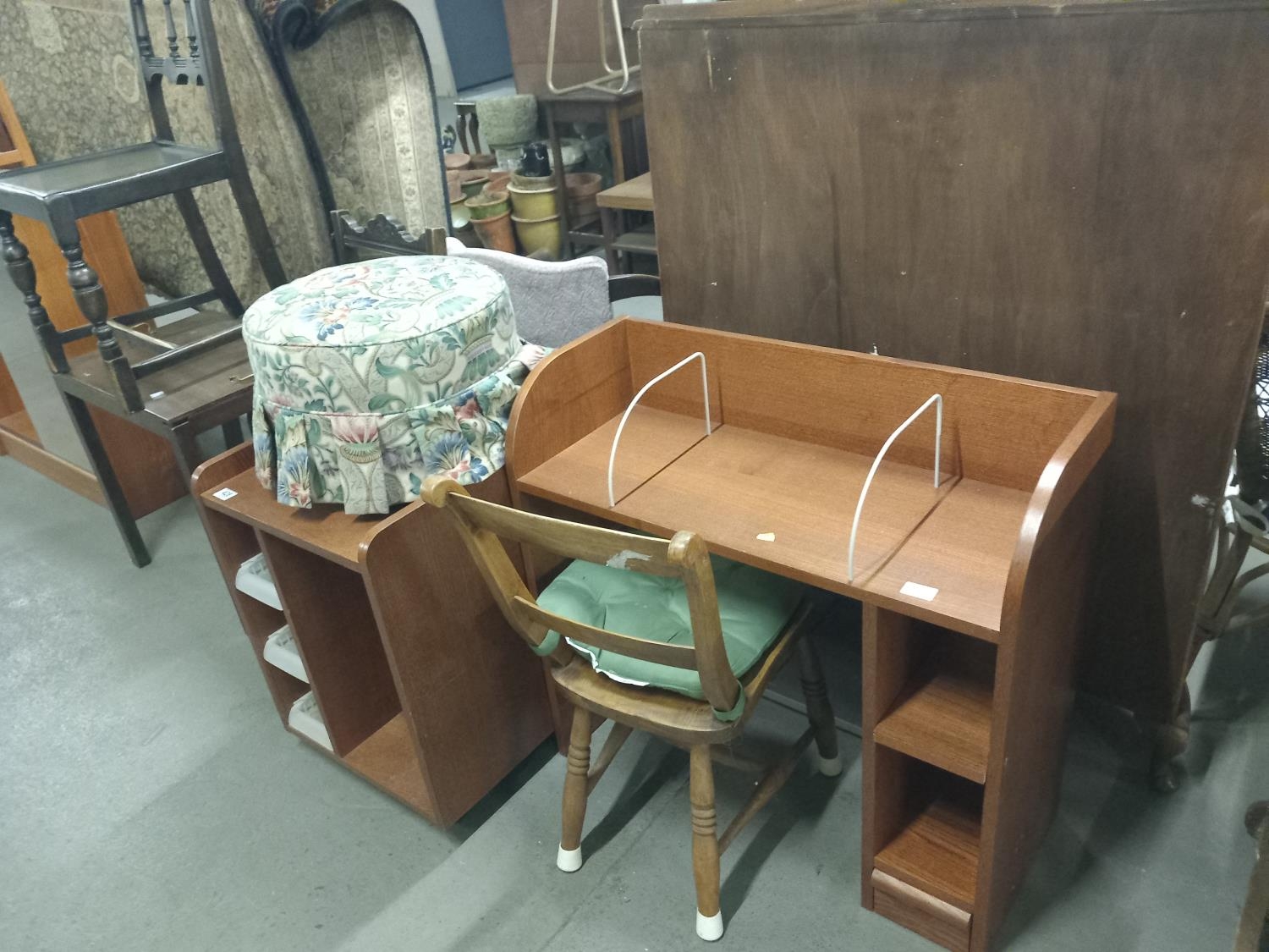 A small desk, chair, pouffe, butlers tray etc