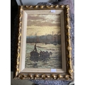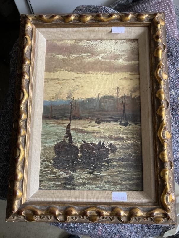 English School: 19th cent. Oil on board, Thames barges on the river at twilight, unsigned, framed. 13ins. x 8½ins.