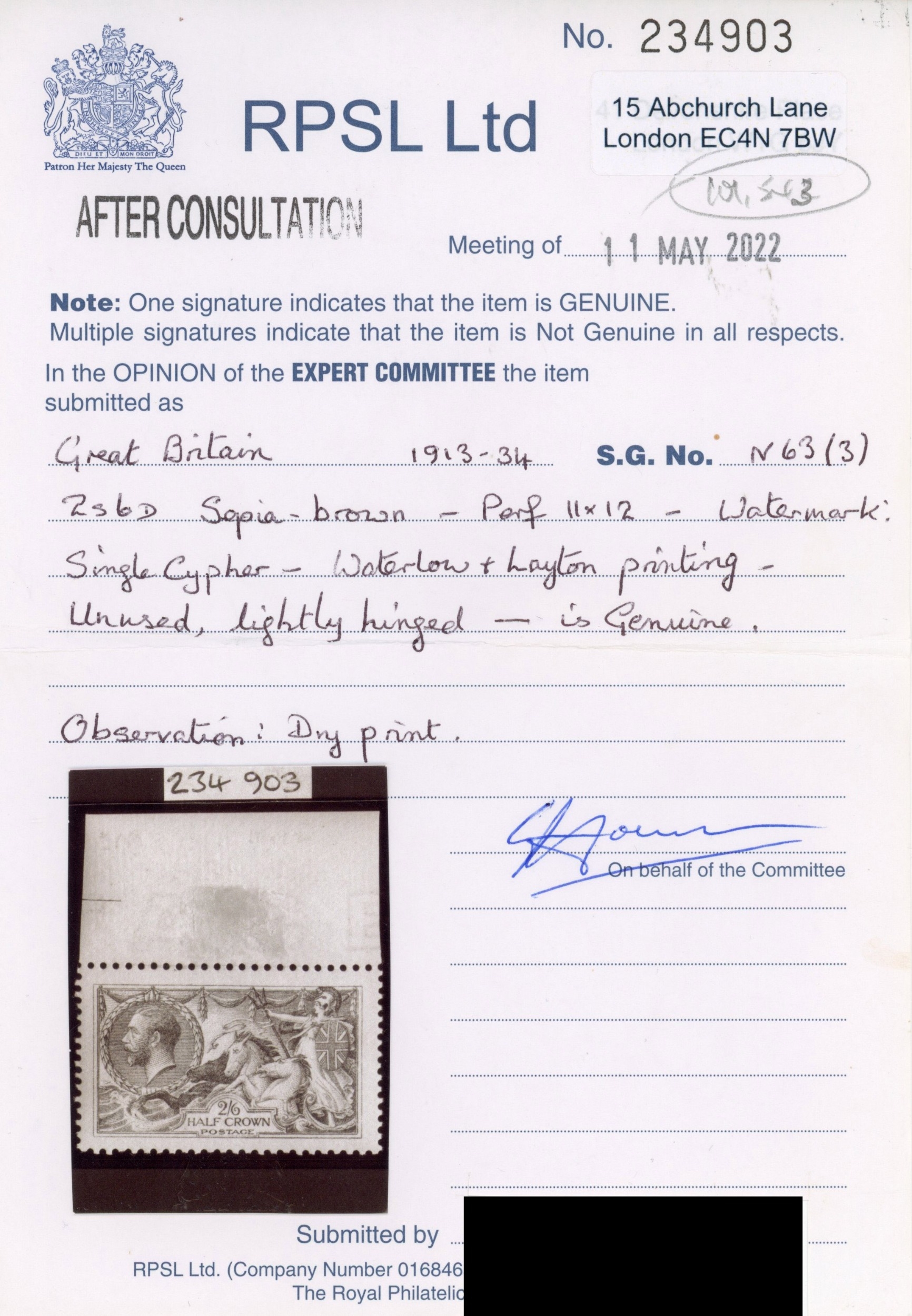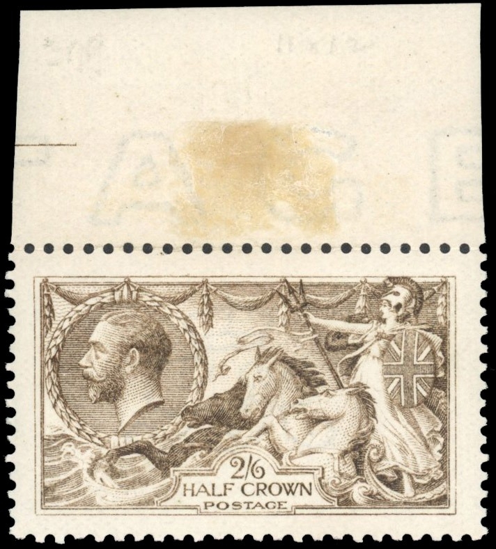 1913 Waterlow 2s6d sepia-brown, top marginal unmounted mint â??dry printâ?? resulting in a quite remarkable very pale shade, RPS Certificate (2022) stating â??sepia brownâ?¦dry printâ