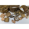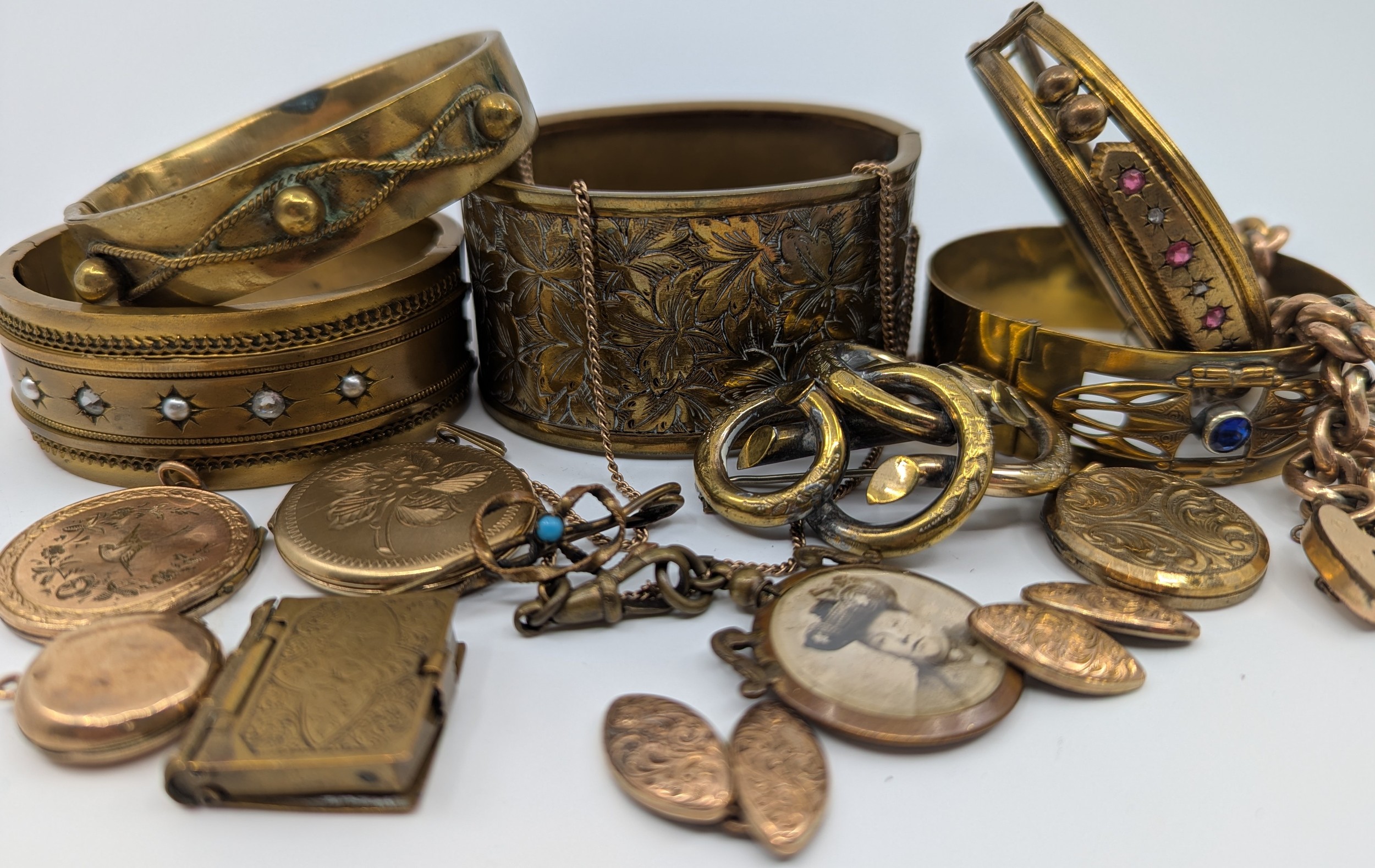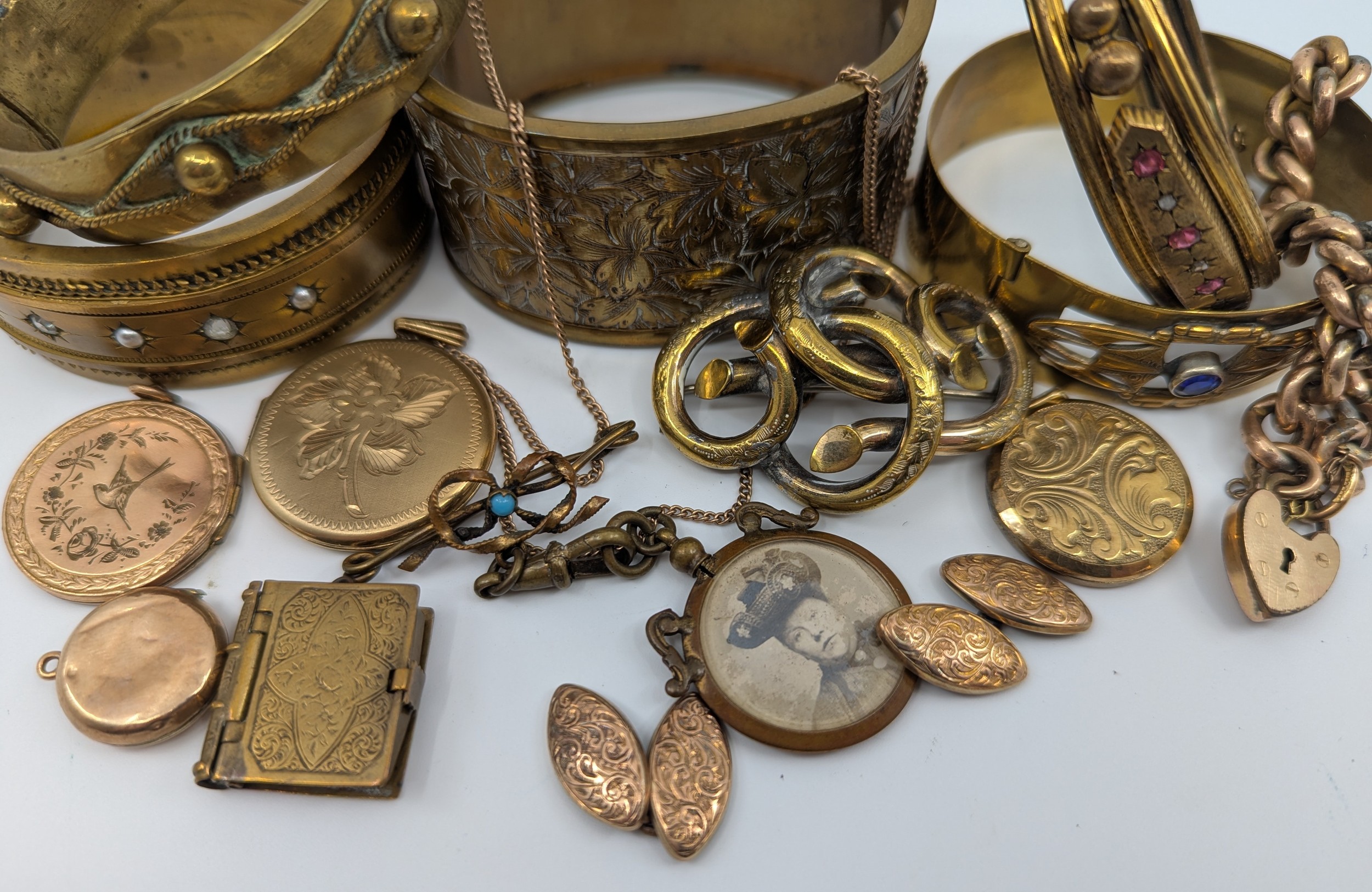 to include a "ROLLED GOLD" stamped round photograph locket pendant, a "ROLLED GOLD" stamped flower engraved round photograph locket pendant with chain, a base metal open photograph bow design pendant/brooch, and a base metal red and white paste stone half hinged bangle with safety chain