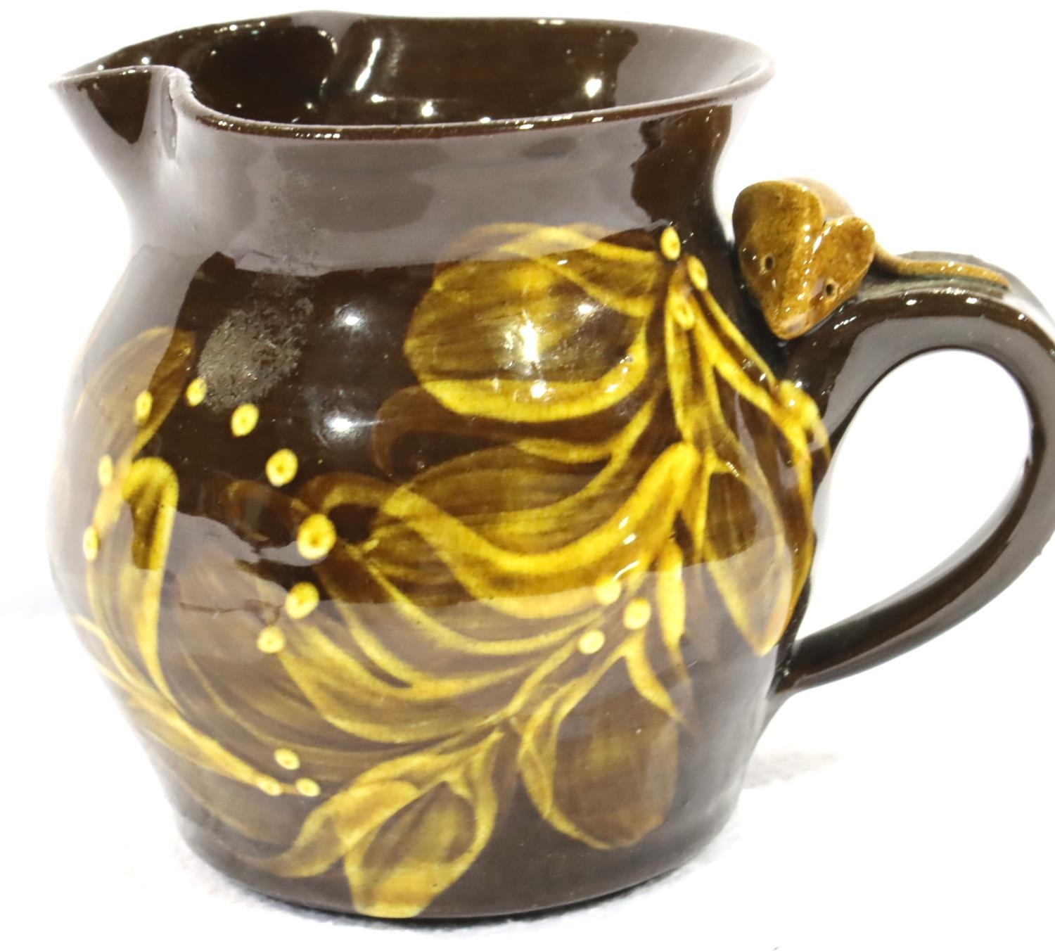 Slipware jug with decorative mouse to handle, H: 10 cm. No cracks, chips or visible restoration. P&P Group 1 (£14+VAT for the first lot and £1+VAT for subsequent lots)