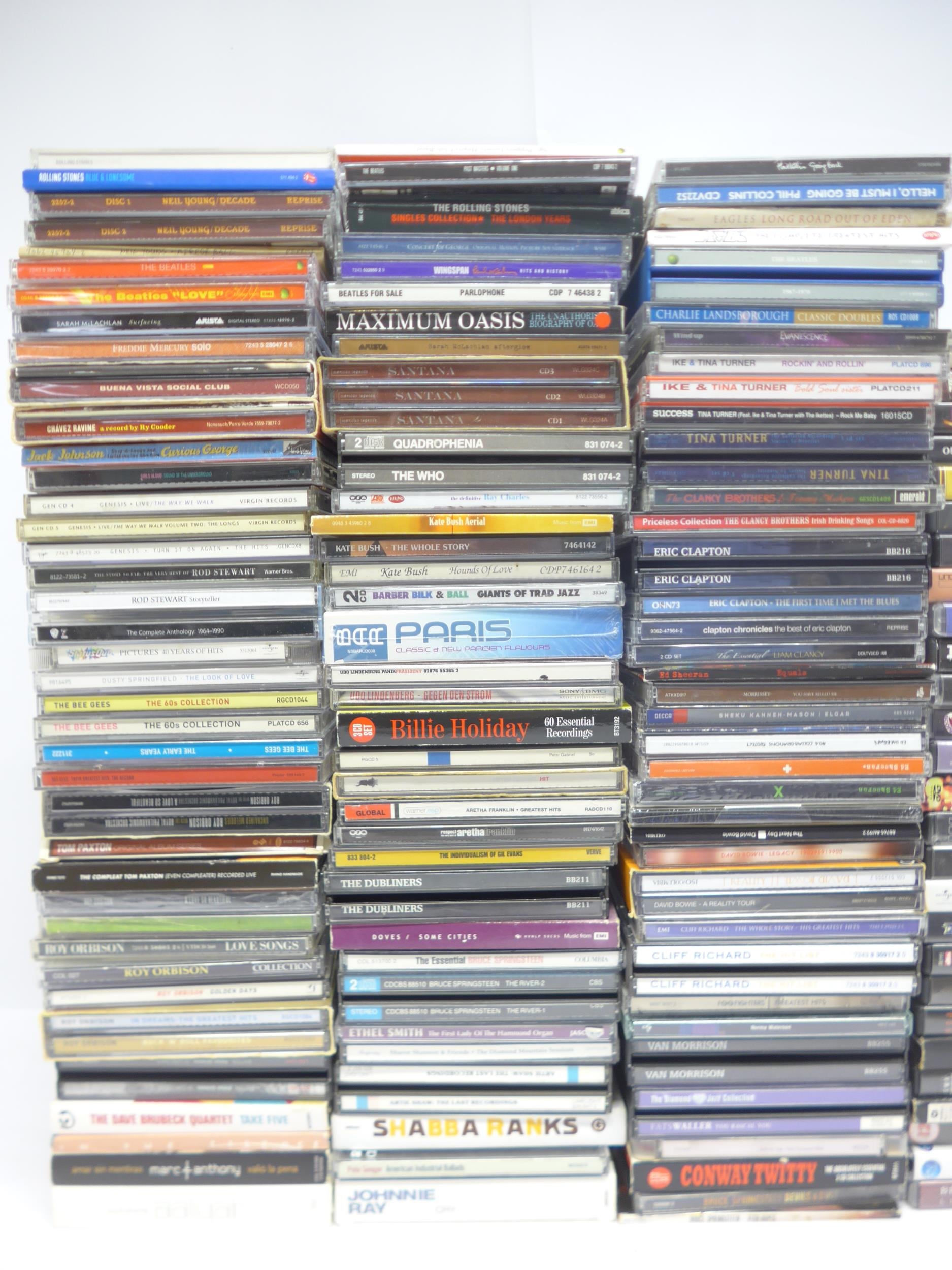 A collection of CDs and music DVDs, artists include The Beatles, Bob Dylan, The Rolling Stones, Kate Bush, Genesis, Oasis, Ike & Tina Turner, Queen, Van Morrisson, Santana, Neil Young, Eagles, Bruce Springsteen, Aretha Franklin, Gil Evans, Ed Sheeran, Dave Brubeck, Roy Orbison, Eric Clapton, The Who, etc. (approx. 170). Together with Neil Young 'After The Gold Rush' LP and Bee Gees 'Tales From The Brothers Gibb' cassette box set