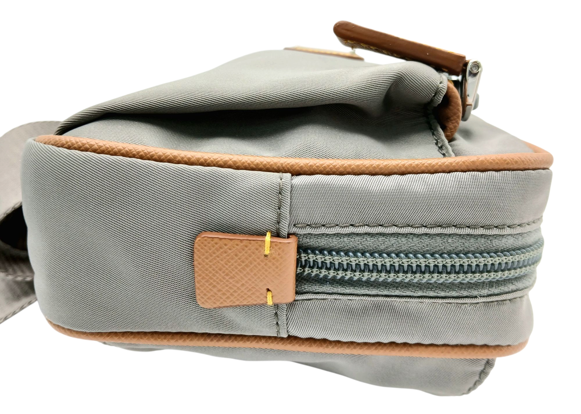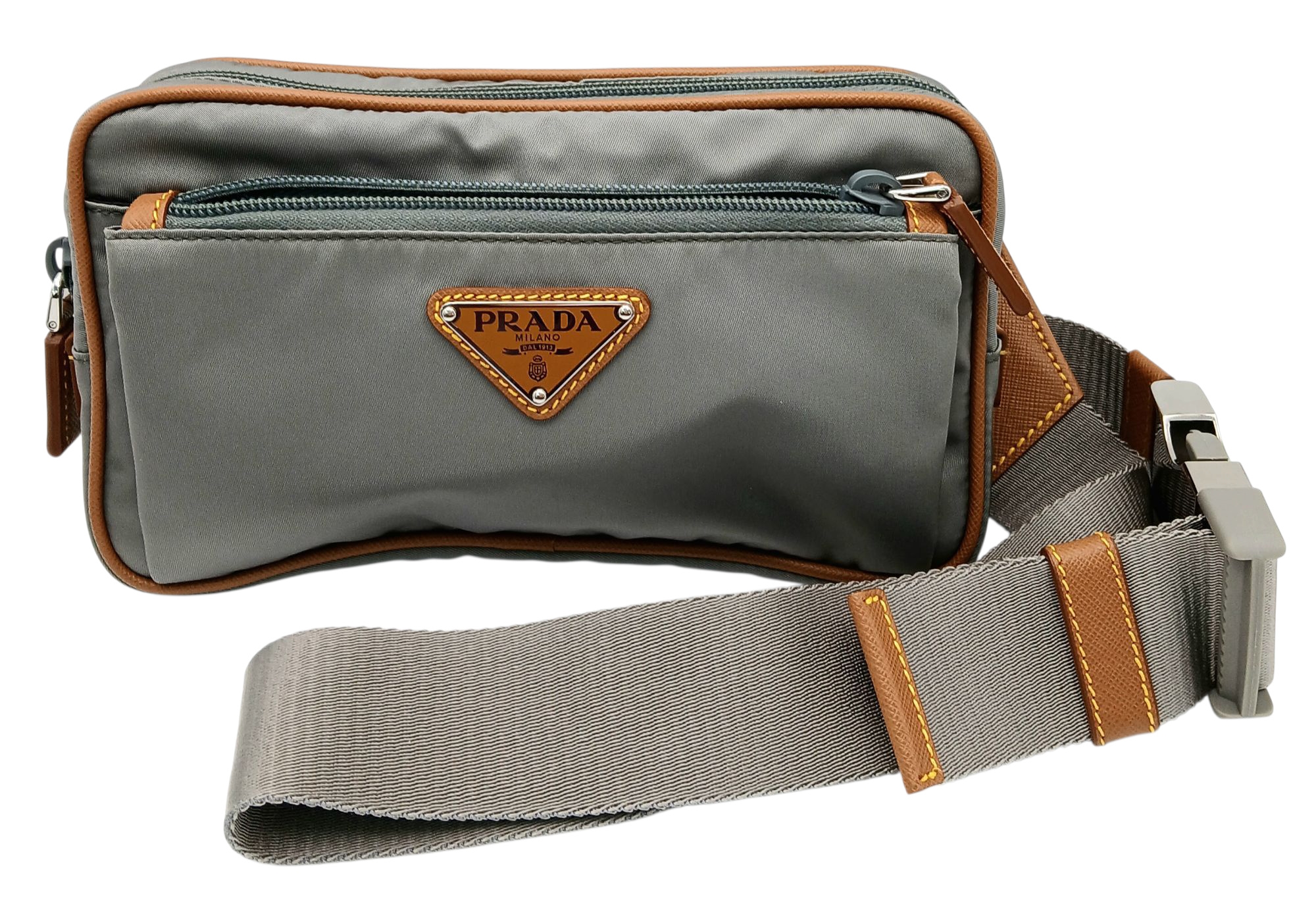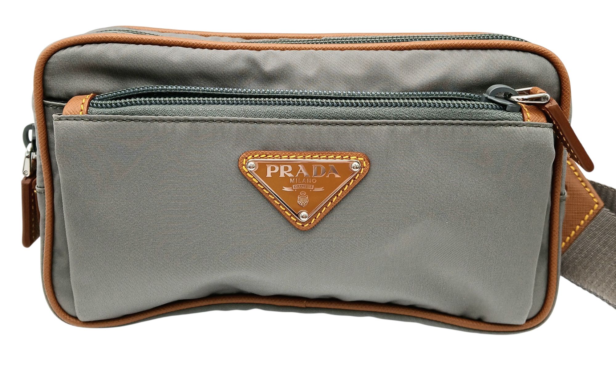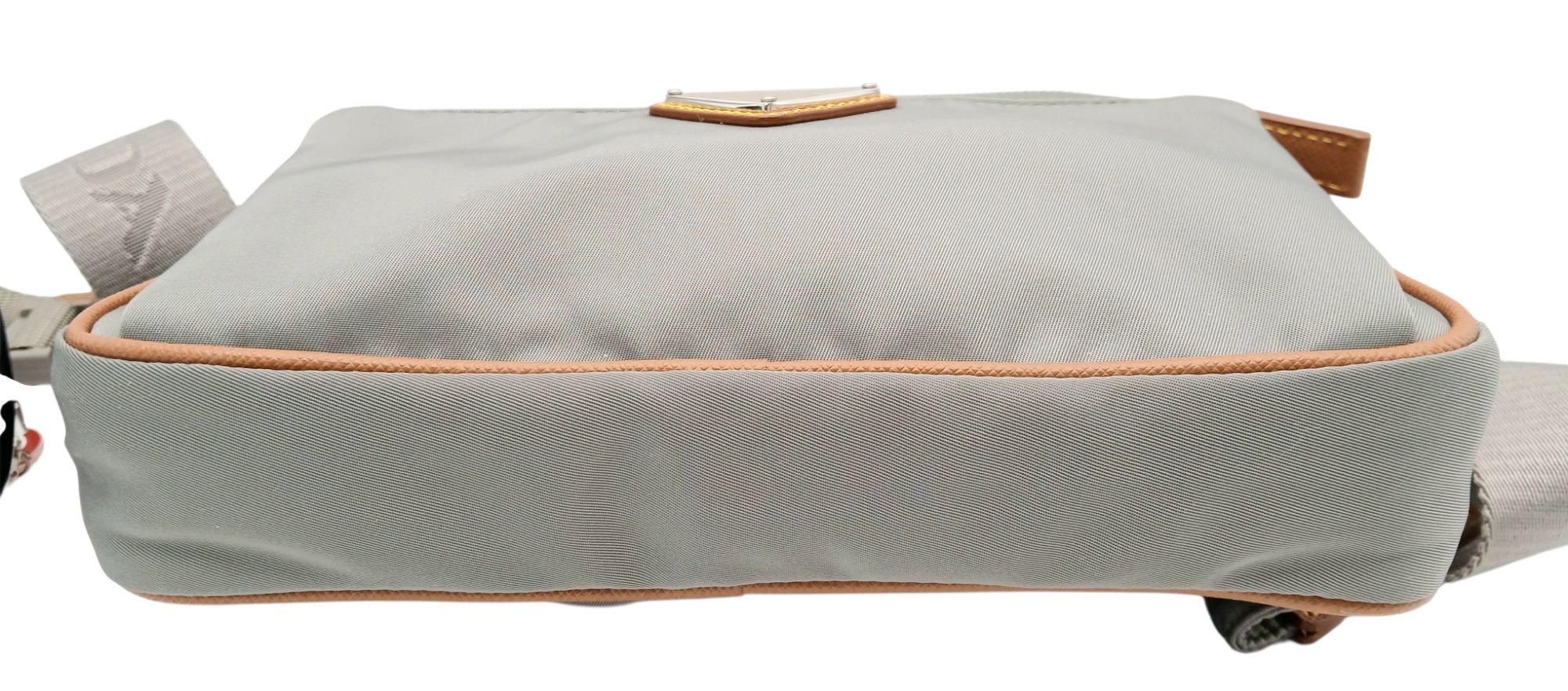 A Prada Grey Nylon and Leather Trim Belt Bag. Grey nylon exterior with tan leather trim, silver-toned hardware, and a front zip pocket. Features a grey adjustable webbing strap with a silver-toned Prada-engraved buckle fastening. Black textile interior includes one main compartment and a zipped side pocket. In very good condition. Approx 22cm width x 12cm height x 4cm depth. Please see photos or request a condition report. Ref: STK022909