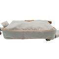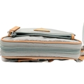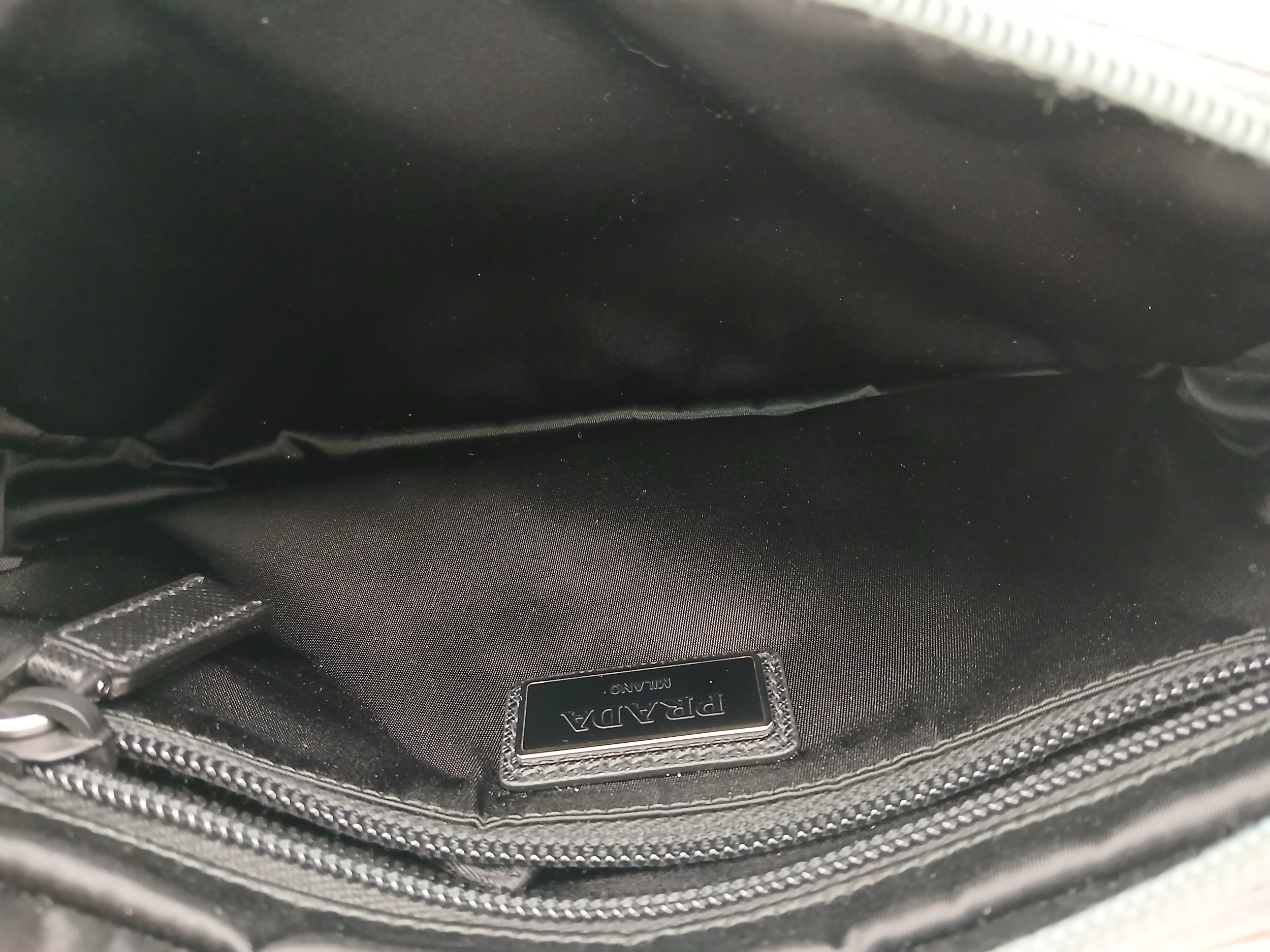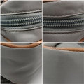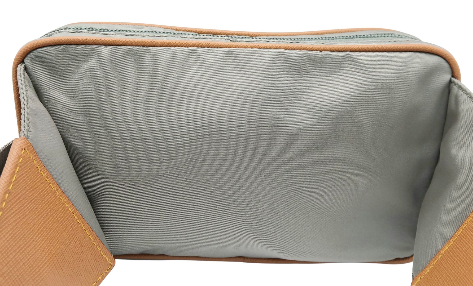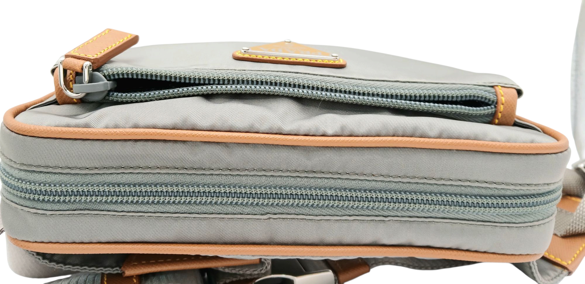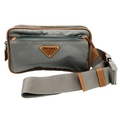 A Prada Grey Nylon and Leather Trim Belt Bag. Grey nylon exterior with tan leather trim, silver-toned hardware, and a front zip pocket. Features a grey adjustable webbing strap with a silver-toned Prada-engraved buckle fastening. Black textile interior includes one main compartment and a zipped side pocket. In very good condition. Approx 22cm width x 12cm height x 4cm depth. Please see photos or request a condition report. Ref: STK022909