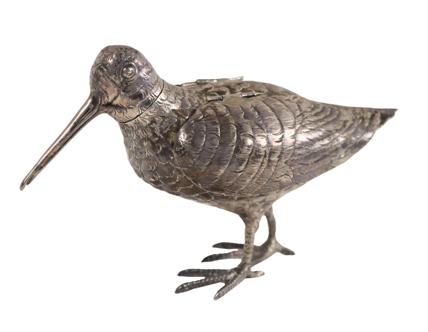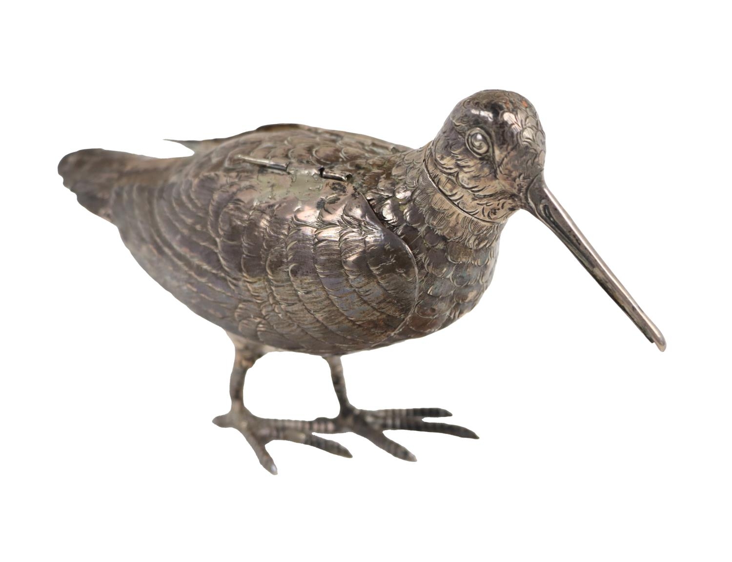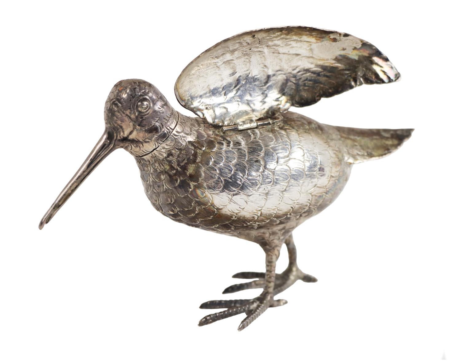 A fine quality silver Novelty Condiment, modelled as a snipe with removable head, and hinged wings acting as handles, hallmarked London, by Berthold Hermann Muller, c. 1912, approx. 6.8 ounces. (1)