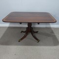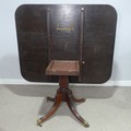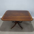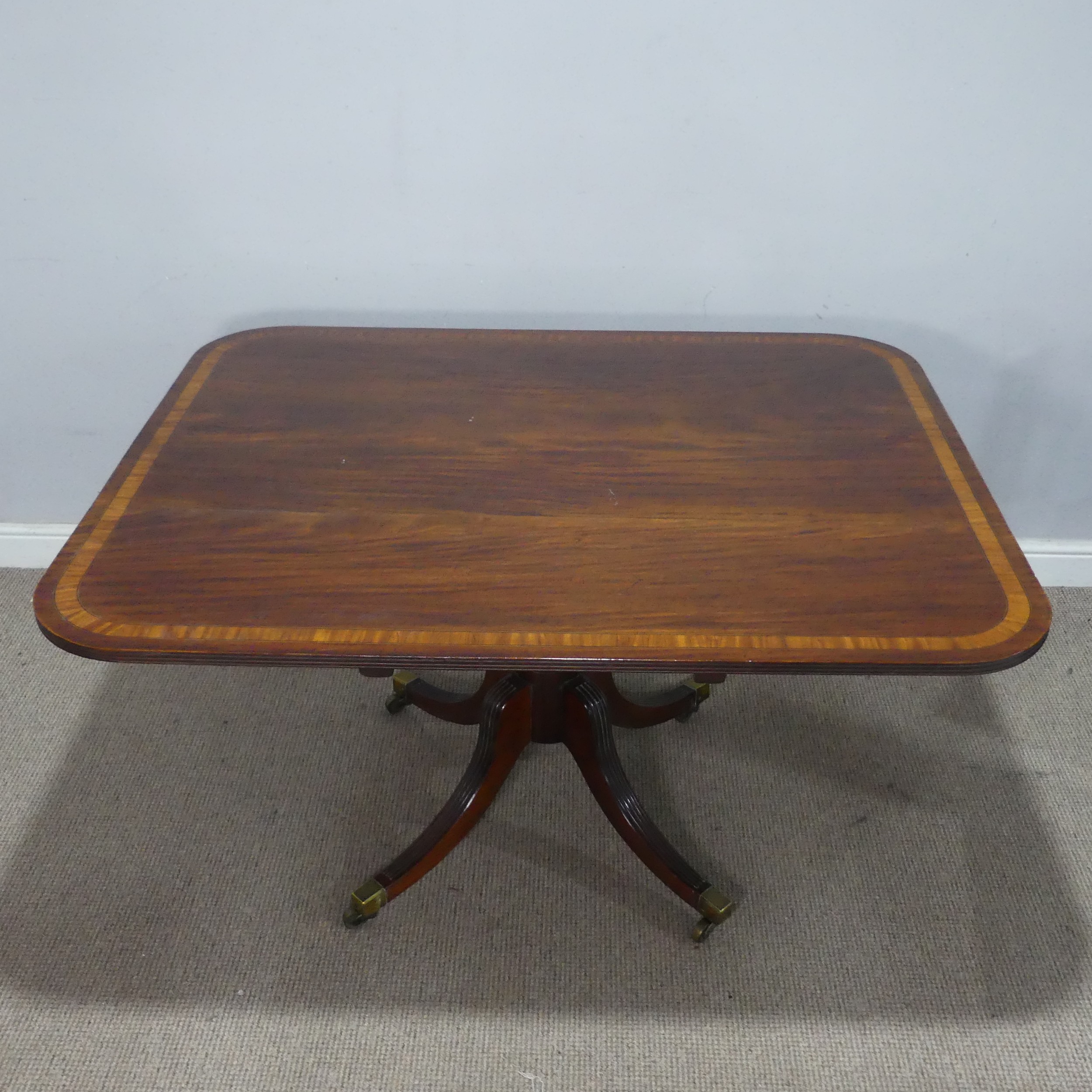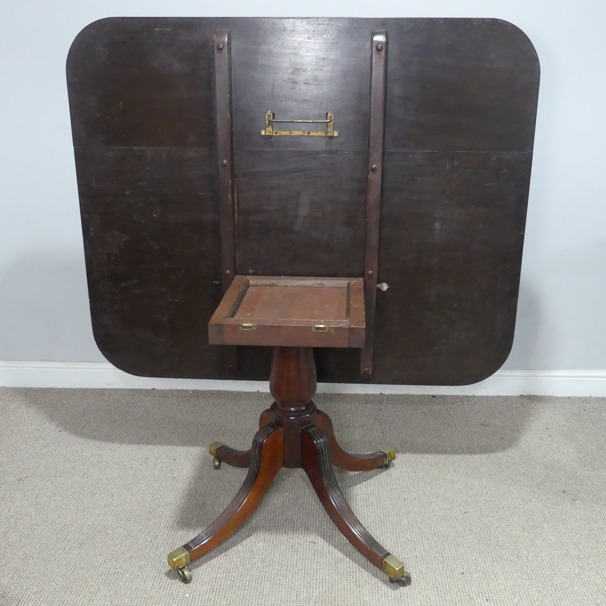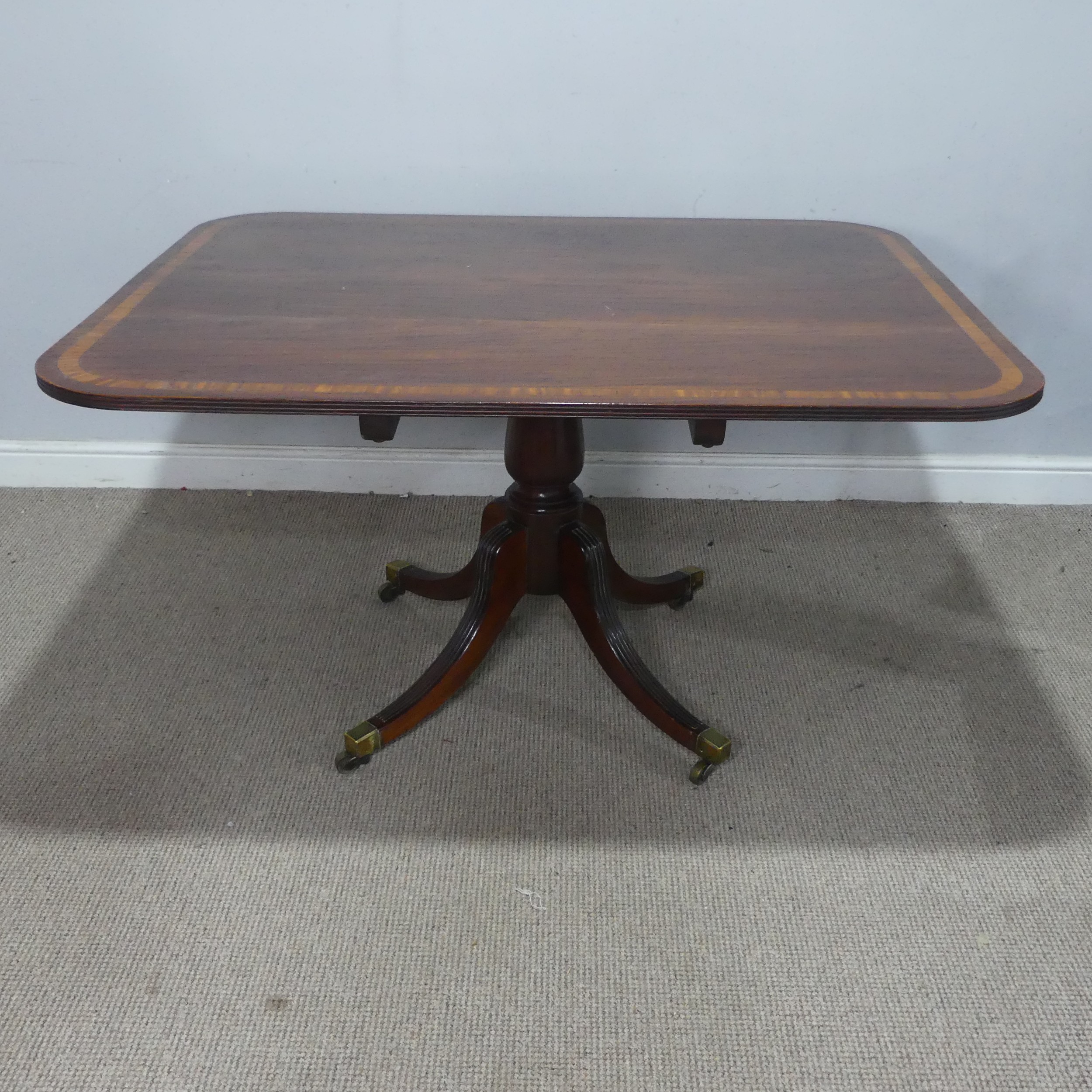 A Georgian mahogany tilt-top breakfast Table, the rectangular top raised upon a reeded quadriform base, terminating to castors, W 130 cm x H 72 cm x D 108 cm.