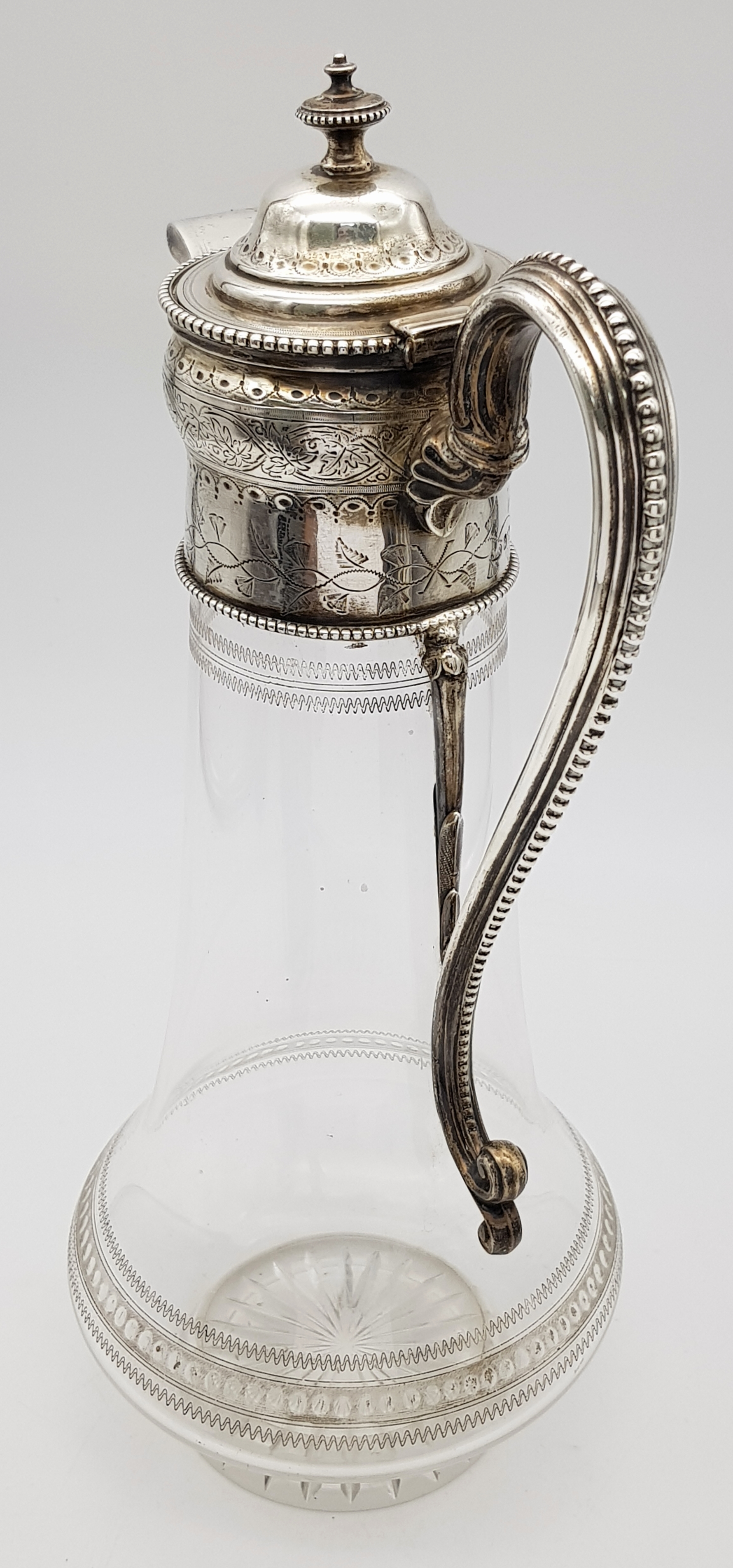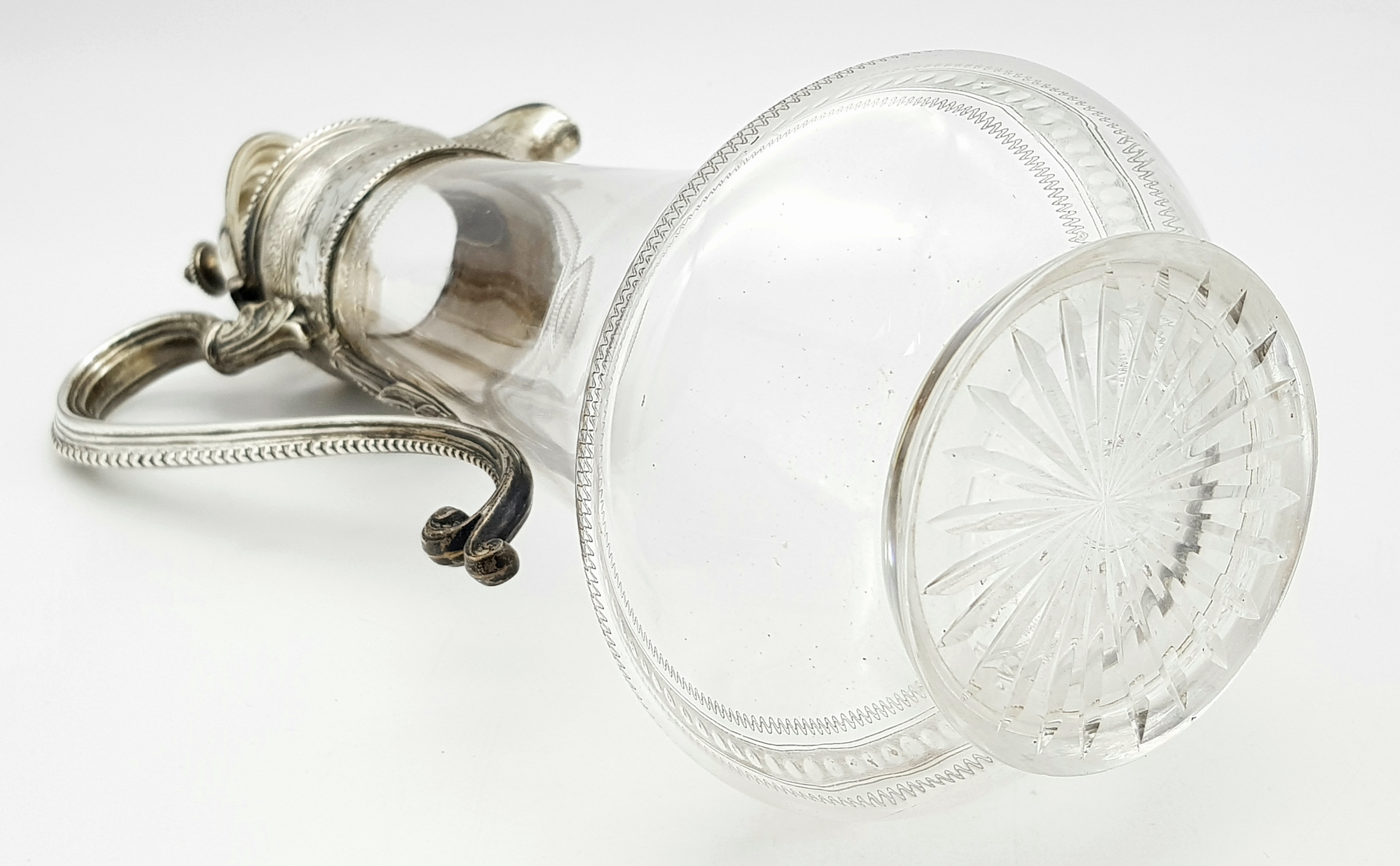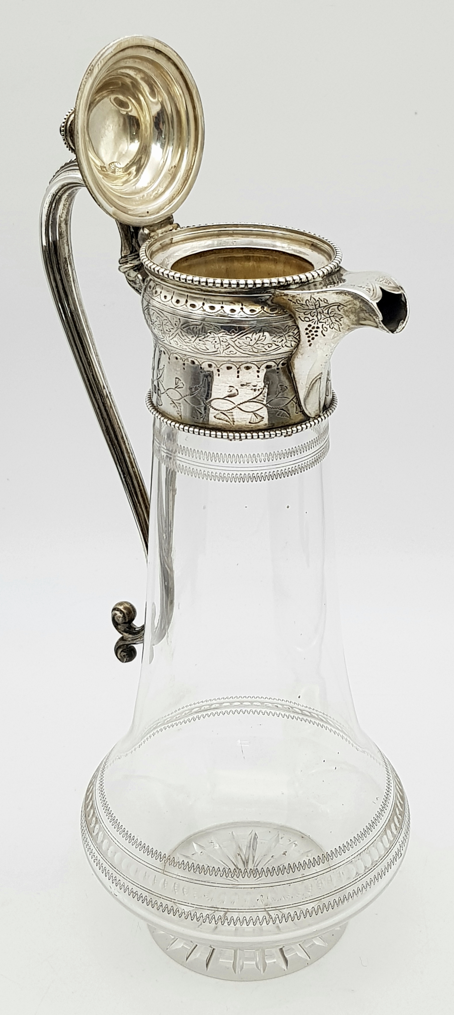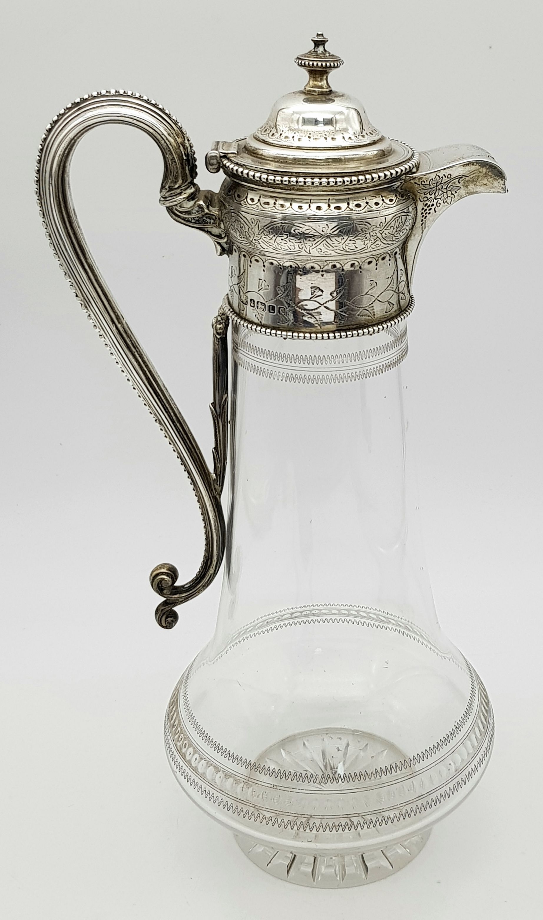 An Antique Victorian Cut Glass Claret Jug with Sterling Silver Scrolled Handle, Lid with ornate finial and decorative collar. Hallmarks for Sheffield 1878. Makers mark of James Round and Sons. 30cm tall. 749g total weight.