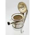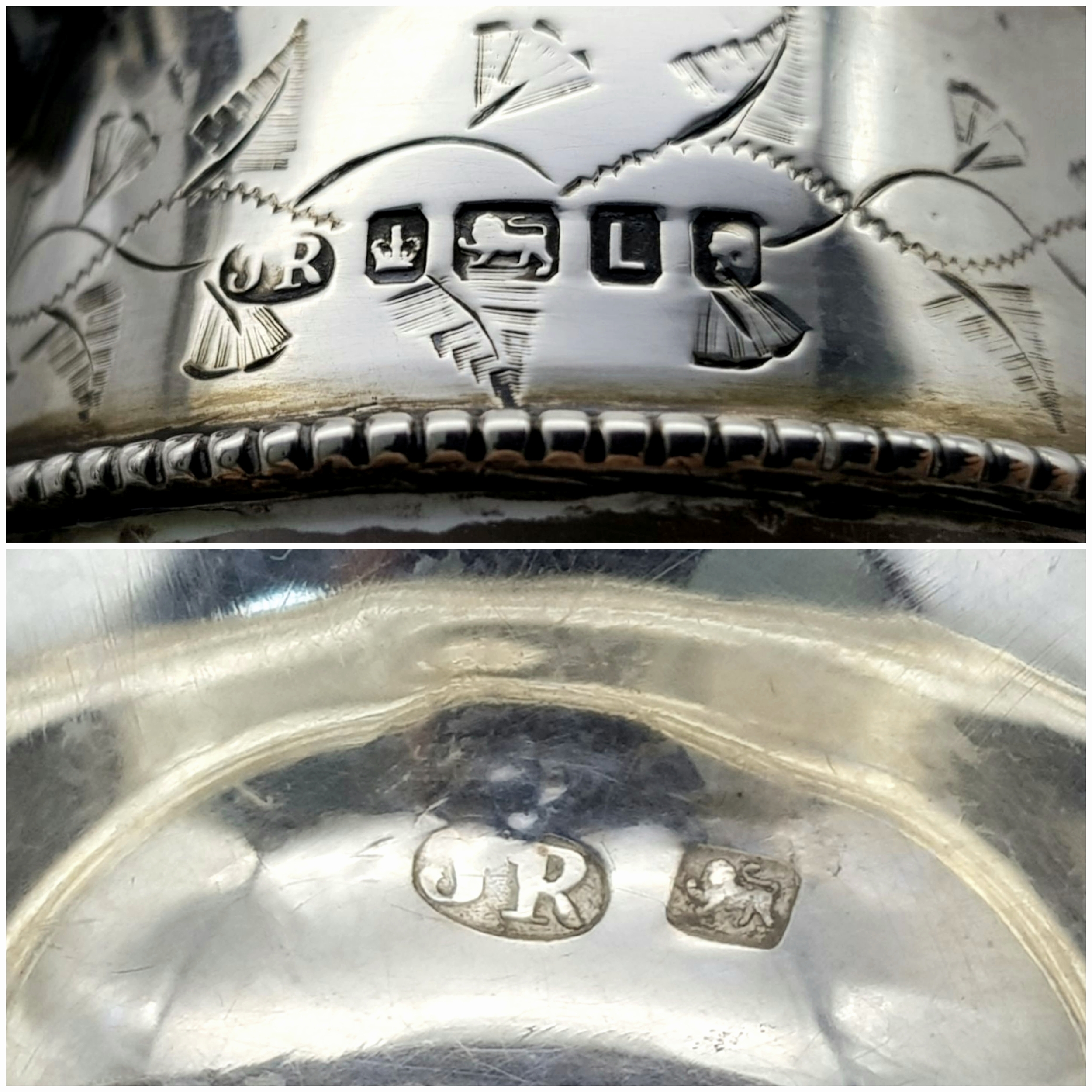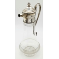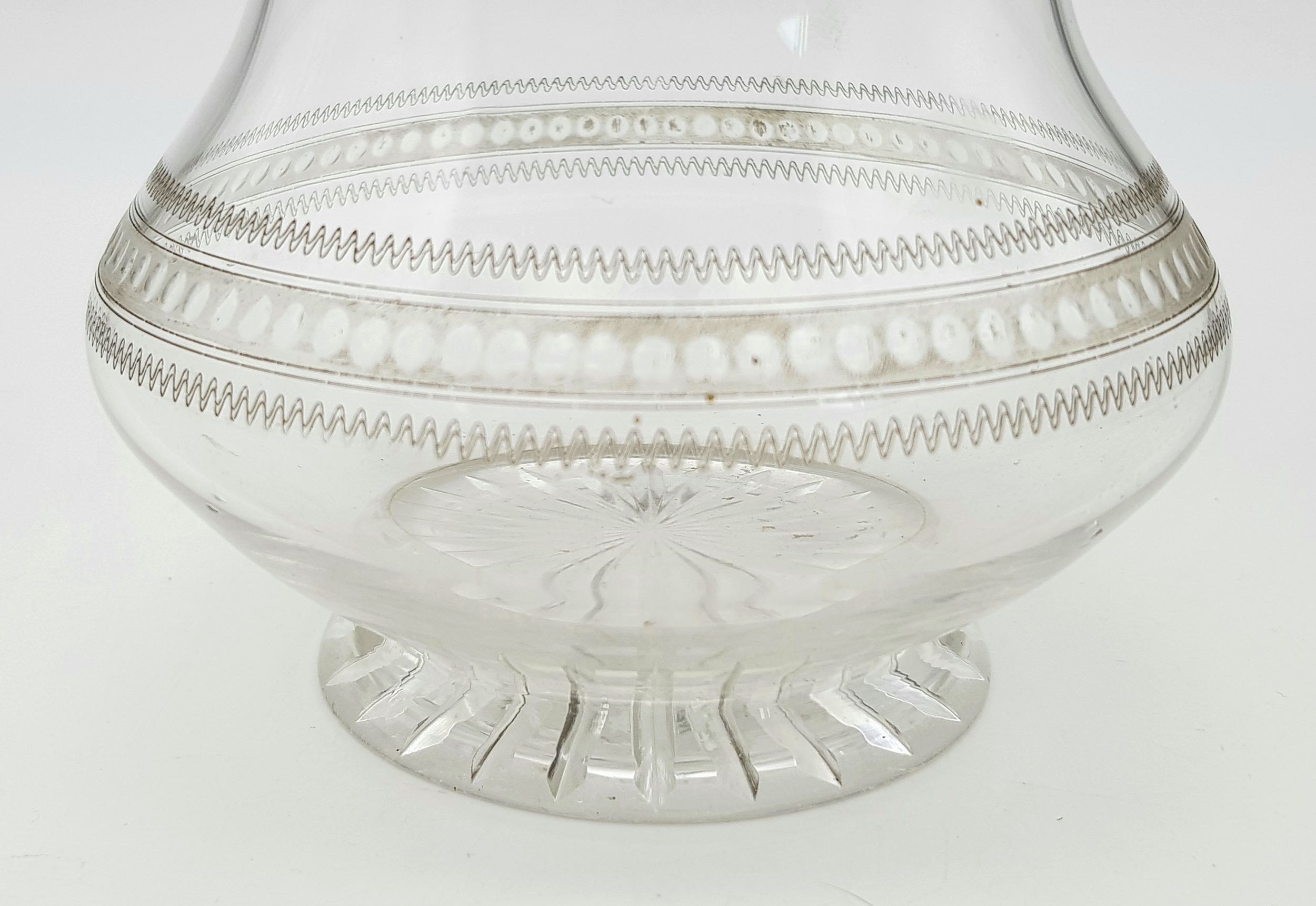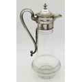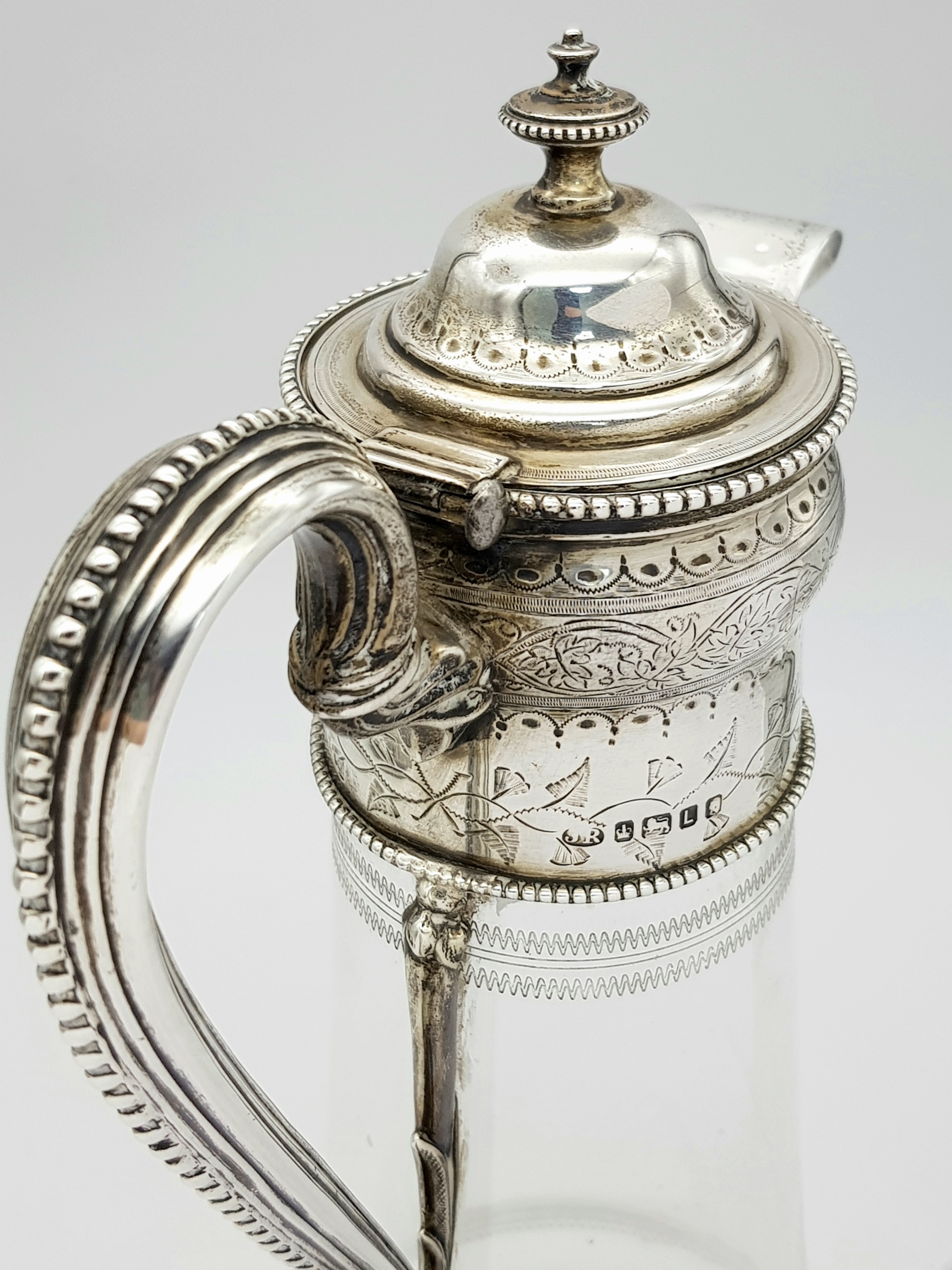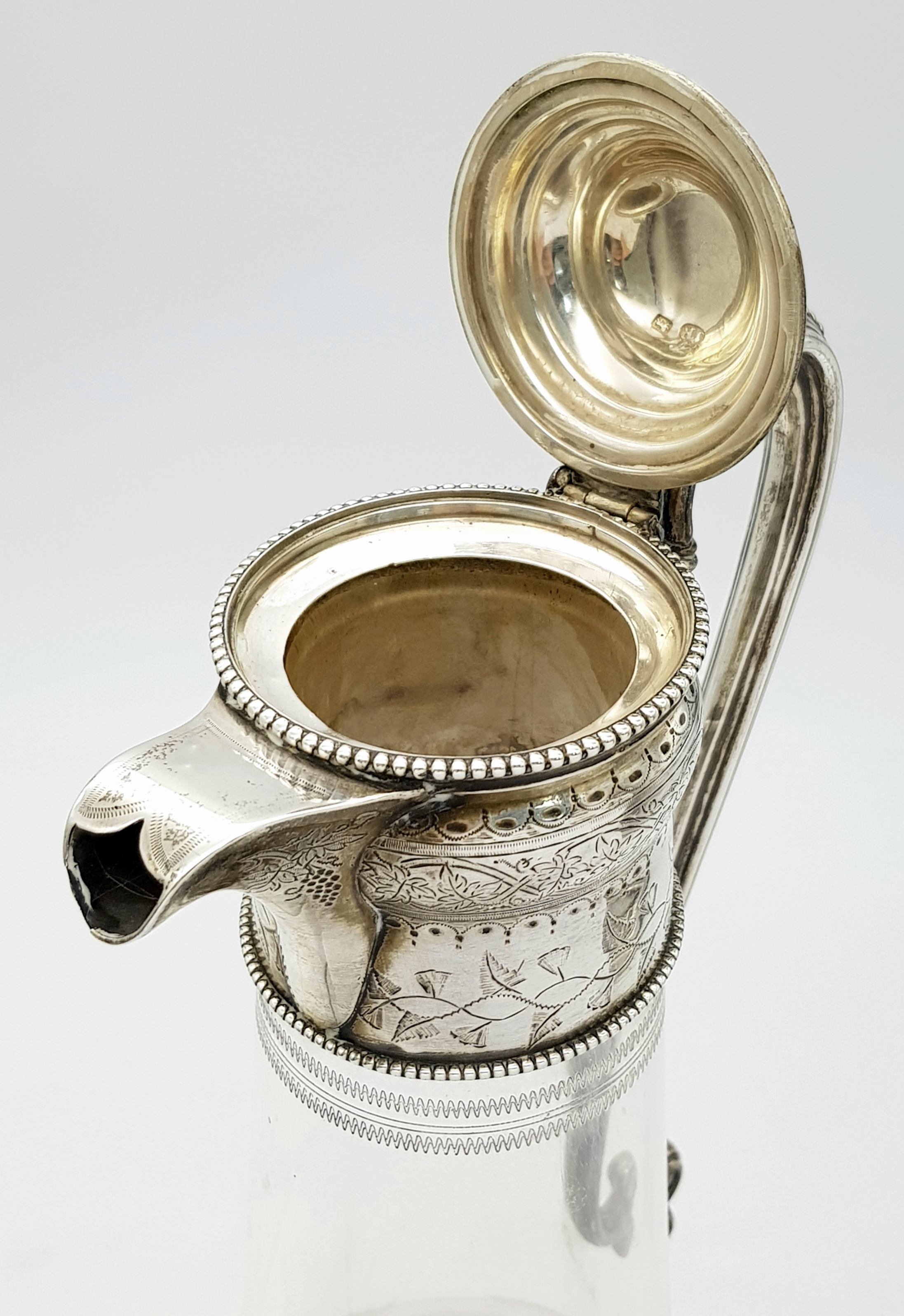 An Antique Victorian Cut Glass Claret Jug with Sterling Silver Scrolled Handle, Lid with ornate finial and decorative collar. Hallmarks for Sheffield 1878. Makers mark of James Round and Sons. 30cm tall. 749g total weight.