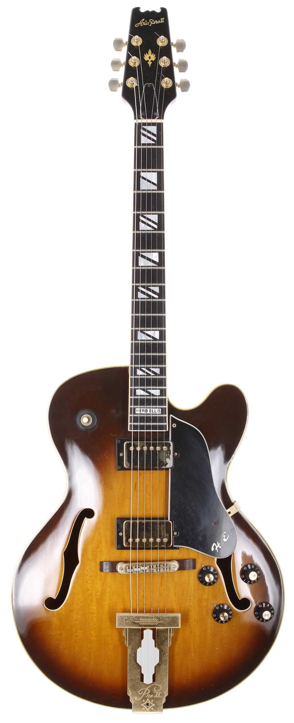 1981 Aria Pro II PE-175 Herb Ellis hollow body electric guitar, made in Japan; Body: sunburst finish maple, light surface marks; Neck: mahogany; Fretboard: ebony with pearl split block position markers; Frets: good, mild tarnishing; Electrics: working; Hardware: generally good, typical loss to gold plating including to the treble edge of neck pickup; Case: Maton branded Hiscox hard case; Weight: 3.47kg; Overall condition: good for age