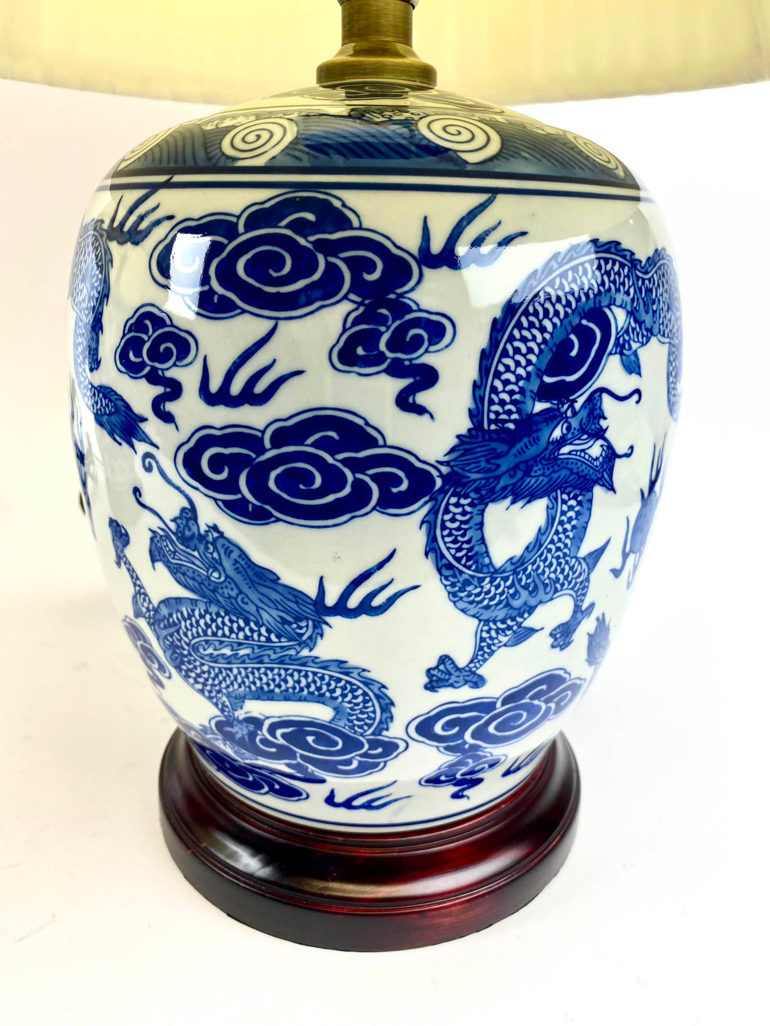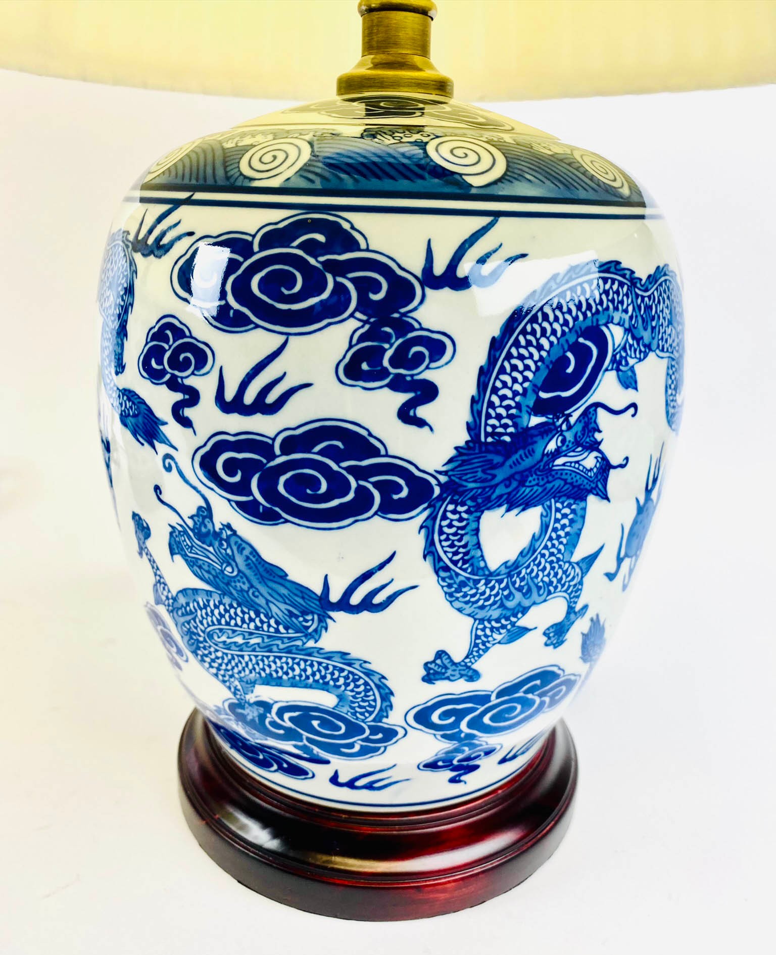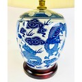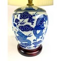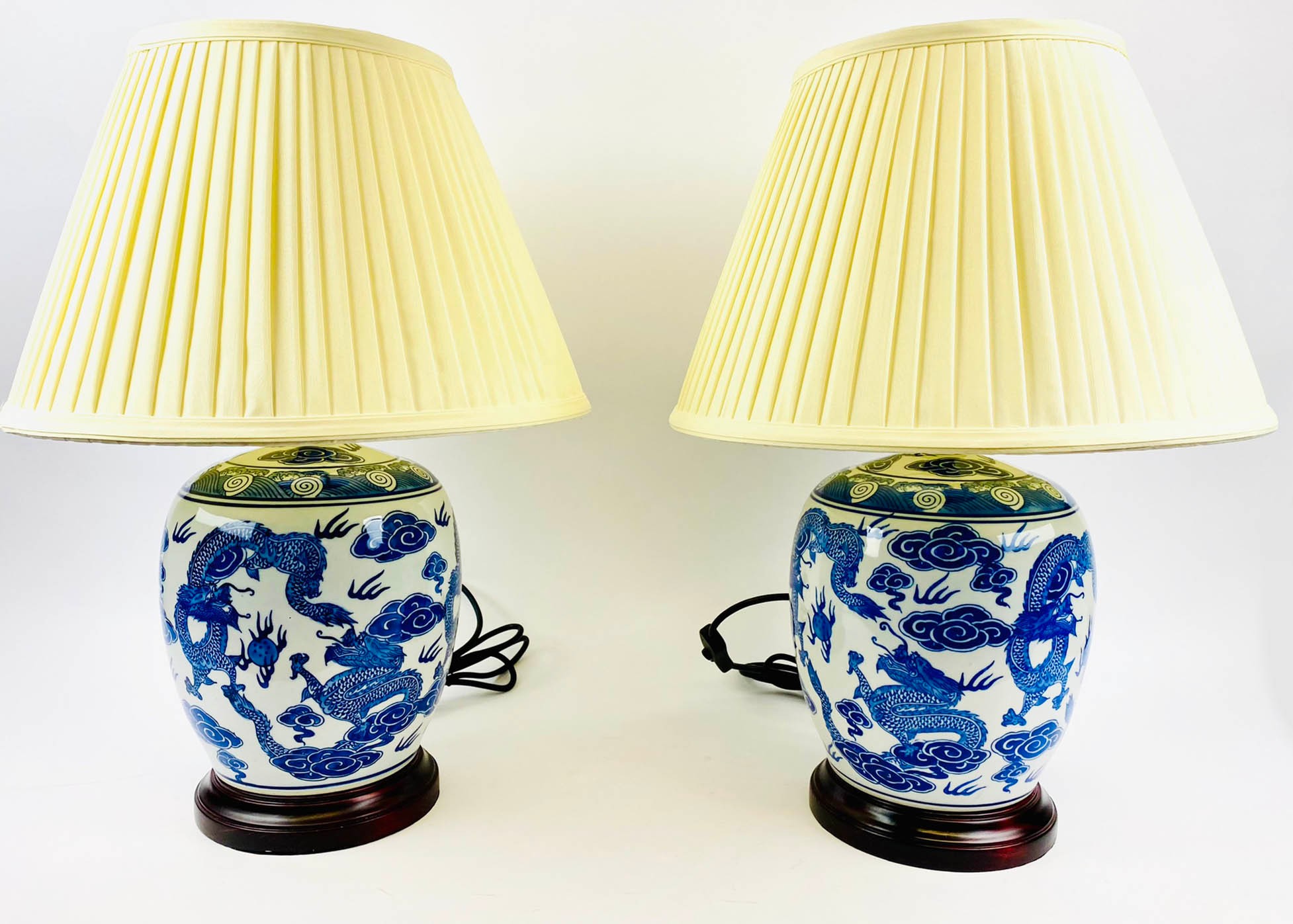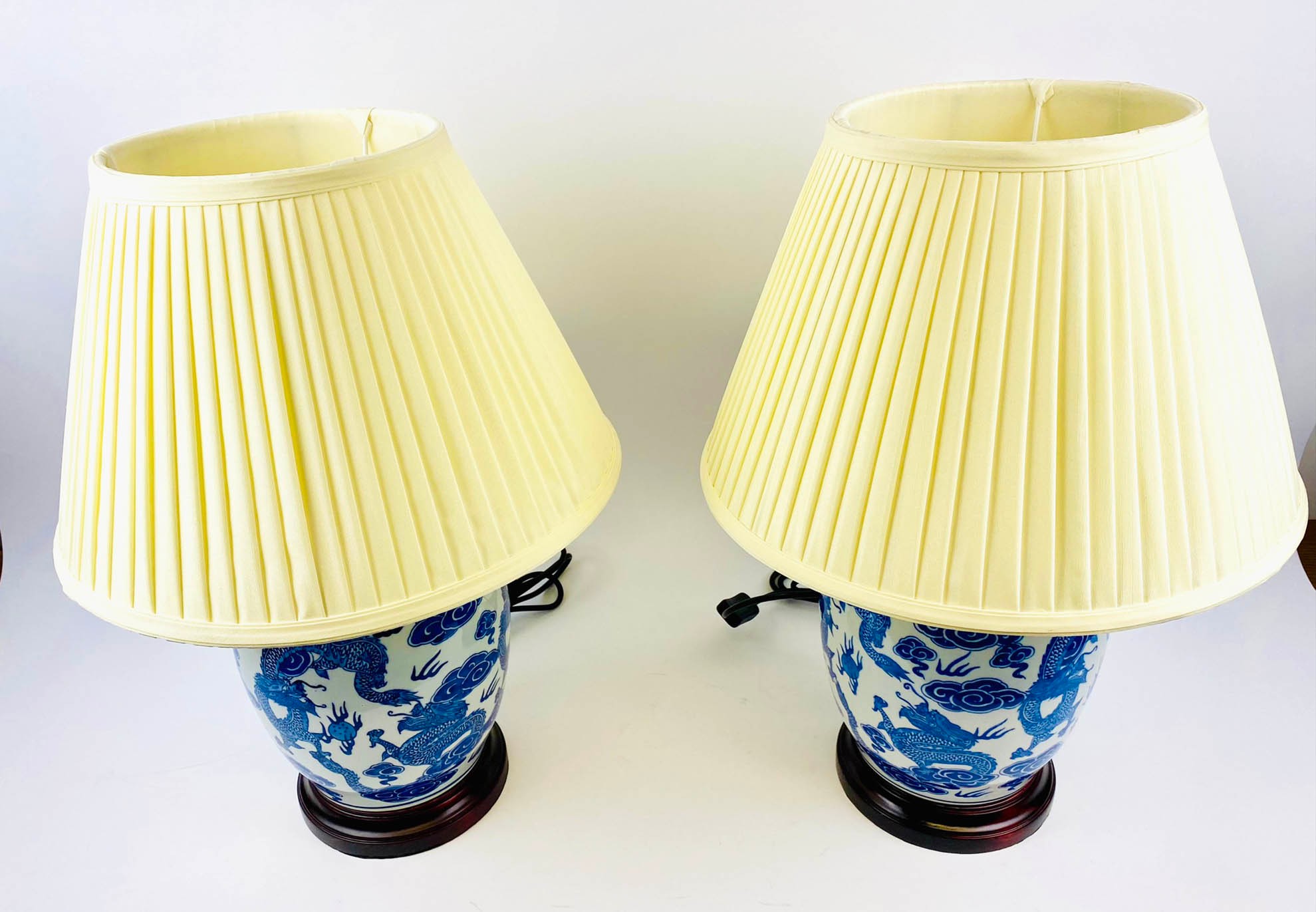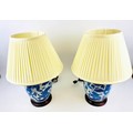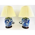 TABLE LAMPS, a pair, 54cm H x 38cm diam., Export style, Chinese blue and white ceramic, with shades. (2)