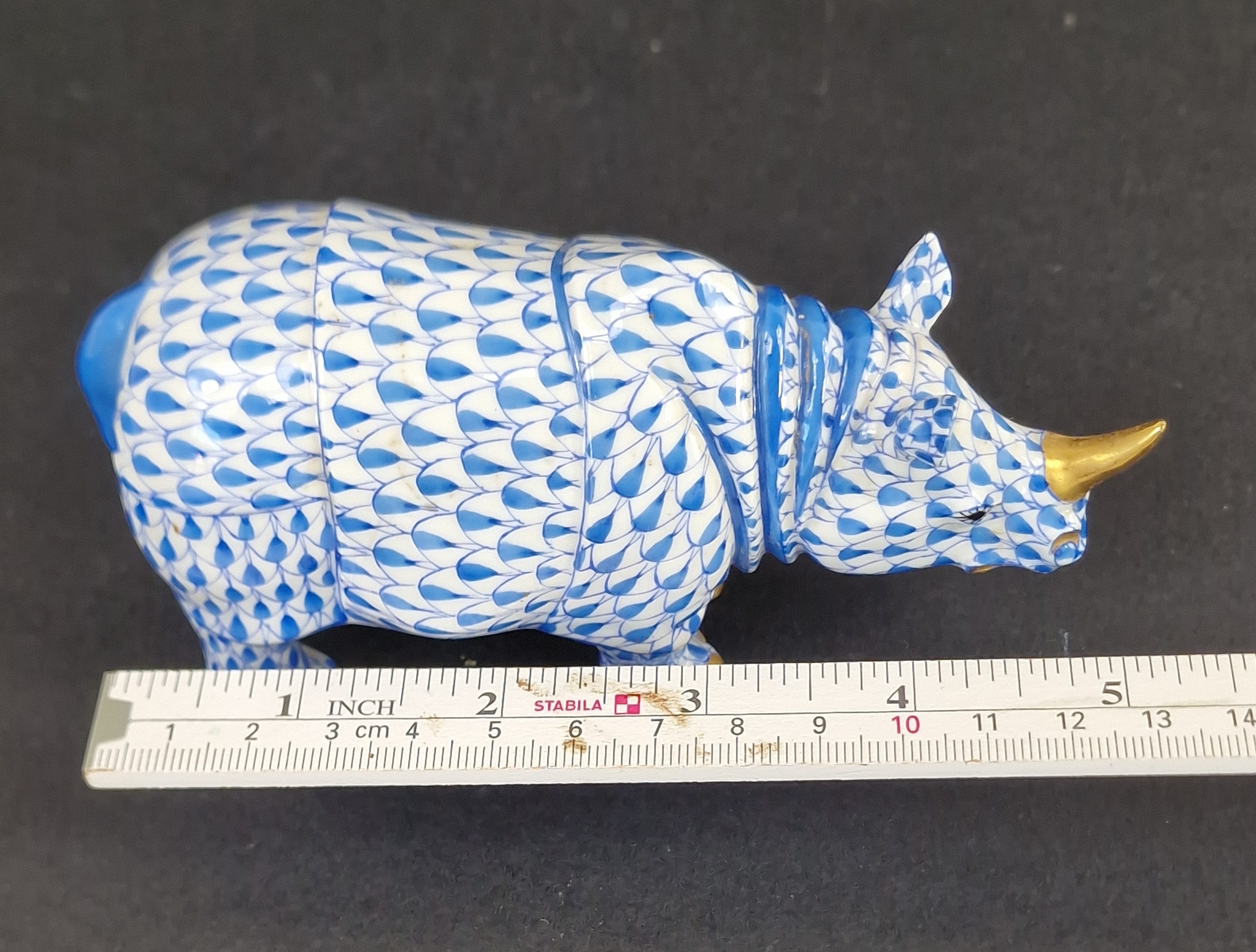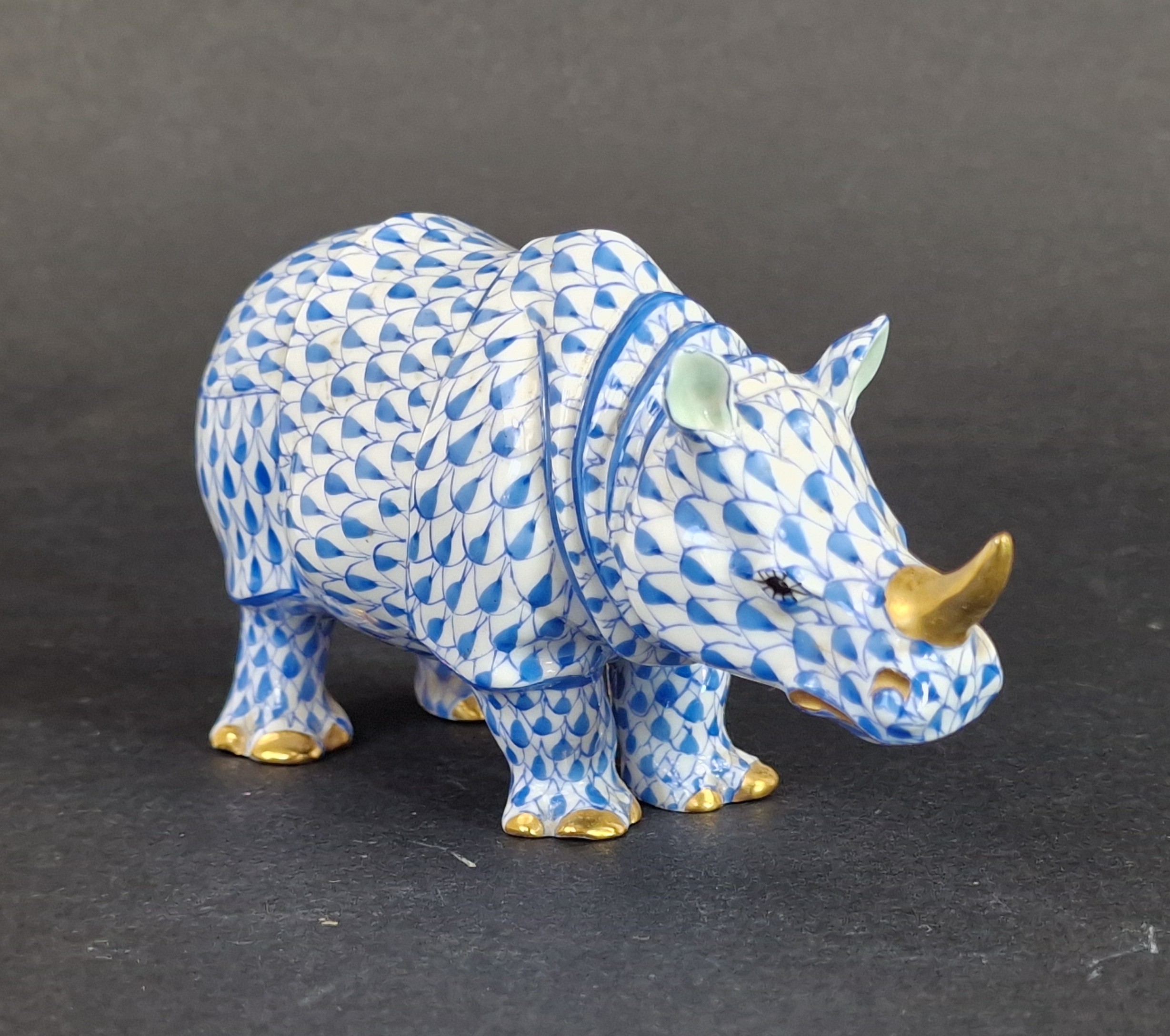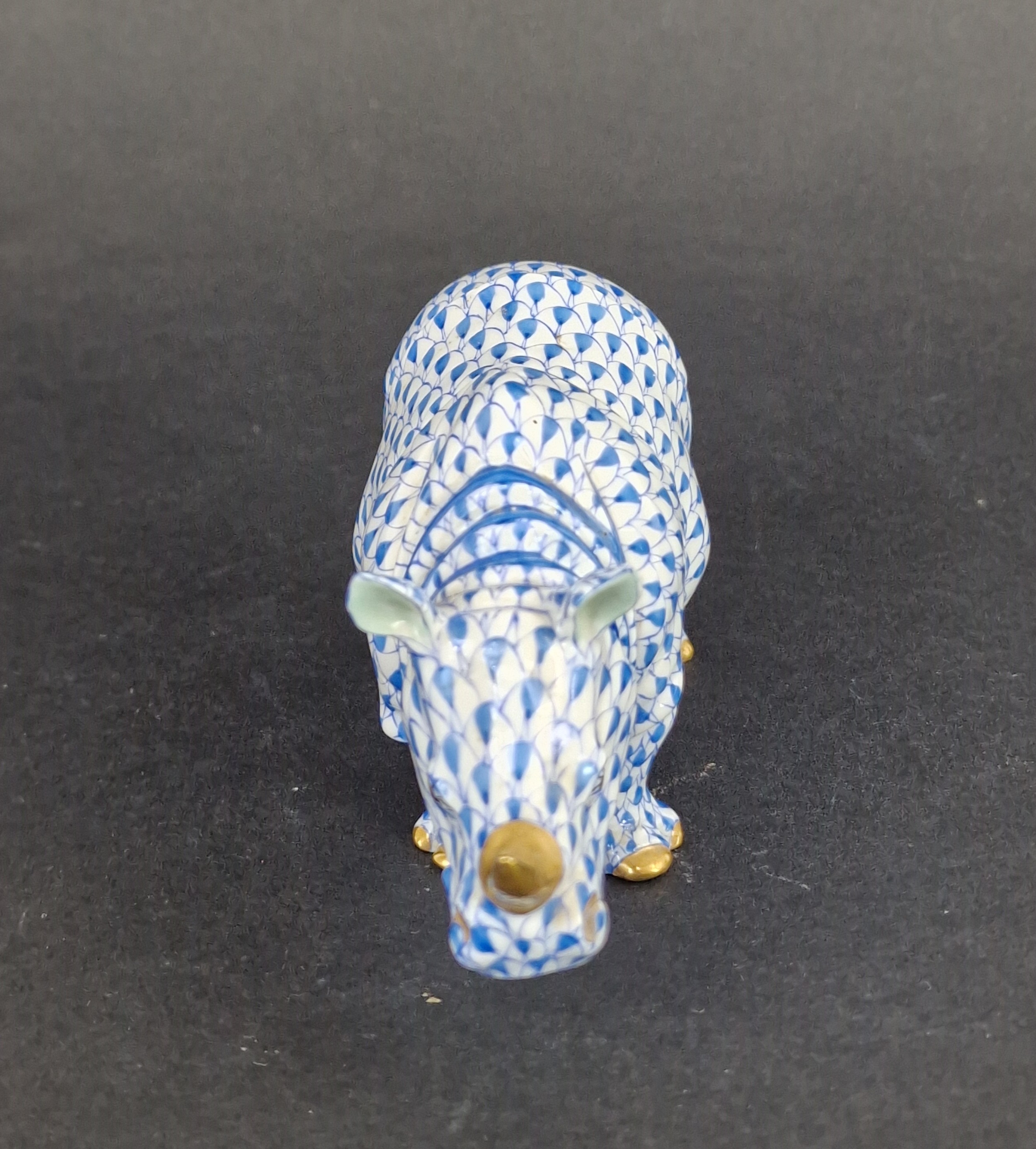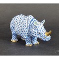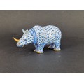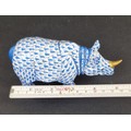 Herend Porcelain Rhino - Hand Painted in Blue Fishnet pattern with gilt embellishments 13cm long