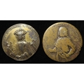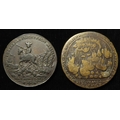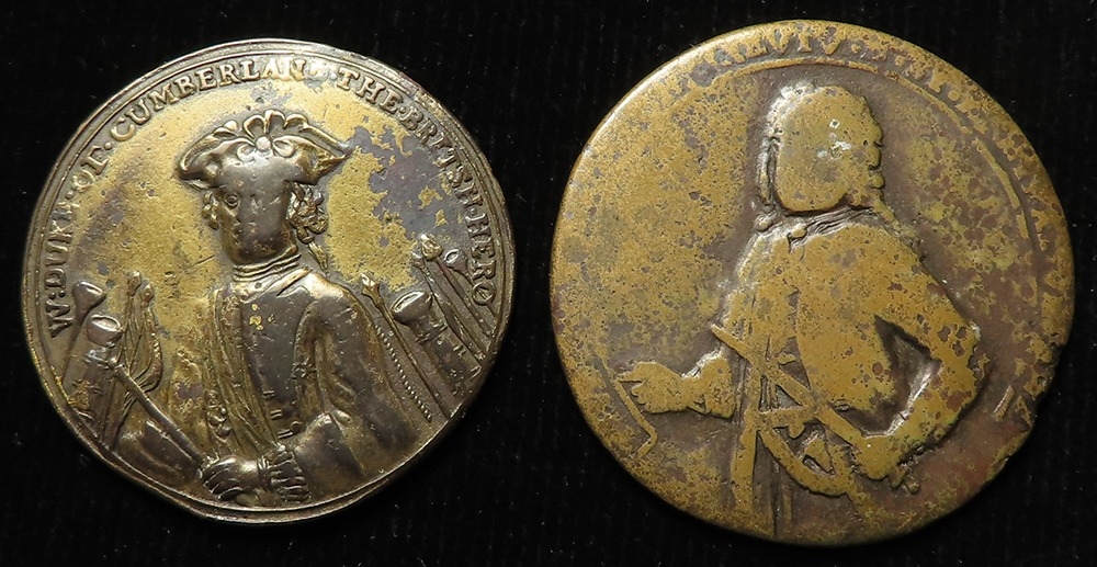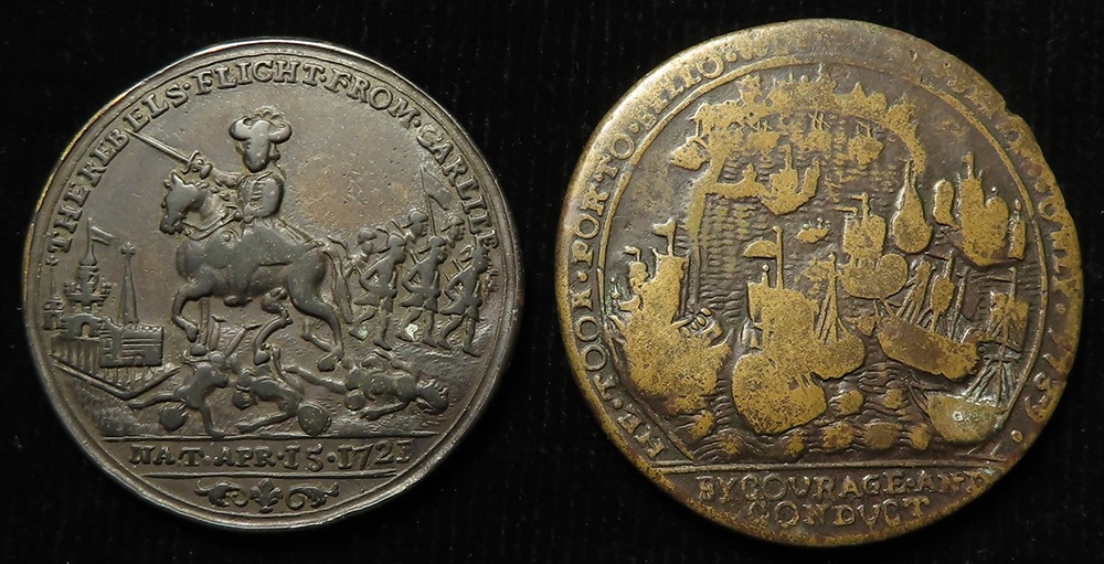 British Commemorative Medals (2) 18thC crude brass cast types: Admiral Vernon 'Took Porto Bello with Six Ships Only' d.36mm fair/Fine, and Duke of Cumberland re-capture of Carlisle (Jacobite Rebellion) d.34mm, nVF for type.