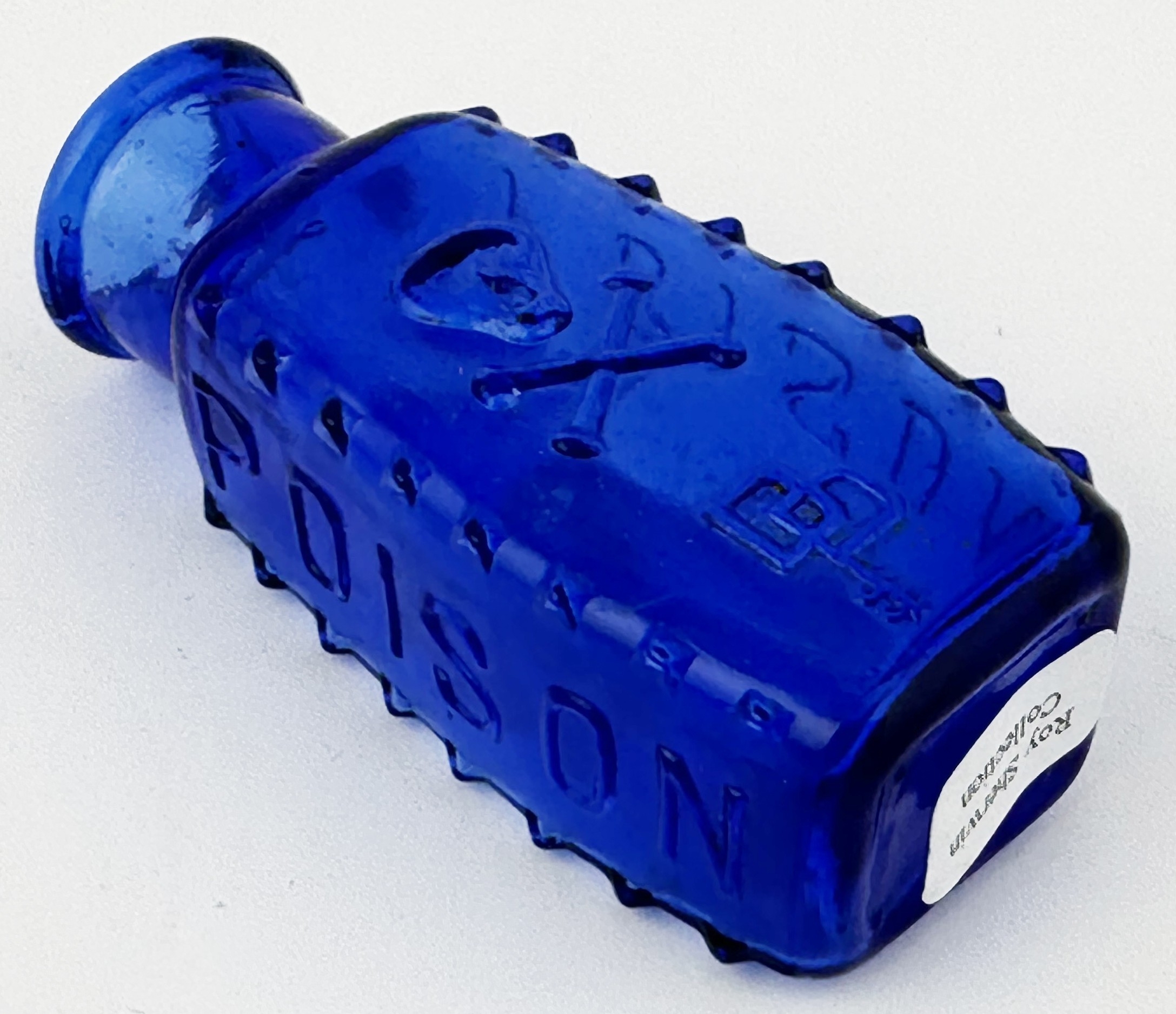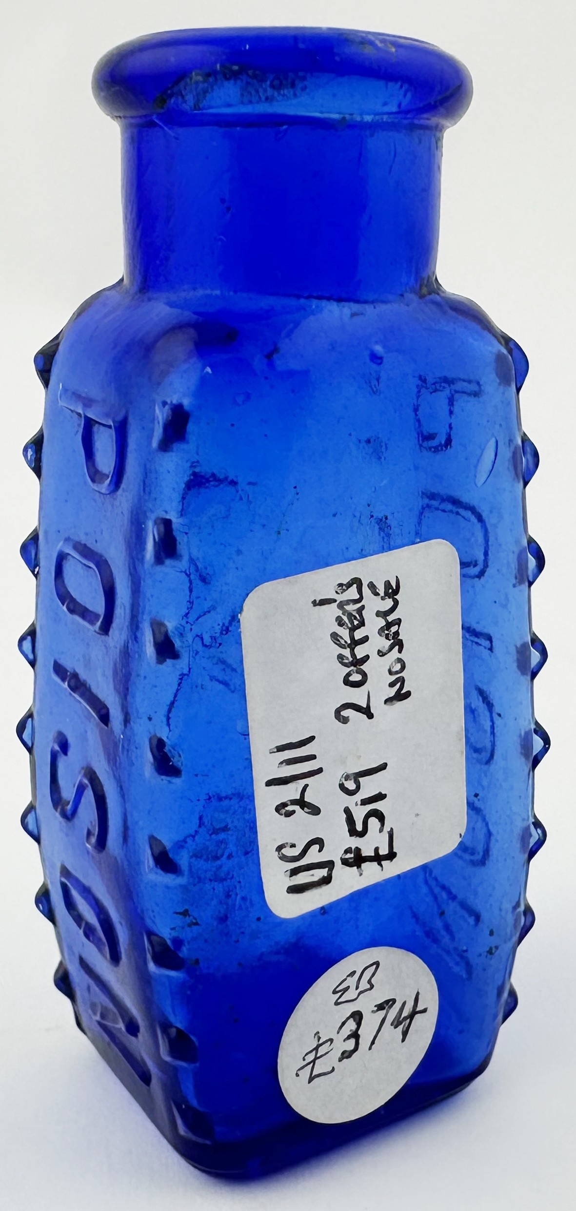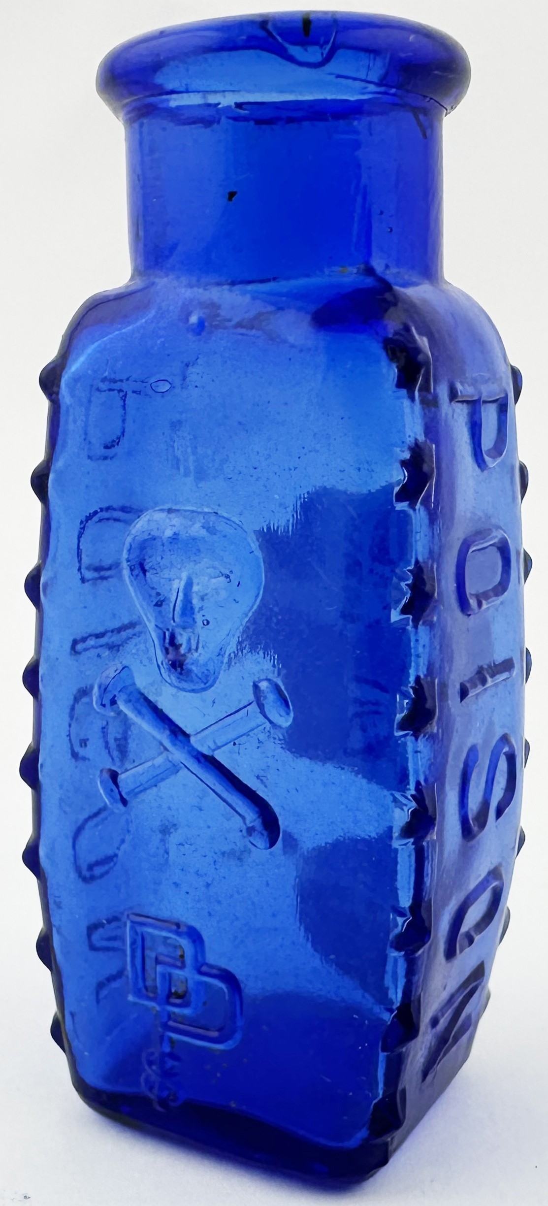 AMERICAN COFFIN POISON. (KU-8). 2.9ins tall. Cobalt blue glass, wide mouth, round lip. Skull & crossbones one side, DP below (maker), raised dots to all 4 corners, POISON heavily embossed down each side. Roy Sherwin Collection. A really attractive, c. 1890, bottle, rarely seen in the UK.