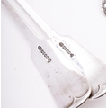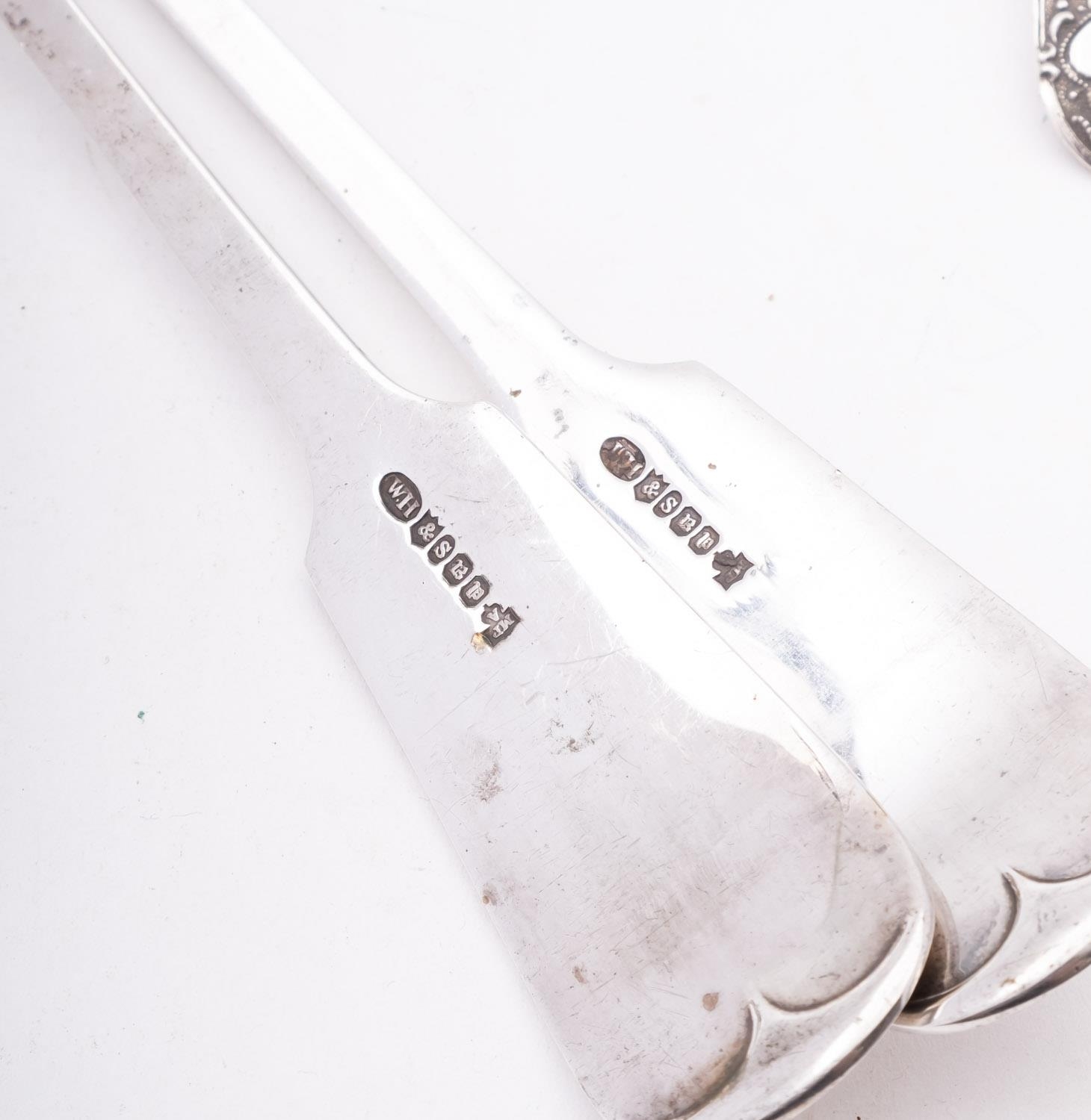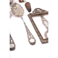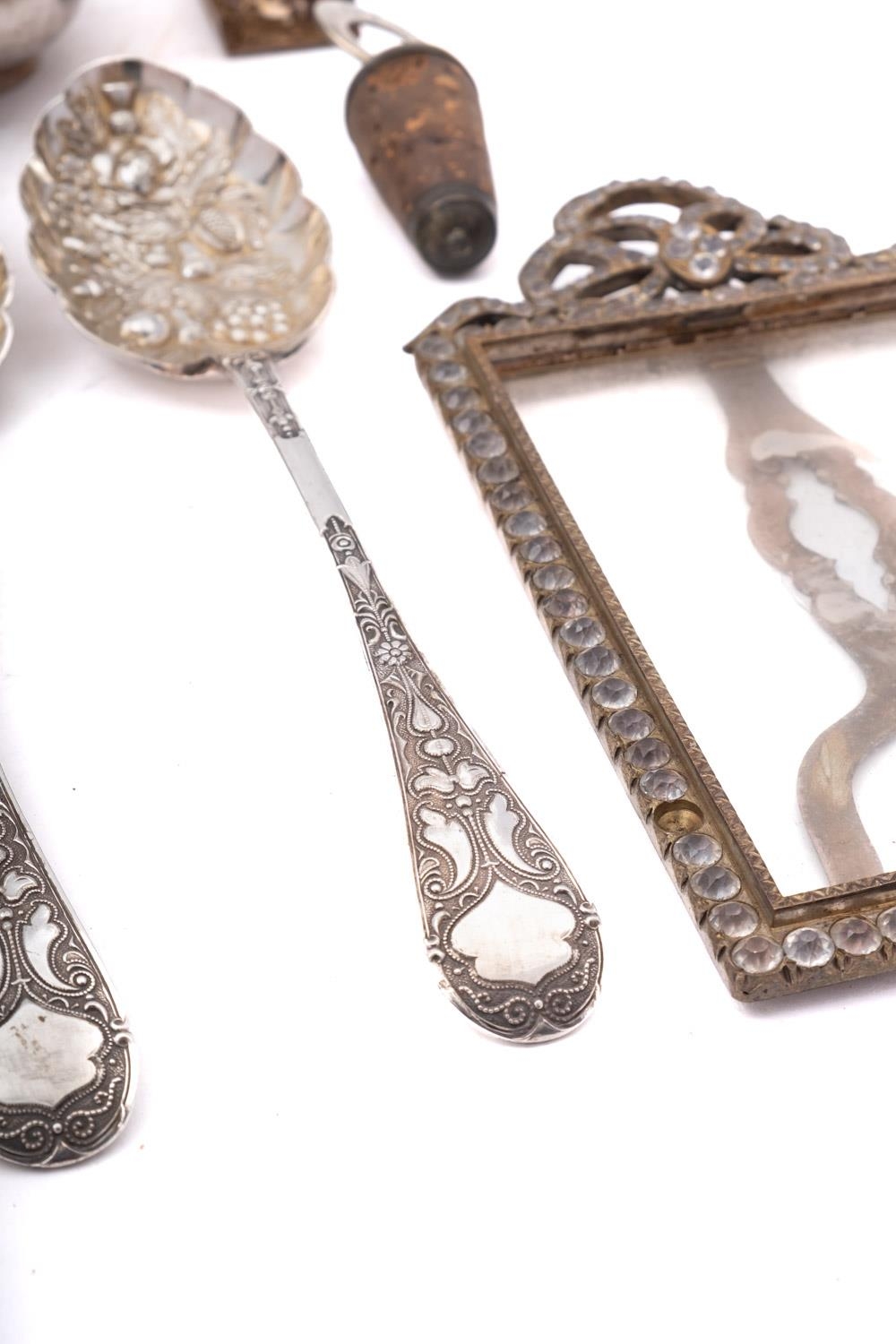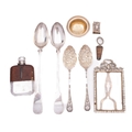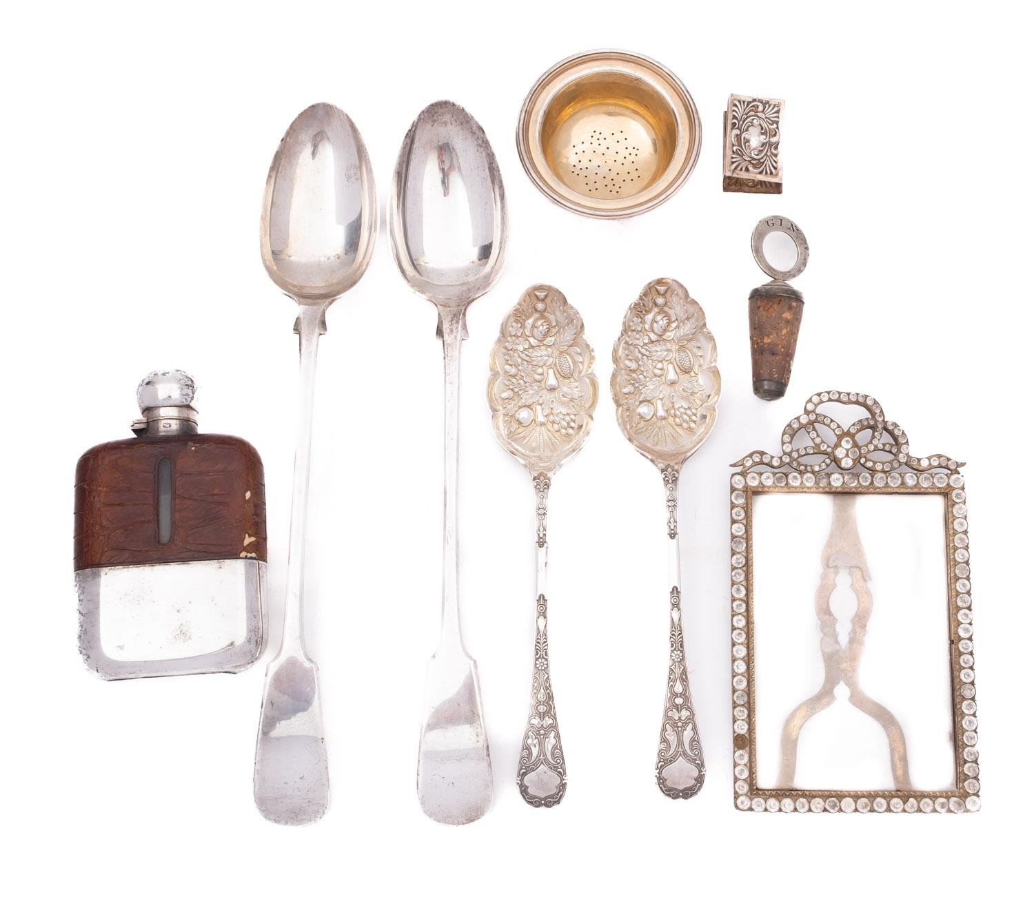 A mixed group of silver including; a part leather and glass hip flask by James Dixon & Sons, a pair of serving spoons, a pair of berry spoons, a Gin bottle stopper, a paste set silver plated frame, the top of a wine funnel and a match box cover,(9)