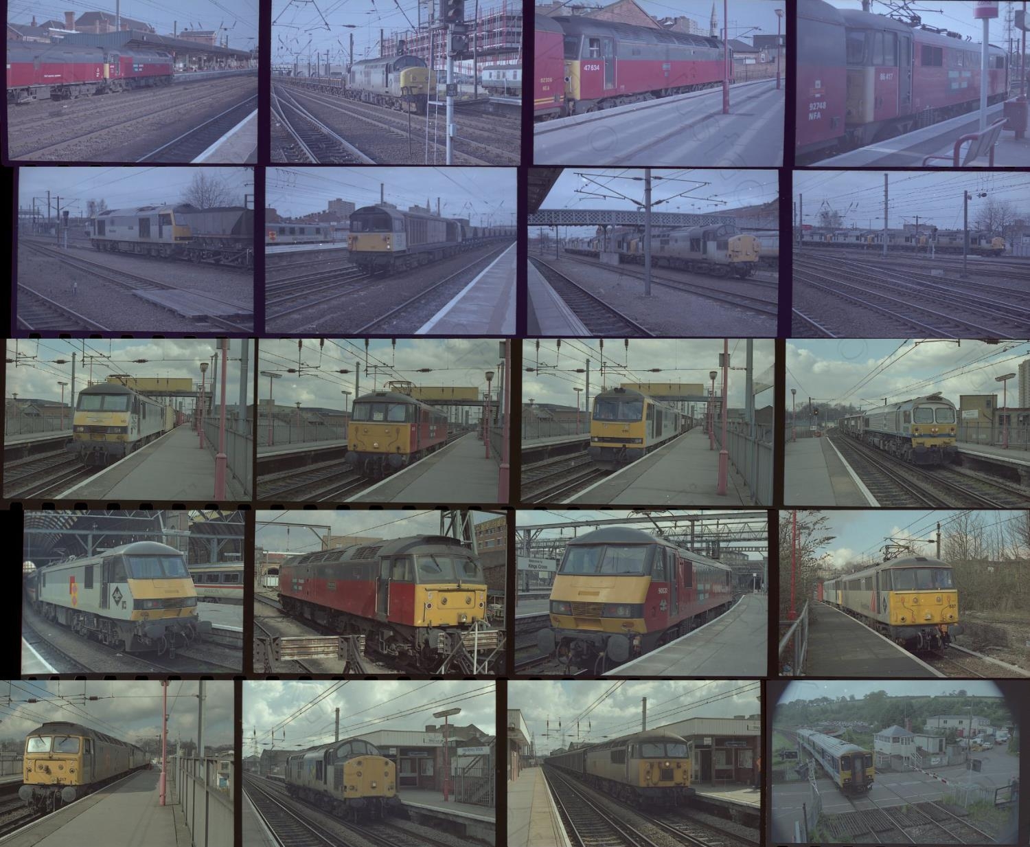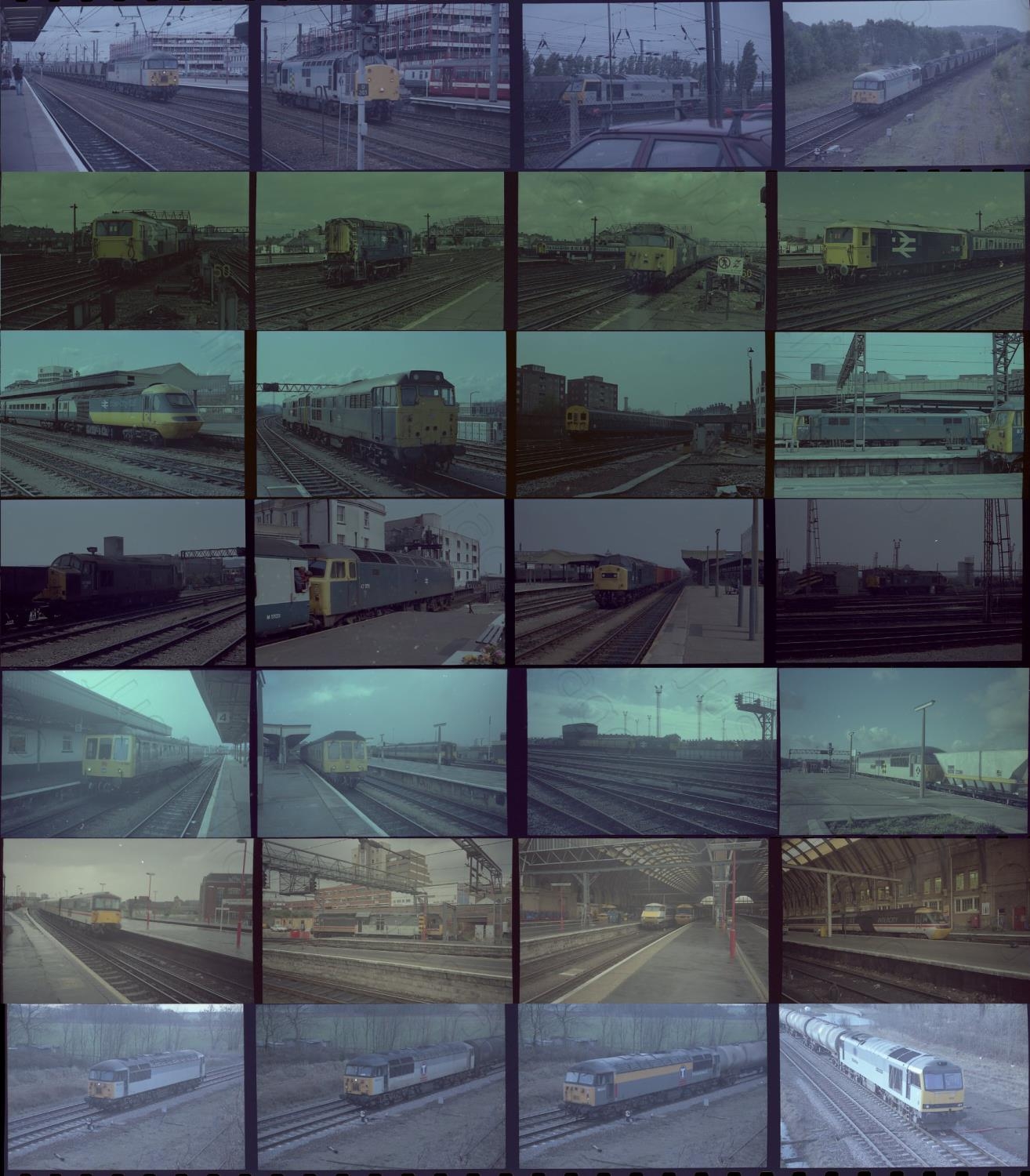 Railway. Modern Traction. A selection of approx. 300 x 35mm colour negatives, mostly in strips of 4, stored in protective sleeves. The negatives are part of the late Steve Davies Archive. They date from the 1980's and 1990's and feature "Sectorisation" and "Rail Blue" locomotives, HST's and DMU's, taken around the U.K., including a few infrastructure as well. Locations include: Doncaster, Hackney Wick, Kensington, Kings Cross, Newport, Clapham, Cardiff, Bristol, Euston and others. All captioned on the sleeves and sold with copyright. Sample illustrated.